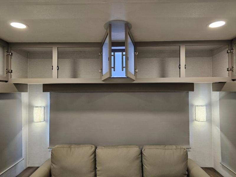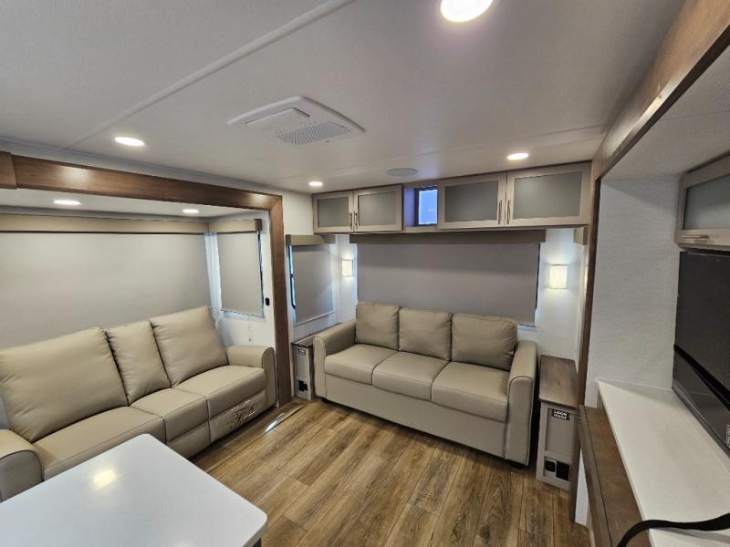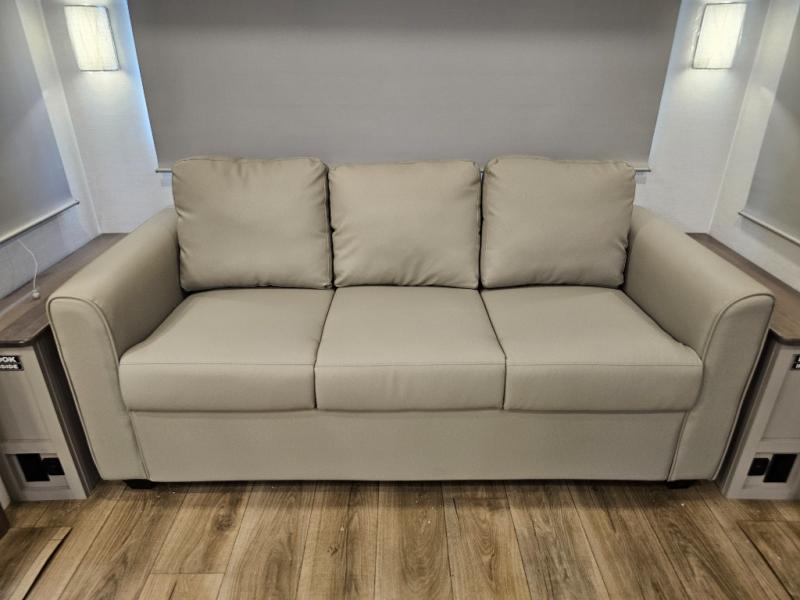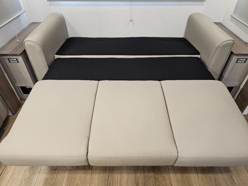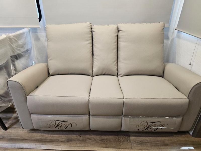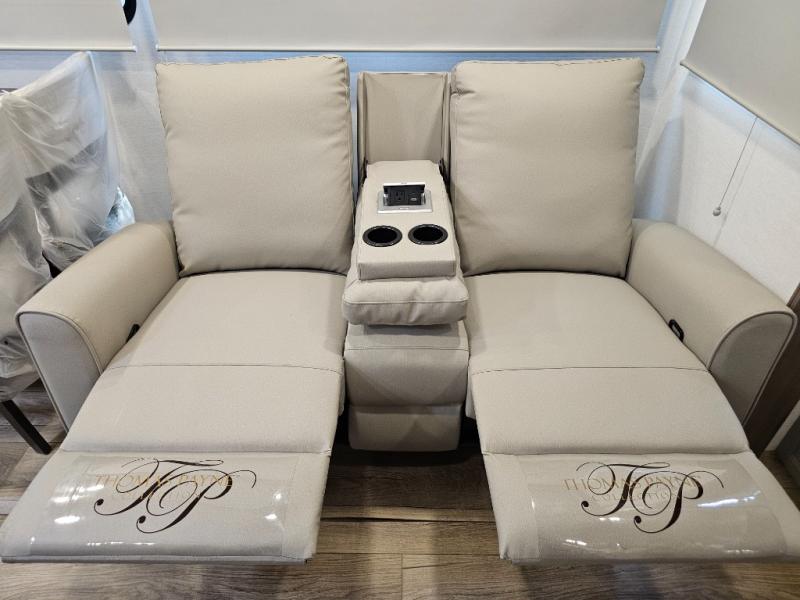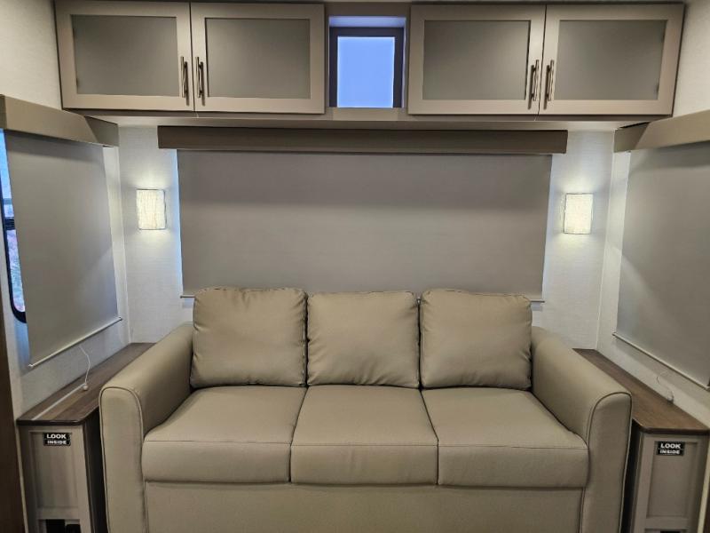 Rear Living Area: Includes a dual recliner theater seat and a full sleeper sofa for relaxing or hosting guests.
