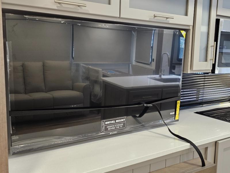 50" Class HDTV: Mounted on a swing arm with hidden storage behind for entertainment and clever storage space.