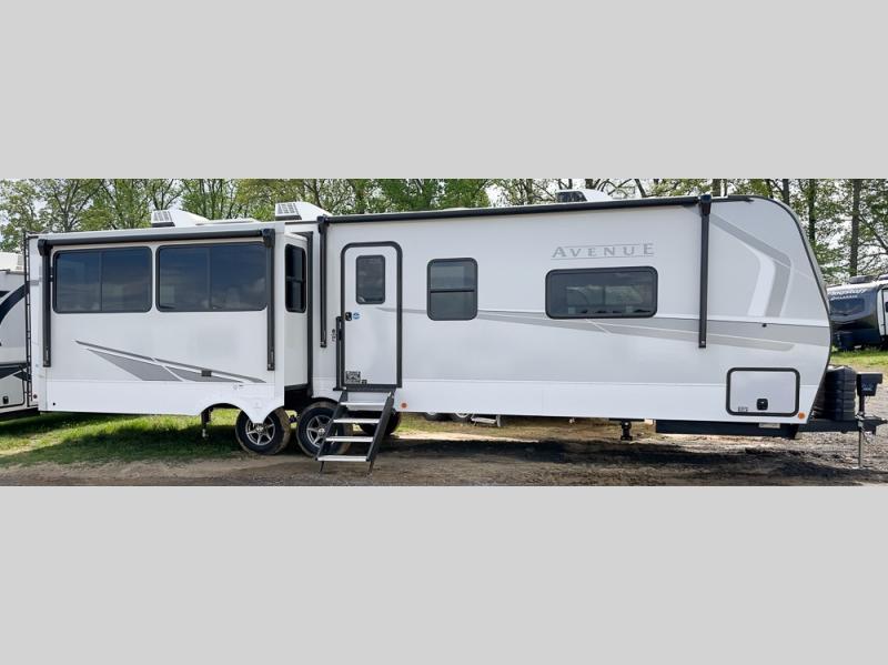 With any Avenue fifth wheel or travel trailer by Alliance RV, you will enjoy more interior space provided by the 8' 5" wide-body construction, and a long list of luxury features. Each is built with Azdel composite sidewalls both inside and out, along with a PVC roof for added strength. There are innovative storage solutions that include hidden storage behind the TV, within end tables and ottomans, and more. Since these units feature no carpet throughout, cleaning will be easier than ever, and there are flush floor slides throughout for seamless living spaces. The Avenue also comes with the OTG Solar Package with a 400 watt solar panel, inverter prep, multiple outlets, and more to keep you charged up!