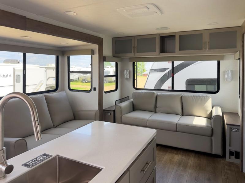 A kitchen island with countertop space makes it easy to prepare meals in this travel trailer! The floating dinette table has two chairs on one side and a movable ottoman with flip up storage on the other side to keep your games or extra table cloths in. You can store your dishes and snacks inside the hutch/pantry or in the second pantry. The front private bedroom has a queen bed slide but can be switched out for the optional king bed if you like. There is also a dresser and large wardrobe with shelving plus washer and dryer prep if you choose to add those appliances. The rear living area features a dual recliner theater seat across from an entertainment center with a 50" class HDTV with hidden storage behind it, and is also on a swing mount for all to see even at the rear sleeper sofa!