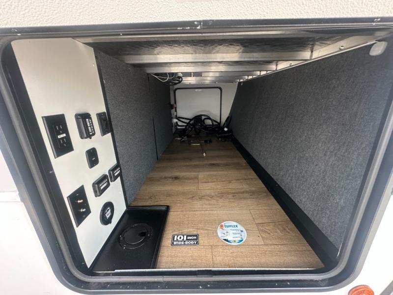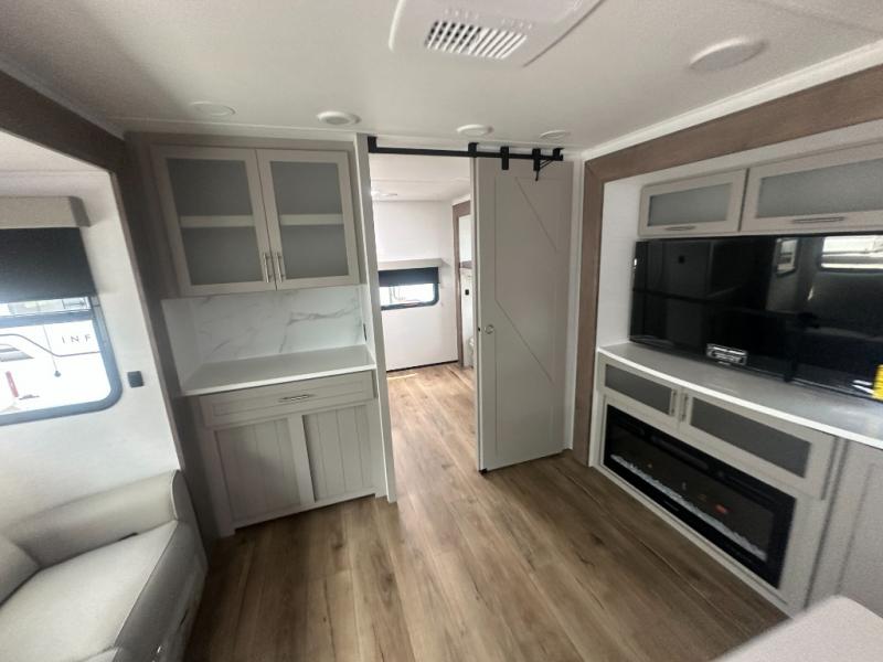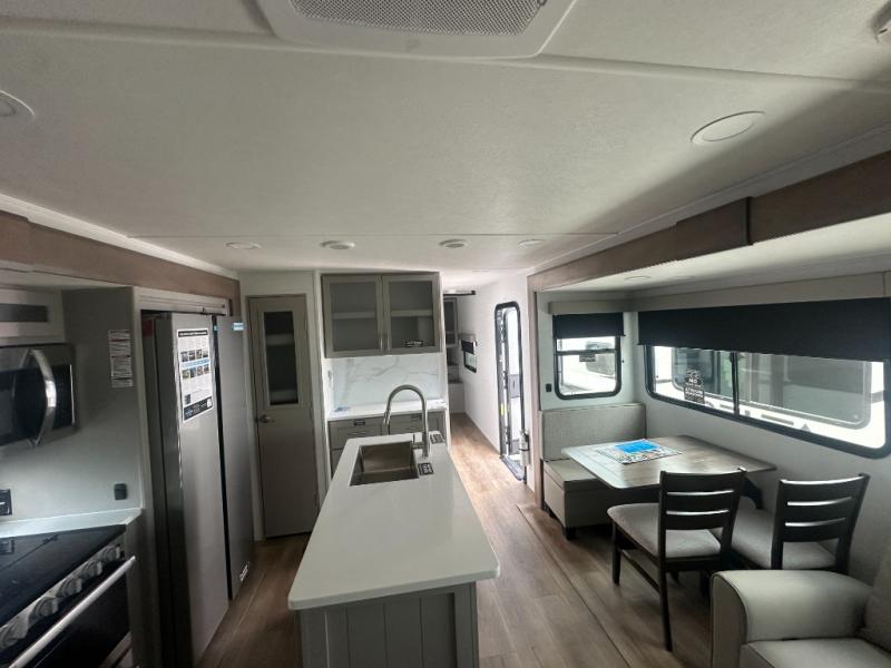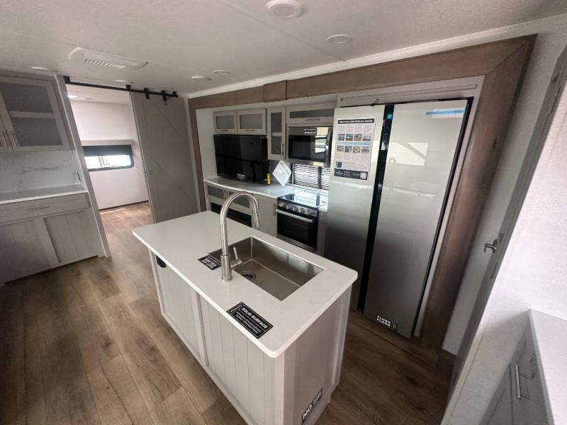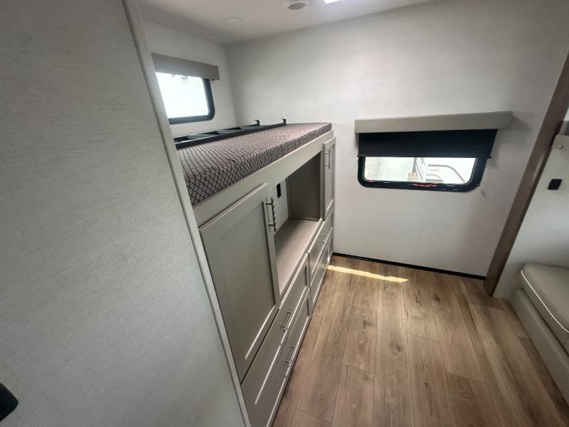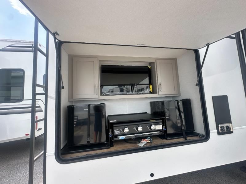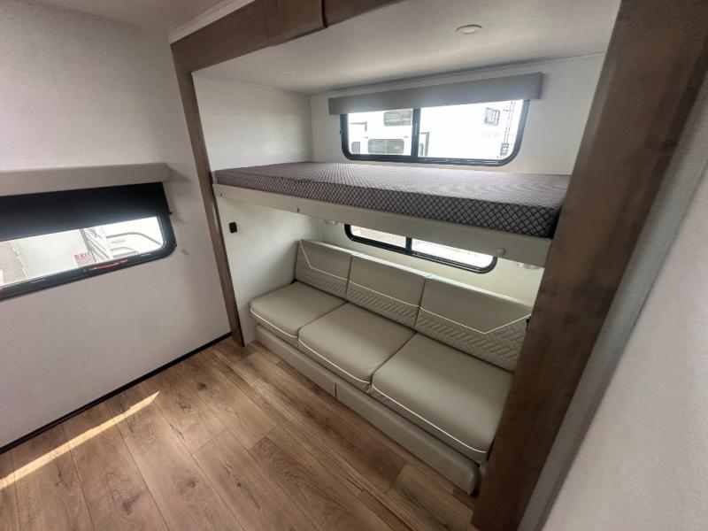 This travel trailer features a rear bunkhouse your guests or little ones are sure to love. There is a 40" x 72" bunk across from a slide out with a flip-up bunk above a cube sofa. There is also a tri-fold sofa with a pull-out trundle bed for even more sleeping space. You will enjoy the front private bedroom all to yourselves with a queen bed and king bed option, dual nightstands, and a wardrobe with washer and dryer prep. The middle living area and kitchen includes dual opposing slides for more space, a kitchen island to prep meals, and a dual recliner theater seat across from the 50" HDTV for movie nights. If the weather is nice, you may just want to make it an outdoor movie night since there is a 40" exterior TV!