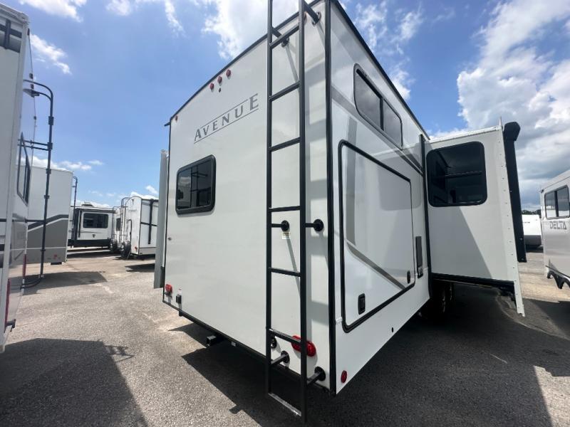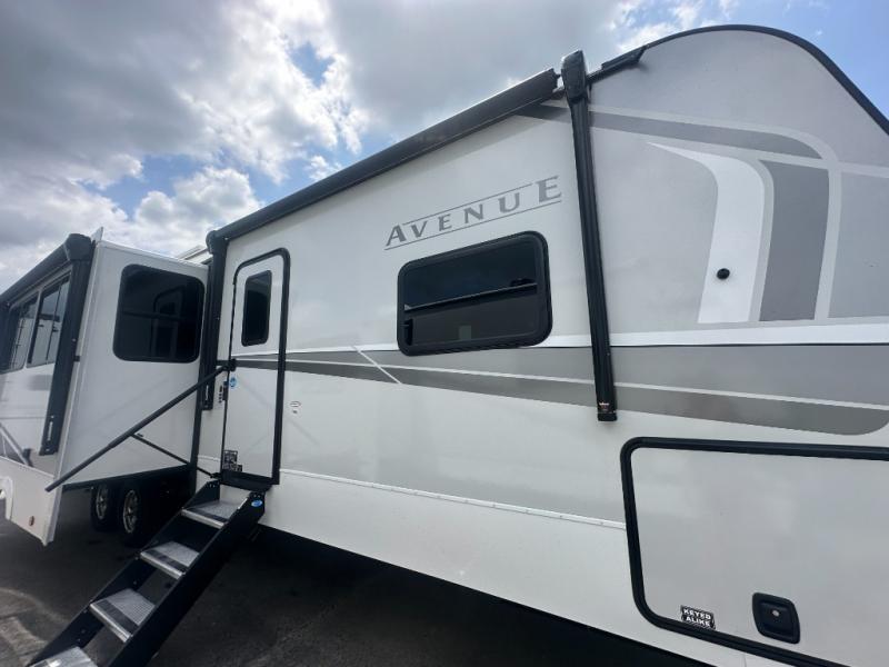 With any Avenue fifth wheel or travel trailer by Alliance RV, you will enjoy more interior space provided by the 8' 5" wide-body construction, and a long list of luxury features. Each is built with Azdel composite sidewalls both inside and out, along with a PVC roof for added strength. There are innovative storage solutions that include hidden storage behind the TV, within end tables and ottomans, and more. Since these units feature no carpet throughout, cleaning will be easier than ever, and there are flush floor slides throughout for seamless living spaces. The Avenue also comes with the OTG Solar Package with a 400 watt solar panel, inverter prep, multiple outlets, and more to keep you charged up!