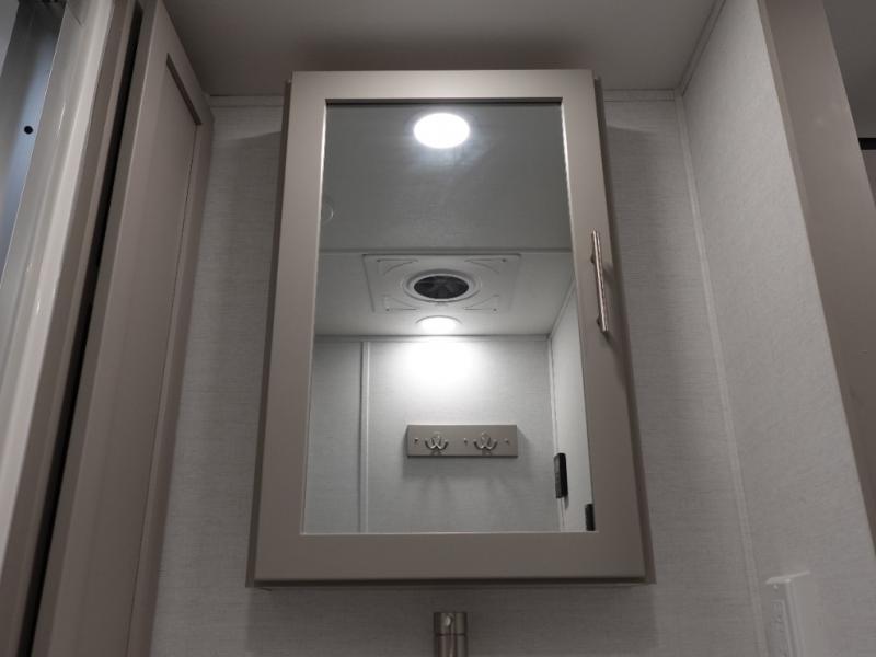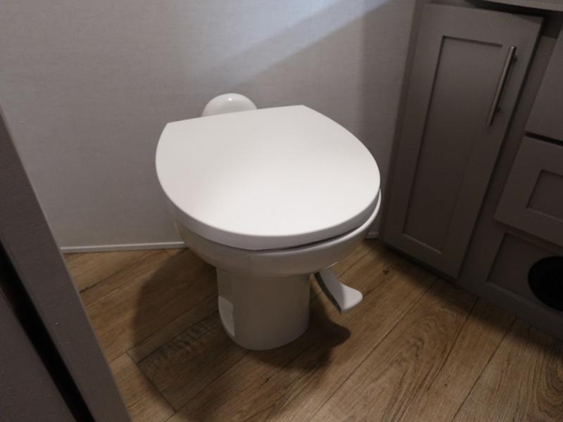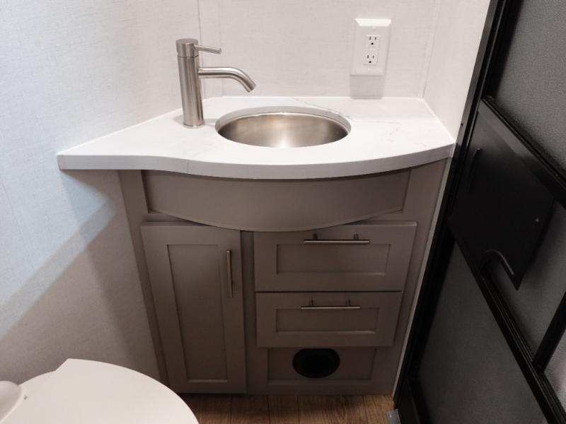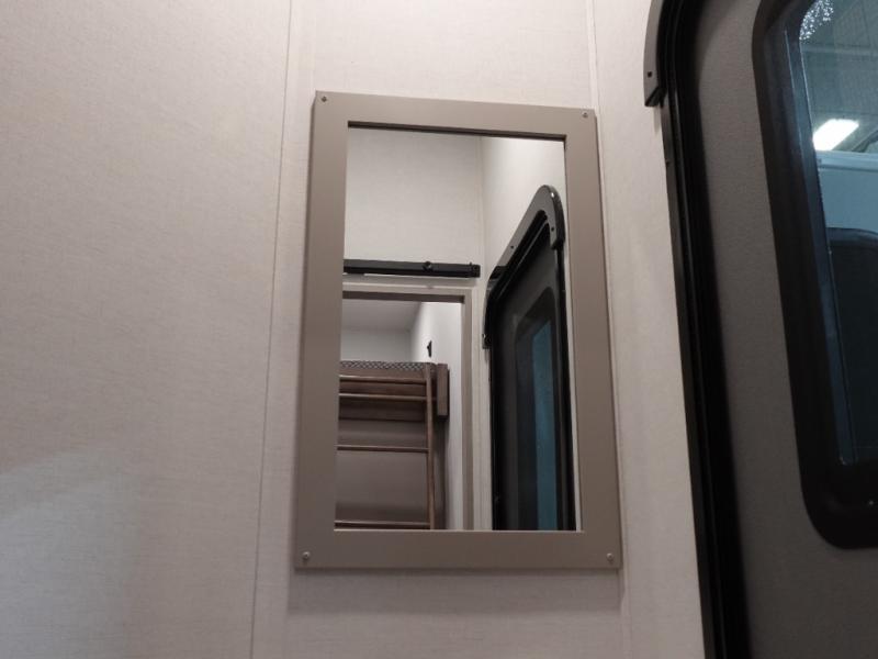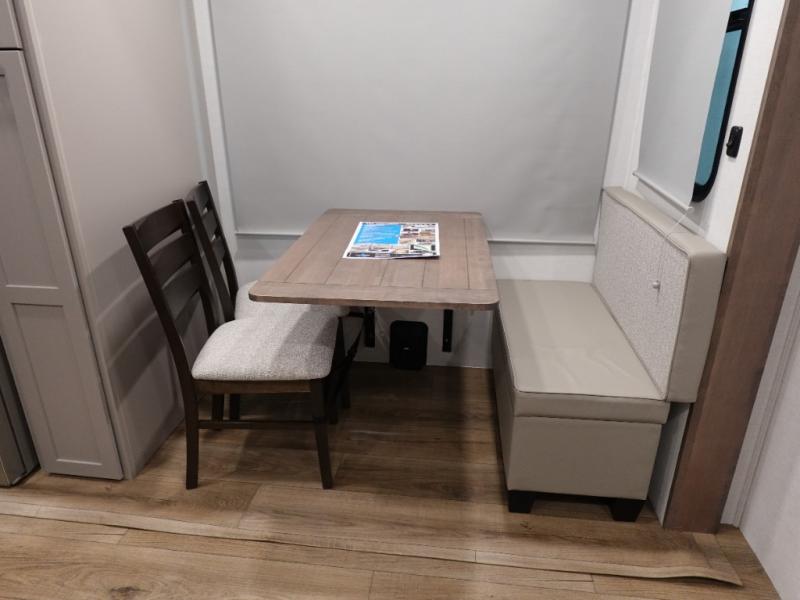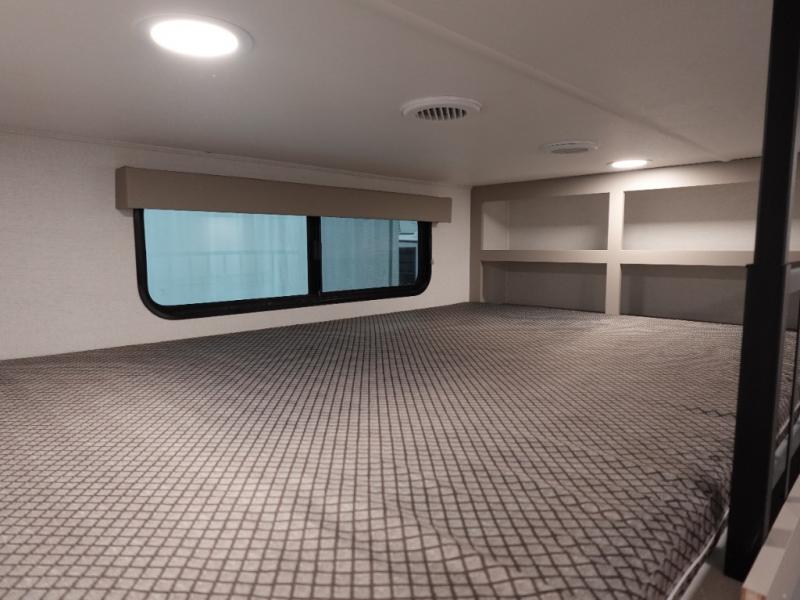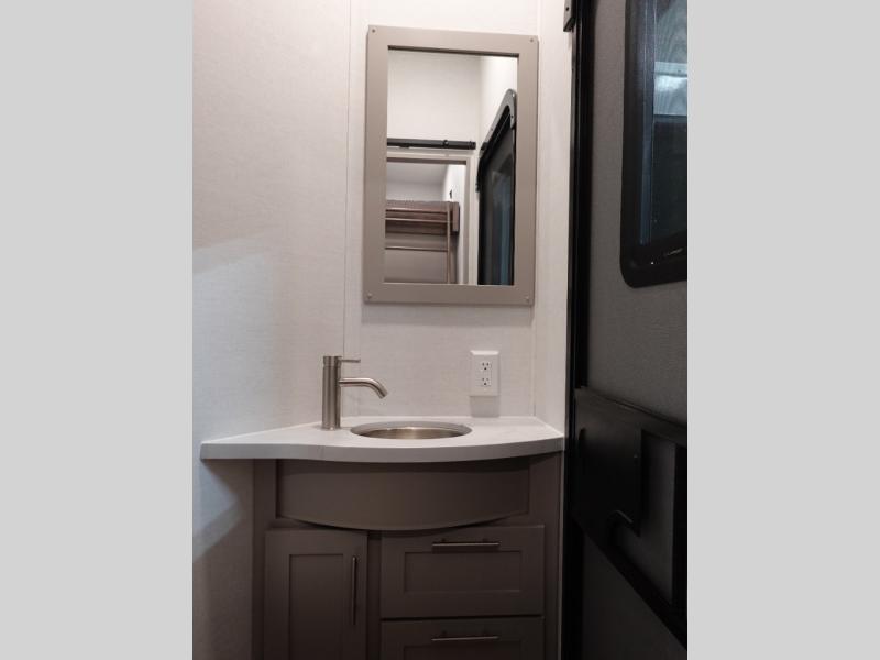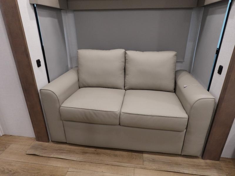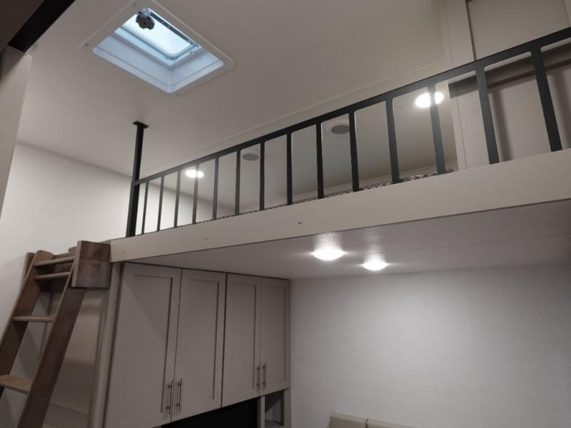 The whole gang can join in on the fun in this fifth wheel! The rear private 54" x 74" loft bed features a lower 60" x 70" bed beneath with storage and a TV, and its very own half bathroom with private entry/exit to the outside. There is also an exterior baggage door so you can easily pack gear straight into this room. The living area comes with dual recliner theater seating, a swing out 50" class HDTV, and a floating dinette table with two chairs and a movable ottoman with flip up storage. There is also a 16 cu. ft. 12 volt refrigerator and pull-out pantry here for food storage. And you can easily prepare your best home cooked meals using the three burner cooktop.