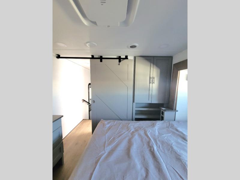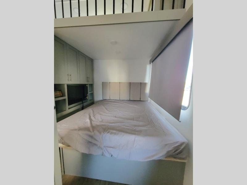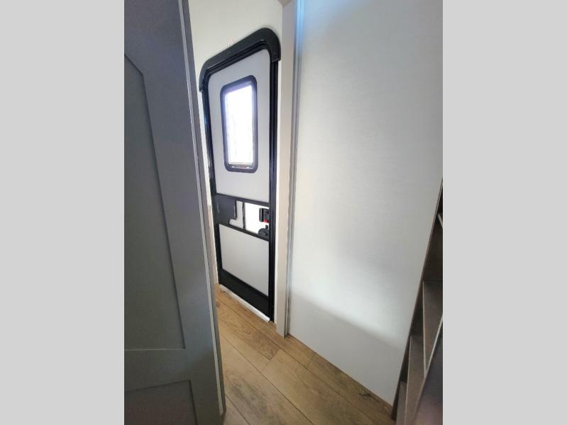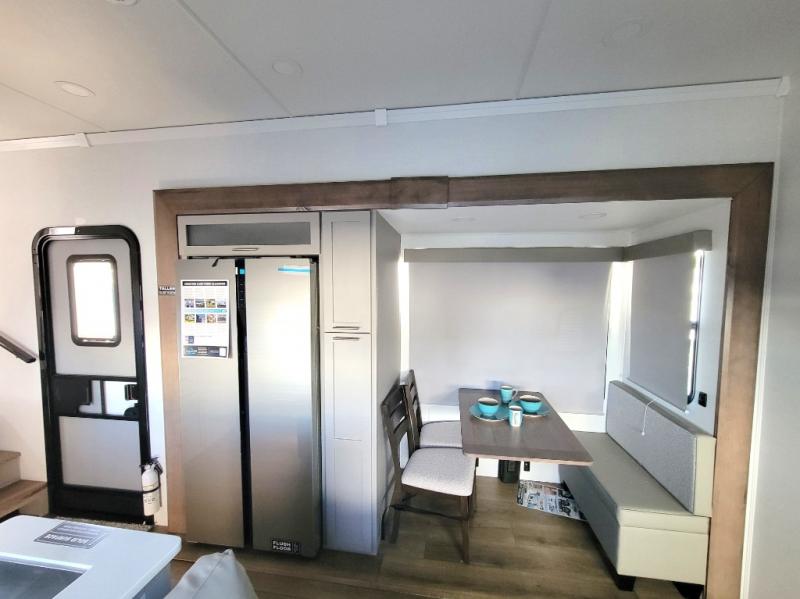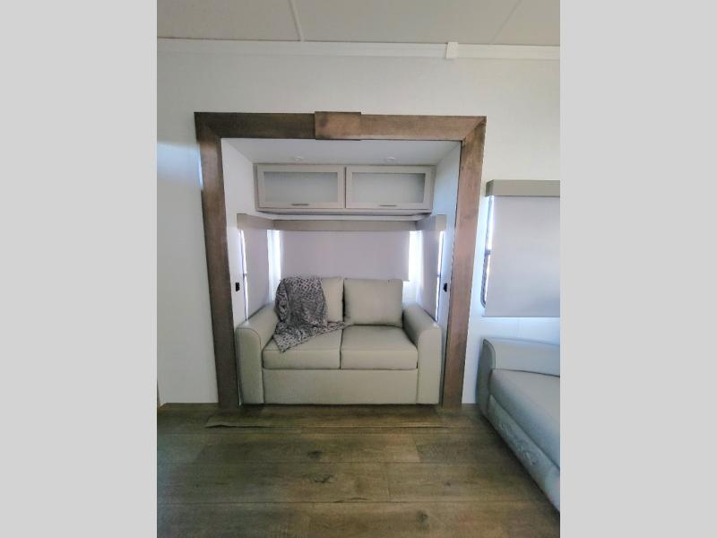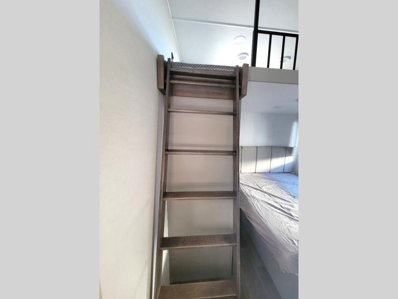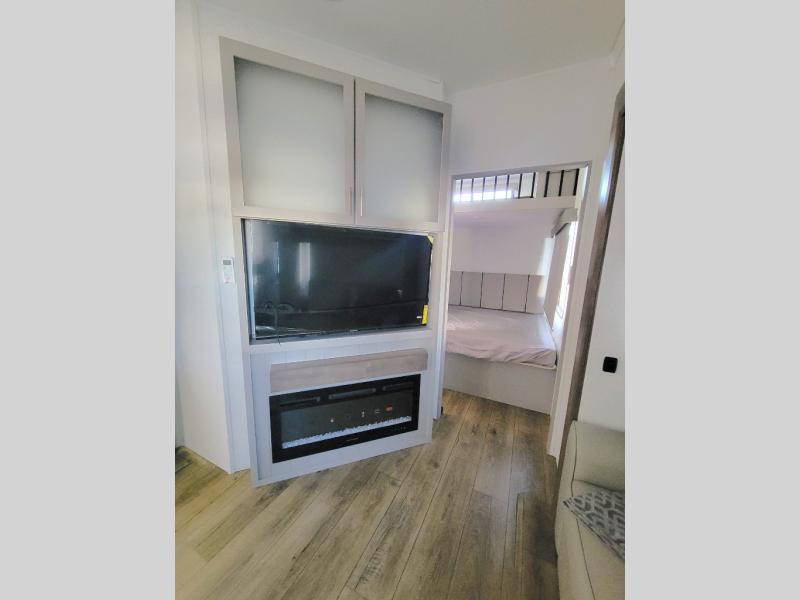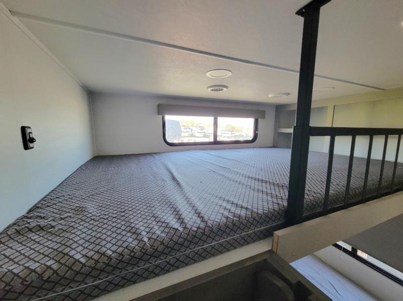The whole gang can join in on the fun in this fifth wheel! The rear private 54" x 74" loft bed features a lower 60" x 70" bed beneath with storage and a TV, and its very own half bathroom with private entry/exit to the outside. There is also an exterior baggage door so you can easily pack gear straight into this room. The living area comes with dual recliner theater seating, a swing out 50" class HDTV, and a floating dinette table with two chairs and a movable ottoman with flip up storage. There is also a 16 cu. ft. 12 volt refrigerator and pull-out pantry here for food storage. And you can easily prepare your best home cooked meals using the three burner cooktop. When you're ready to wind down your night, head to the front private bedroom and relax on the queen bed slide which could be switched out for the optional king bed if you like! This unit also features an outdoor griddle and refrigerator under the loft space.