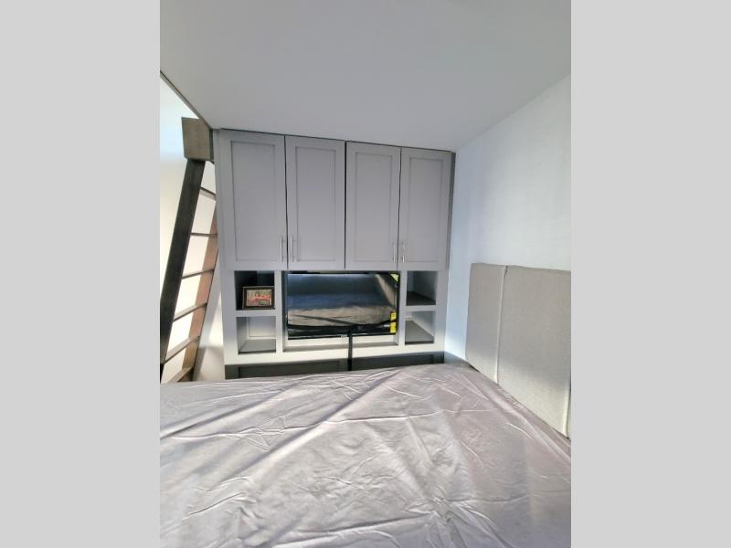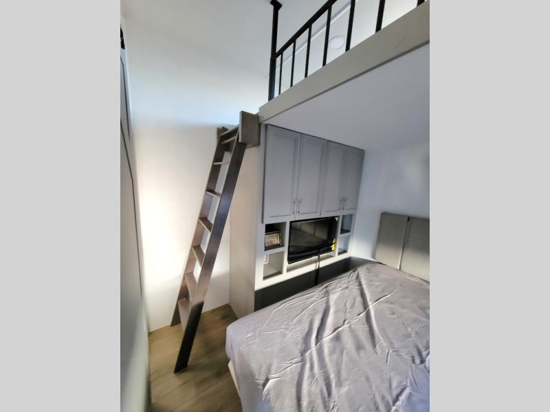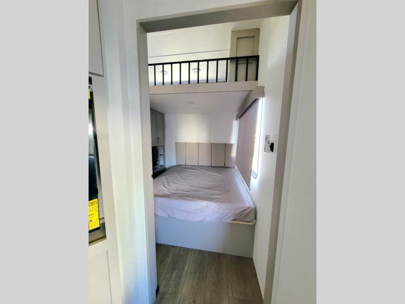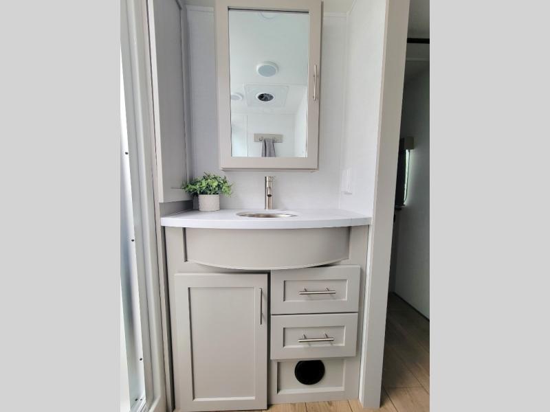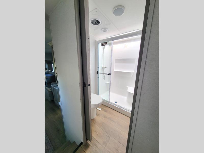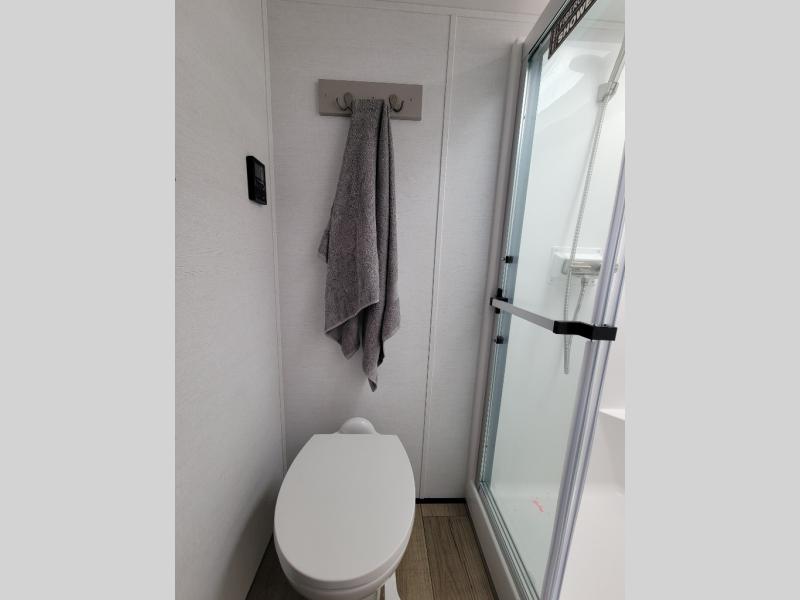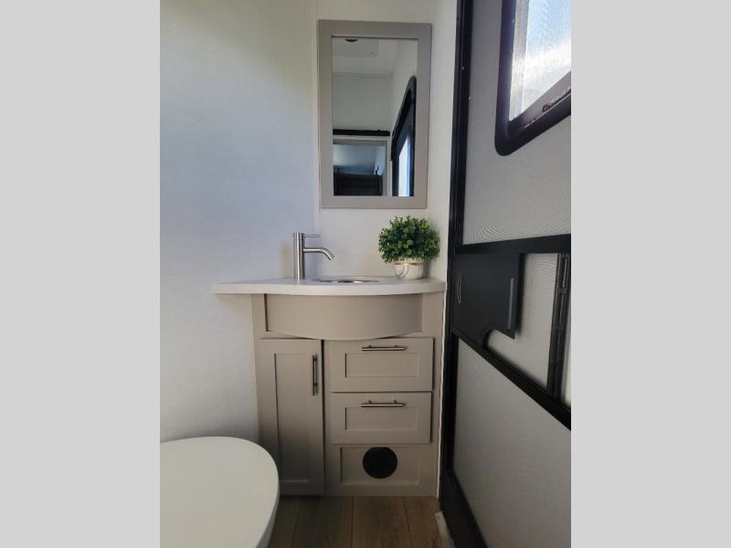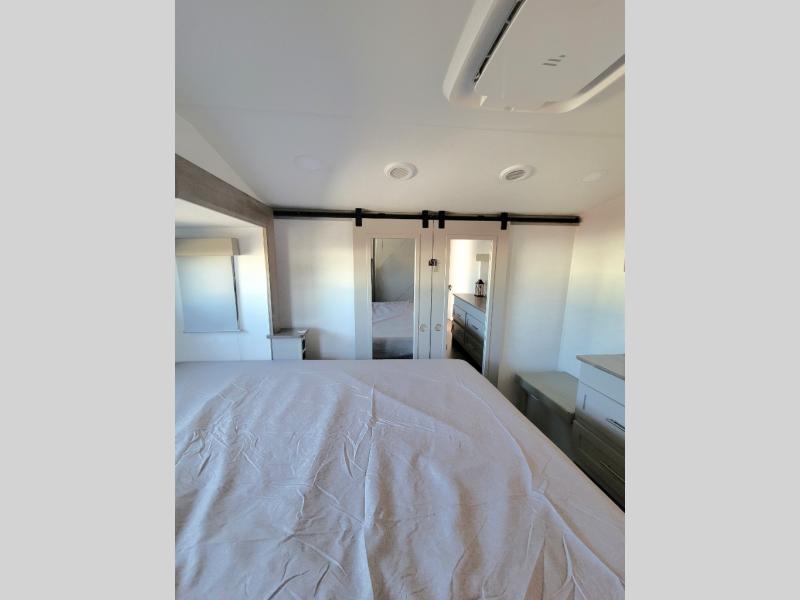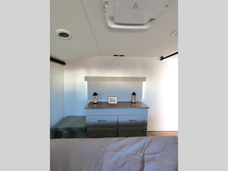 The whole gang can join in on the fun in this fifth wheel! The rear private 54" x 74" loft bed features a lower 60" x 70" bed beneath with storage and a TV, and its very own half bathroom with private entry/exit to the outside. There is also an exterior baggage door so you can easily pack gear straight into this room. The living area comes with dual recliner theater seating, a swing out 50" class HDTV, and a floating dinette table with two chairs and a movable ottoman with flip up storage. There is also a 16 cu. ft. 12 volt refrigerator and pull-out pantry here for food storage. And you can easily prepare your best home cooked meals using the three burner cooktop. When you're ready to wind down your night, head to the front private bedroom and relax on the queen bed slide which could be switched out for the optional king bed if you like! This unit also features an outdoor griddle and refrigerator under the loft space.