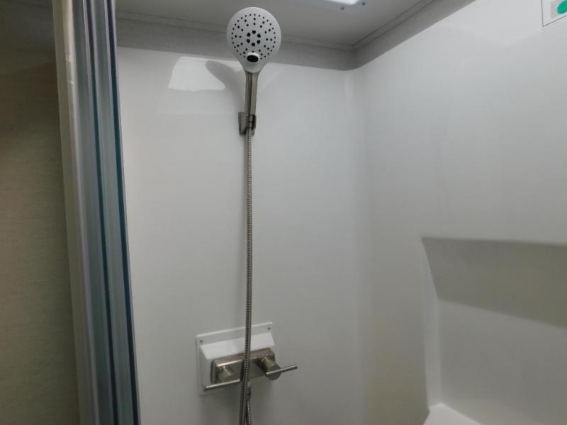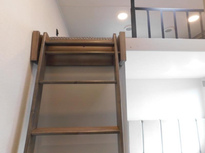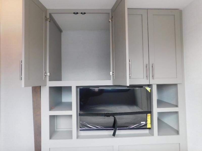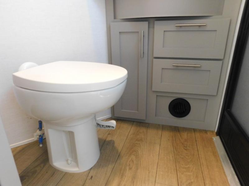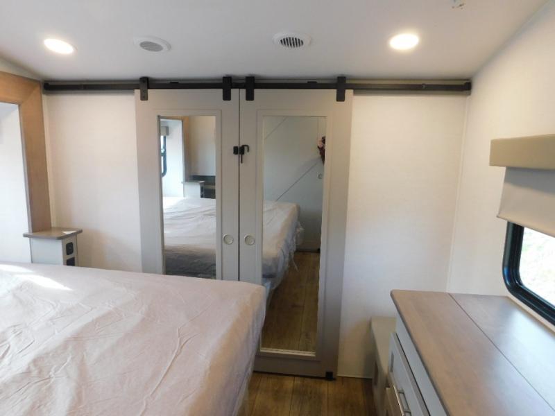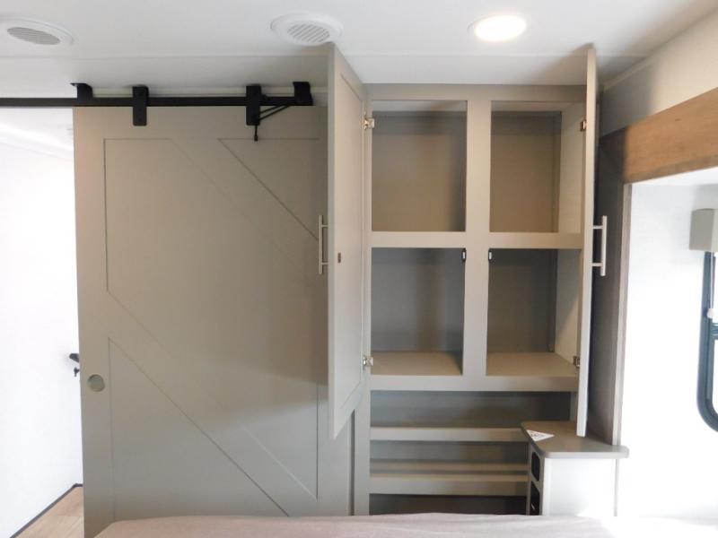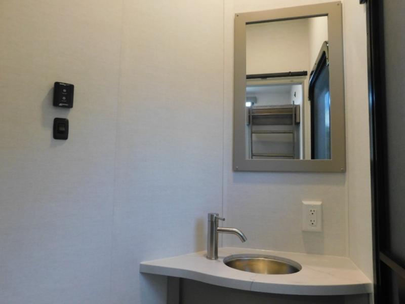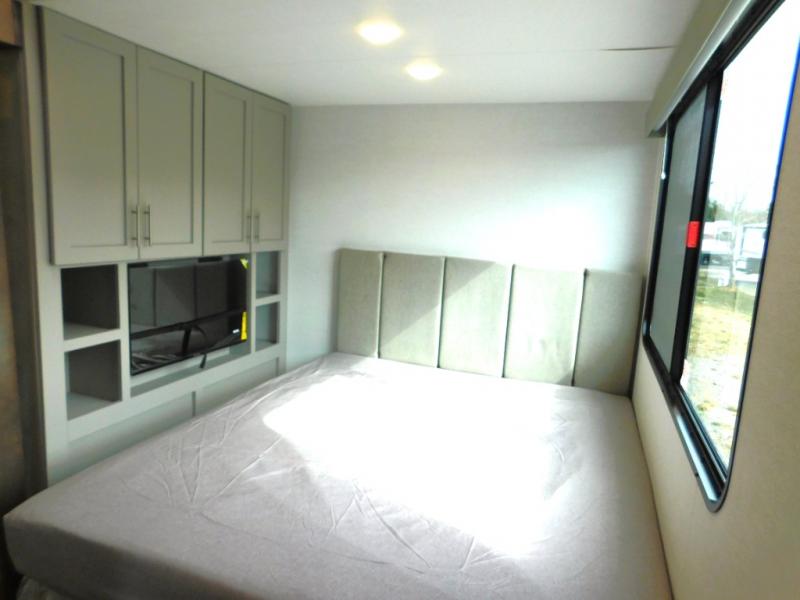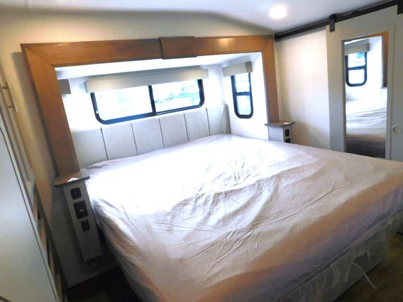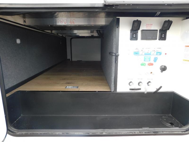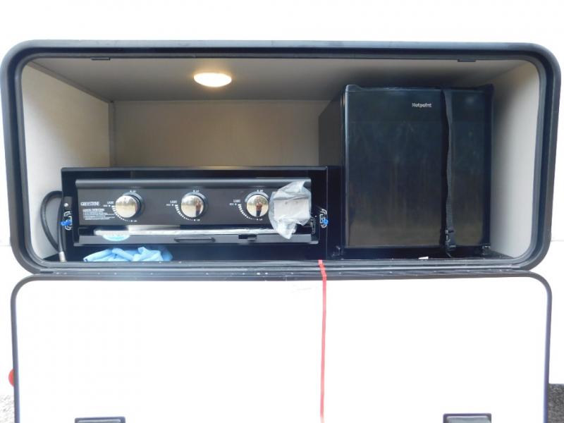 The whole gang can join in on the fun in this fifth wheel! The rear private 54" x 74" loft bed features a lower 60" x 70" bed beneath with storage and a TV, and its very own half bathroom with private entry/exit to the outside. There is also an exterior baggage door so you can easily pack gear straight into this room. The living area comes with dual recliner theater seating, a swing out 50" class HDTV, and a floating dinette table with two chairs and a movable ottoman with flip up storage. There is also a 16 cu. ft. 12 volt refrigerator and pull-out pantry here for food storage. And you can easily prepare your best home cooked meals using the three burner cooktop. When you're ready to wind down your night, head to the front private bedroom and relax on the queen bed slide which could be switched out for the optional king bed if you like! This unit also features an outdoor griddle and refrigerator under the loft space.