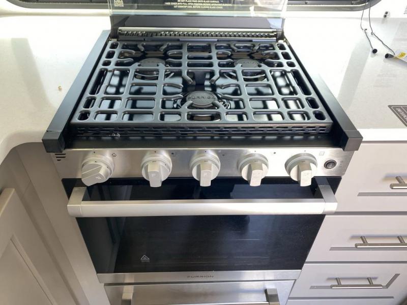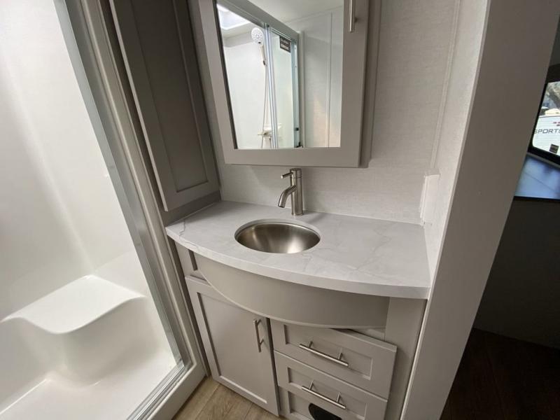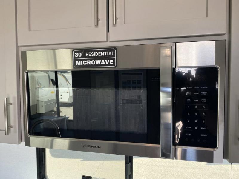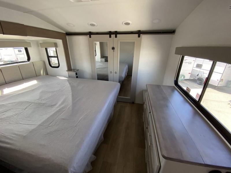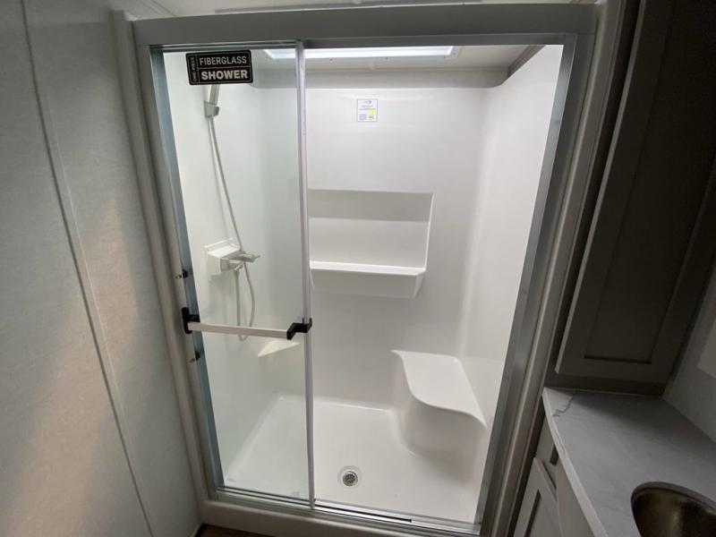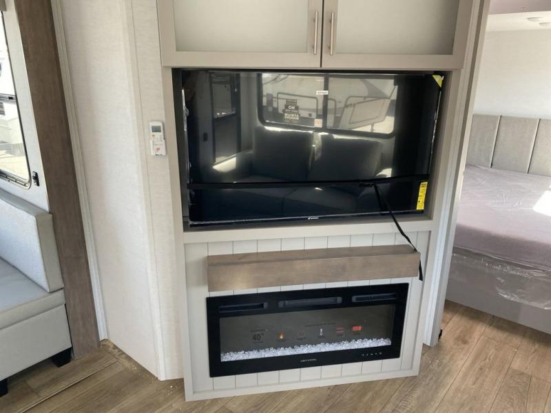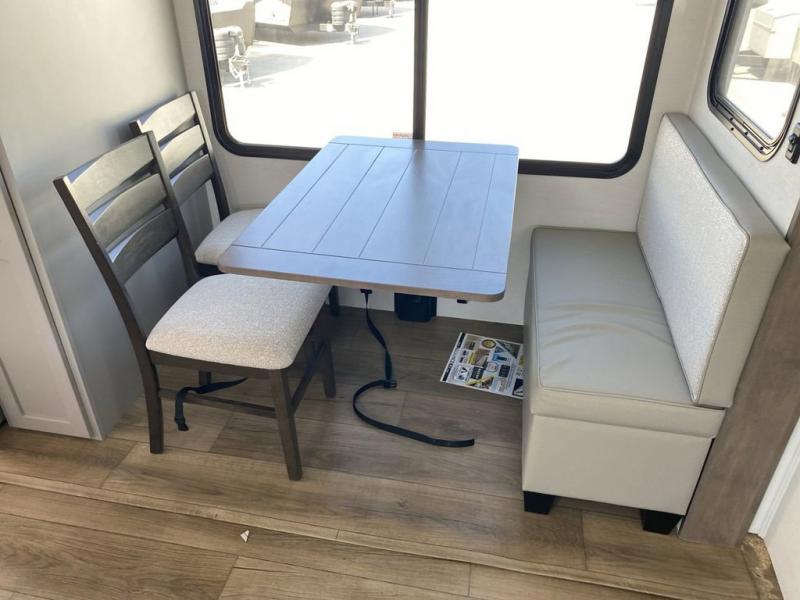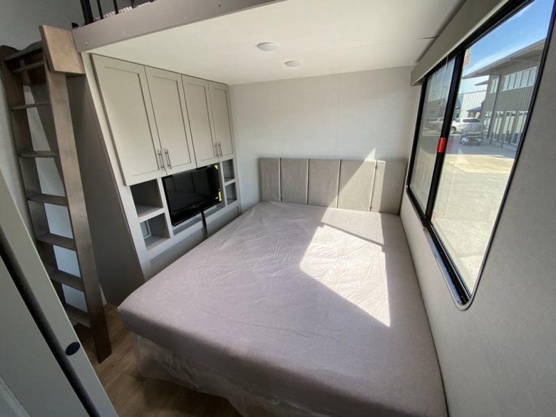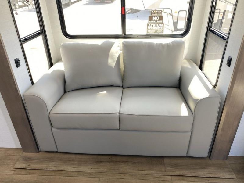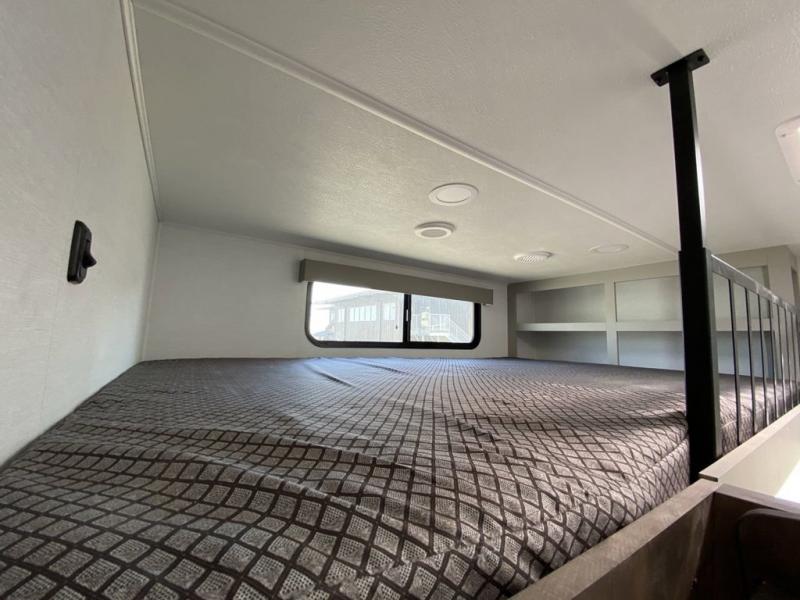 The whole gang can join in on the fun in this fifth wheel! The rear private 54" x 74" loft bed features a lower 60" x 70" bed beneath with storage and a TV, and its very own half bathroom with private entry/exit to the outside. There is also an exterior baggage door so you can easily pack gear straight into this room. The living area comes with dual recliner theater seating, a swing out 50" class HDTV, and a floating dinette table with two chairs and a movable ottoman with flip up storage. There is also a 16 cu. ft. 12 volt refrigerator and pull-out pantry here for food storage. And you can easily prepare your best home cooked meals using the three burner cooktop. When you're ready to wind down your night, head to the front private bedroom and relax on the queen bed slide which could be switched out for the optional king bed if you like! This unit also features an outdoor griddle and refrigerator under the loft space.