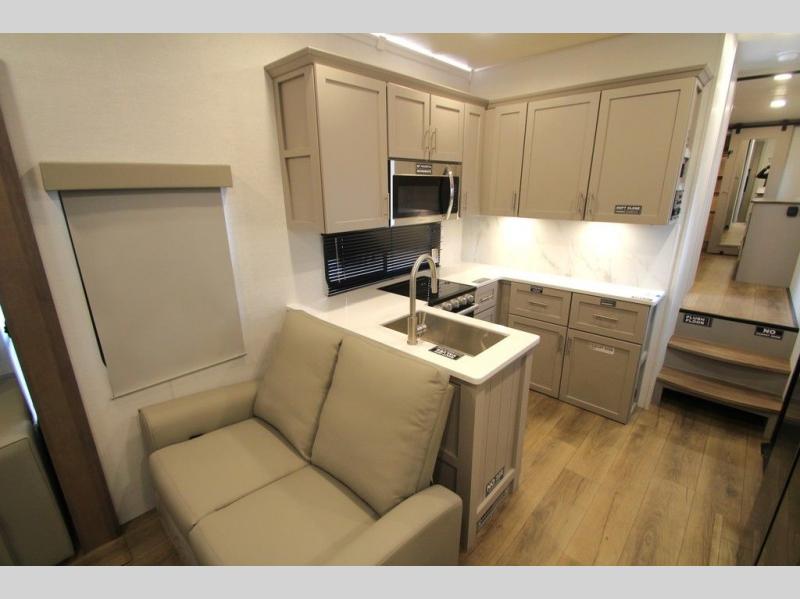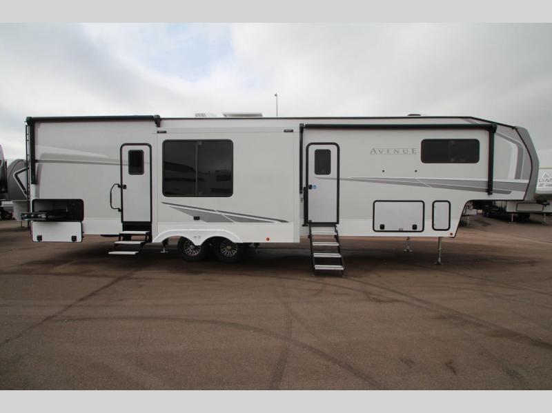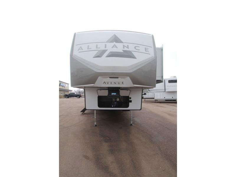 With any Avenue fifth wheel or travel trailer by Alliance RV, you will enjoy more interior space provided by the 8' 5" wide-body construction, and a long list of luxury features. Each is built with Azdel composite sidewalls both inside and out, along with a PVC roof for added strength. There are innovative storage solutions that include hidden storage behind the TV, within end tables and ottomans, and more. Since these units feature no carpet throughout, cleaning will be easier than ever, and there are flush floor slides throughout for seamless living spaces. The Avenue also comes with the OTG Solar Package with a 400 watt solar panel, inverter prep, multiple outlets, and more to keep you charged up!