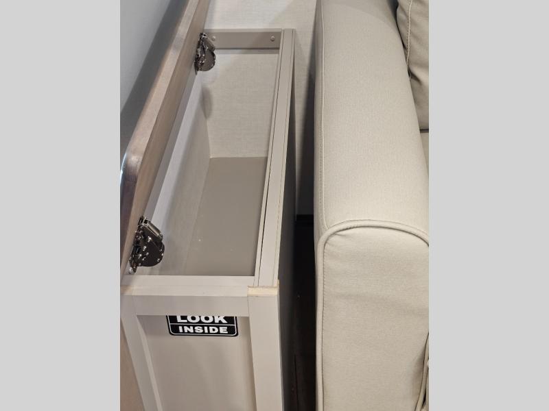Innovative hidden storage spaces throughout (behind the TV, in ottomans and end tables)
