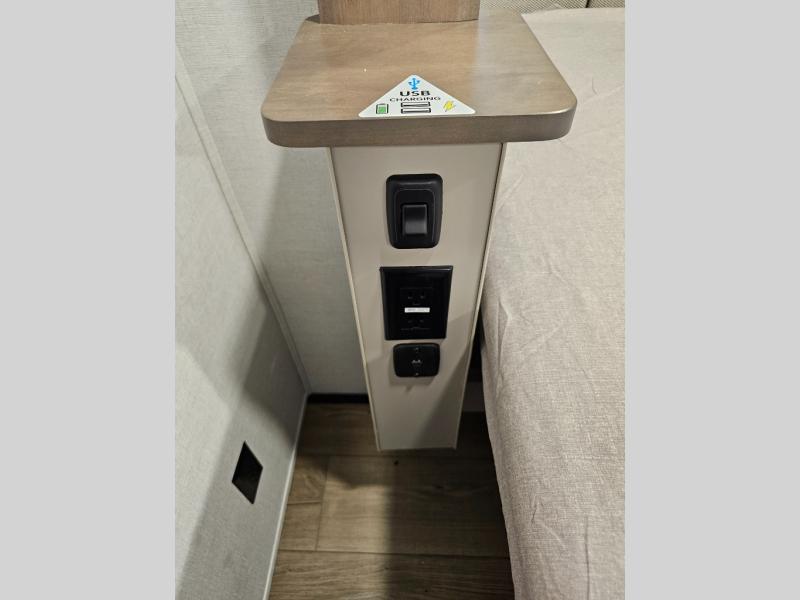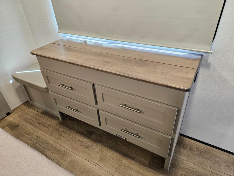 Primary Front Bedroom: Queen bed slide with optional king upgrade (INCLUDED), large wardrobe with washer/dryer prep, dresser, and bedside nightstands