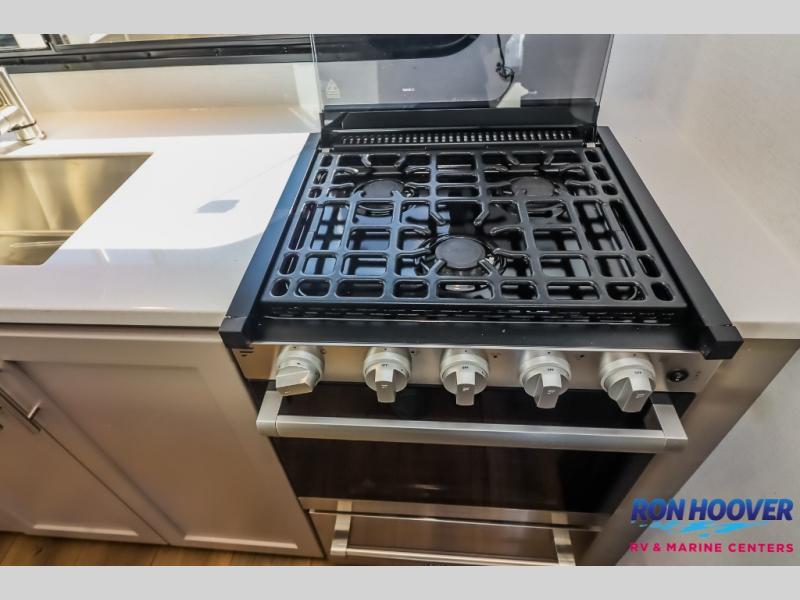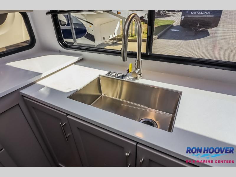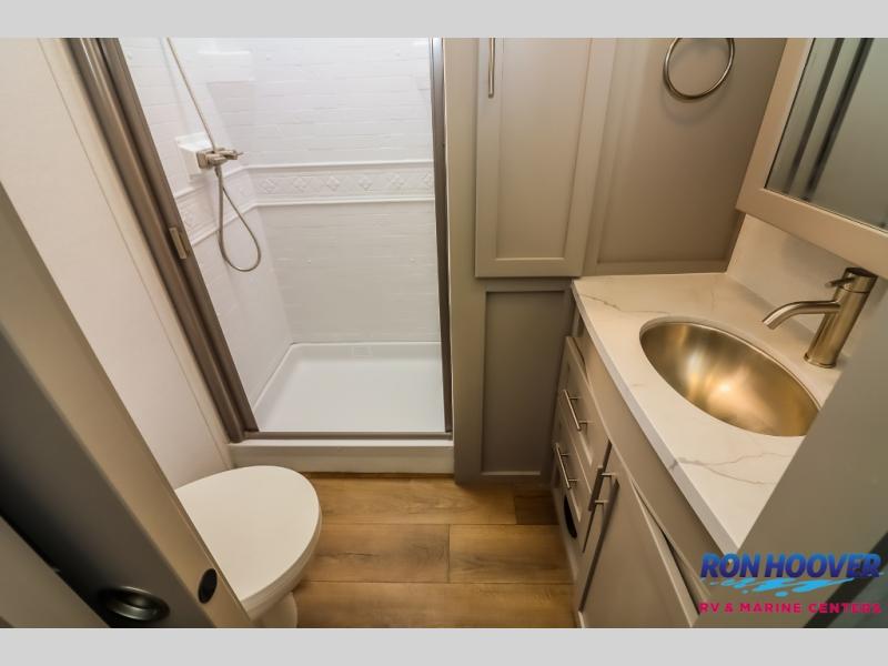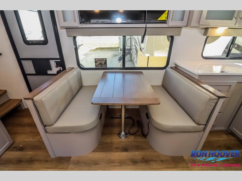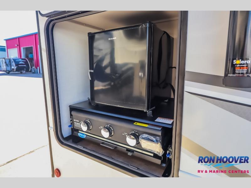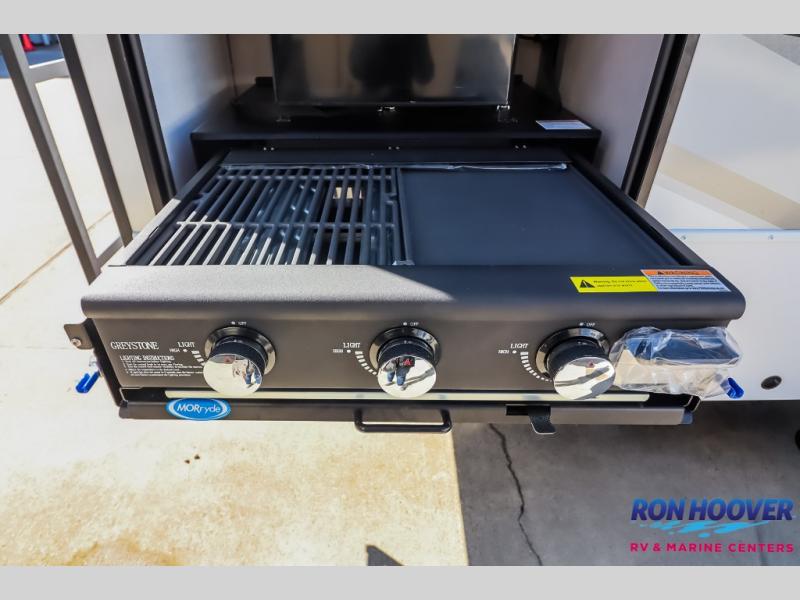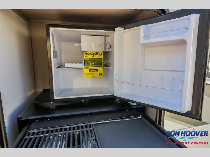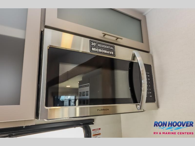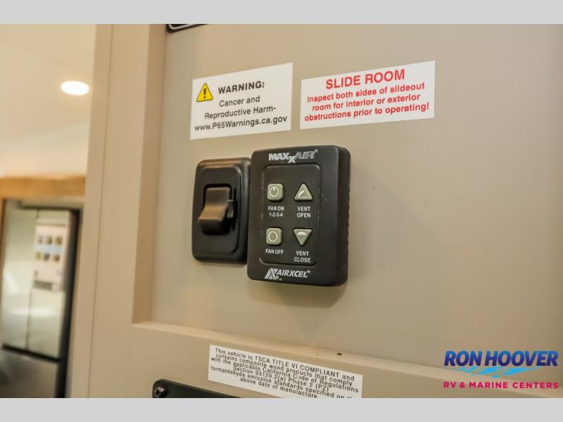This fifth wheel is ready for adventure when you are! Once you arrive at the campground, you can put out the 16' awning, then start lunch on the exterior griddle. A booth dinette and theater sofa provide seating space inside, and there is a 50" Class HDTV to enjoy movies. The chef will also love the interior kitchen with its ample counter space, and there is plenty of storage with a hutch/pantry, second pantry, and 10 cu. ft. 12V refrigerator. Freshen up in the full bath before heading off to bed in the front private bedroom. Here, you'll find a queen bed, dual nightstands and overhead storage, plus a wardrobe with washer and dryer prep if you choose to add those appliances!