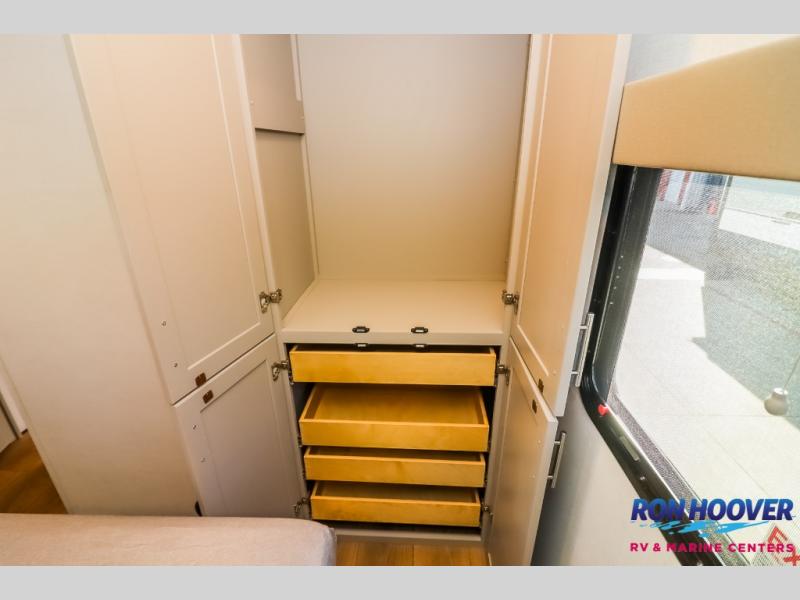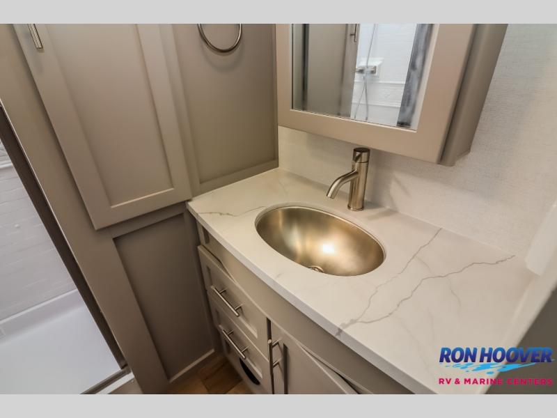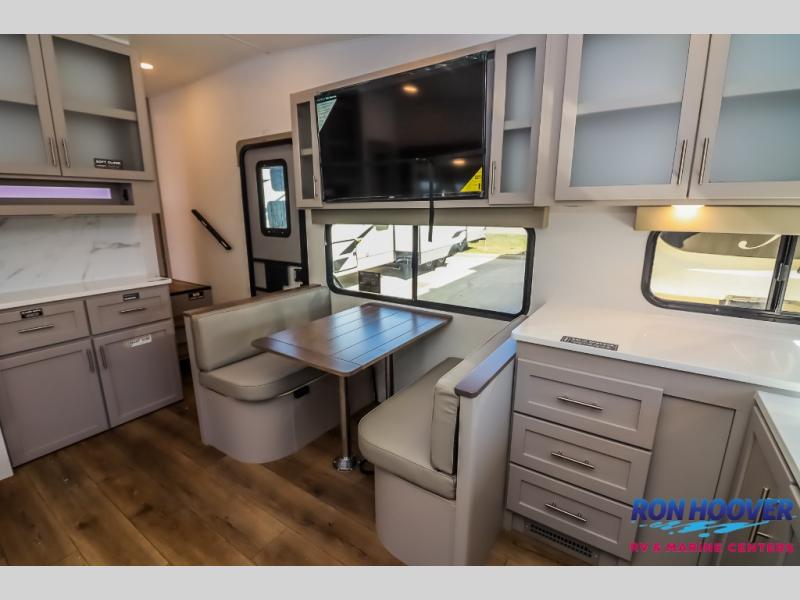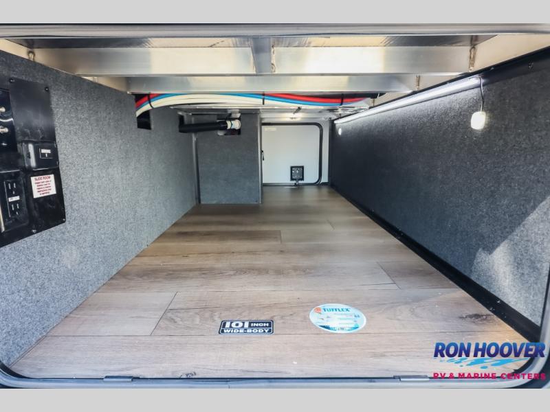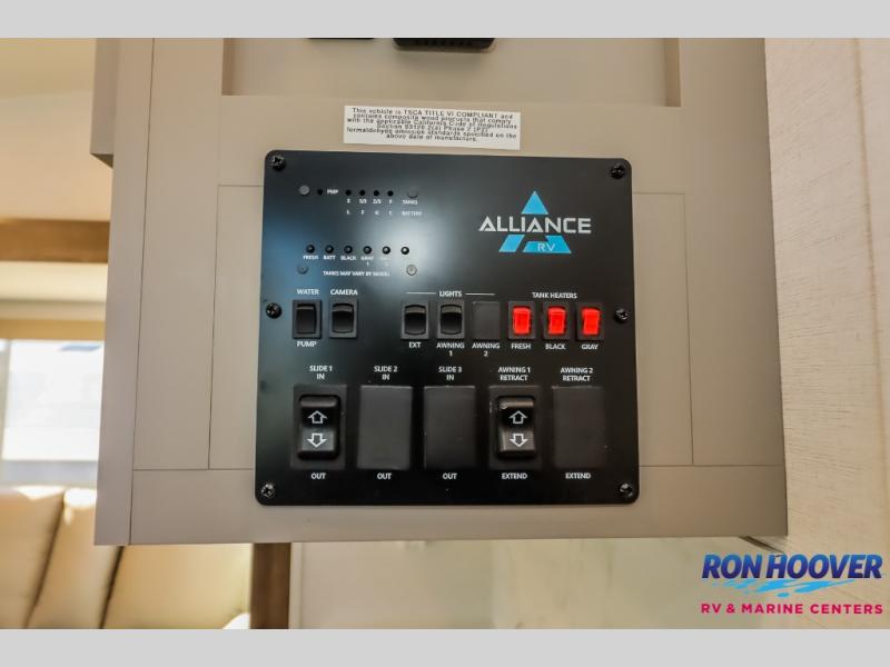 A benchmark chassis creates a space saver upper deck with each one of these Avenue All-Access fifth wheels by Alliance RV! The 101 in. wide-body construction gives you more room to walk around and the flush slide out floors throughout prevent any tripping. There are Azdel composite sidewalls inside and out, and a seamless fully walkable PVC roof for extreme durability and zero maintenance. You are sure to love the "no carpet zone" making each Avenue easy to clean and allergen free, not to mention pet friendly. You can maximize your space throughout with innovative storage solutions like the hidden storage behind the TV, inside the end tables, ottoman, and dinette chairs. These units also include the OTG Solar Package with a 200 watt solar panel, 15 amp MPPT charger, multiple outlets, and more to keep you powered up!