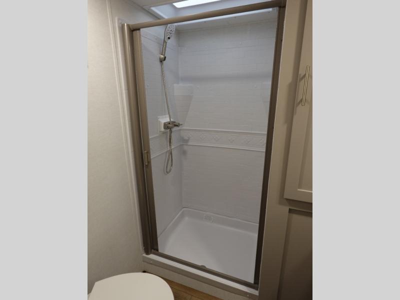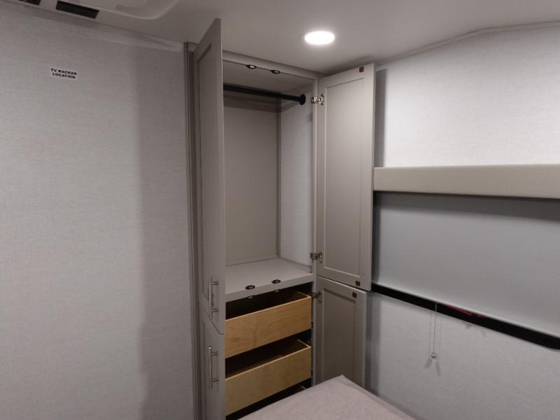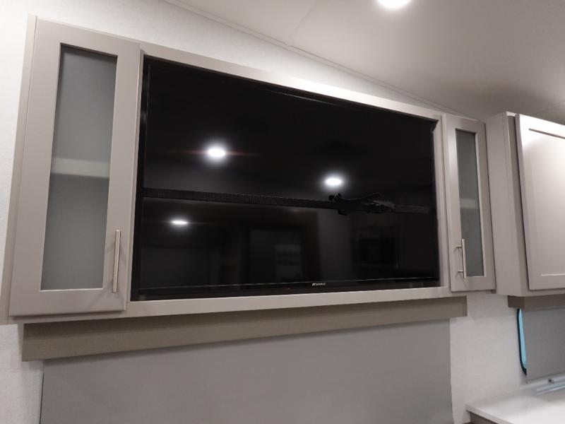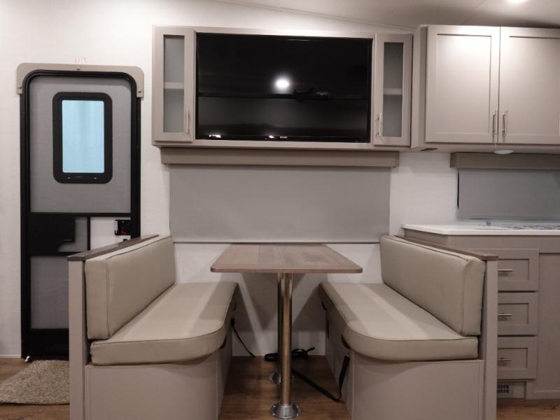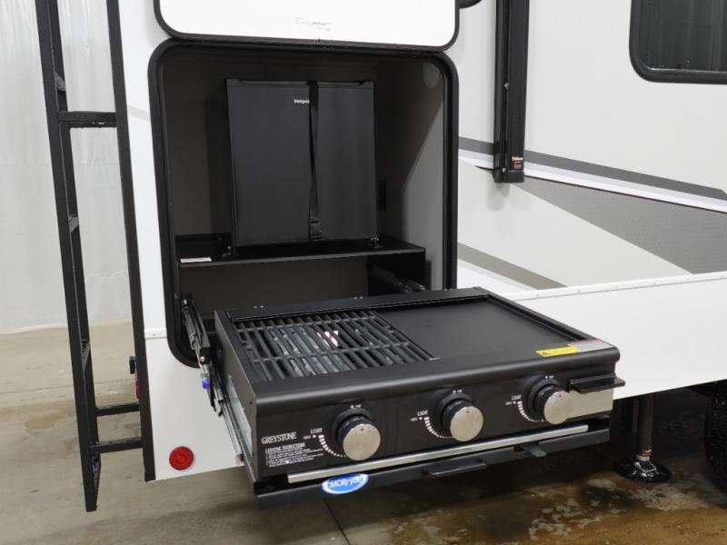 This fifth wheel is ready for adventure when you are! Once you arrive at the campground, you can put out the 16' awning, then start lunch on the exterior griddle. A booth dinette and theater sofa provide seating space inside, and there is a 50" Class HDTV to enjoy movies. The chef will also love the interior kitchen with its ample counter space, and there is plenty of storage with a hutch/pantry, second pantry, and 10 cu. ft. 12V refrigerator. Freshen up in the full bath before heading off to bed in the front private bedroom. Here, you'll find a queen bed, dual nightstands and overhead storage, plus a wardrobe with washer and dryer prep if you choose to add those appliances!