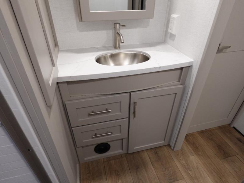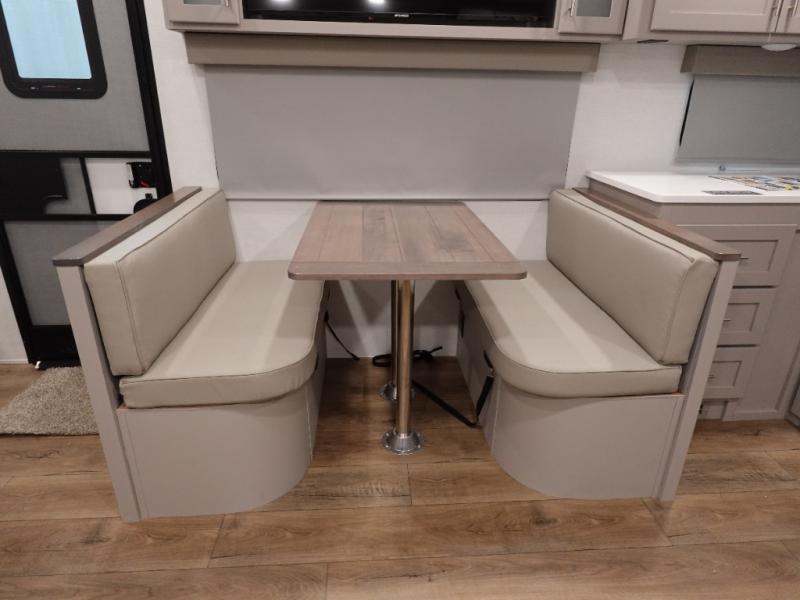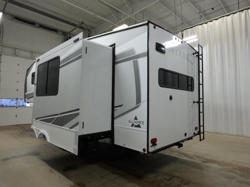 A benchmark chassis creates a space saver upper deck with each one of these Avenue All-Access fifth wheels by Alliance RV! The 101 in. wide-body construction gives you more room to walk around and the flush slide out floors throughout prevent any tripping. There are Azdel composite sidewalls inside and out, and a seamless fully walkable PVC roof for extreme durability and zero maintenance. You are sure to love the "no carpet zone" making each Avenue easy to clean and allergen free, not to mention pet friendly. You can maximize your space throughout with innovative storage solutions like the hidden storage behind the TV, inside the end tables, ottoman, and dinette chairs. These units also include the OTG Solar Package with a 200 watt solar panel, 15 amp MPPT charger, multiple outlets, and more to keep you powered up!