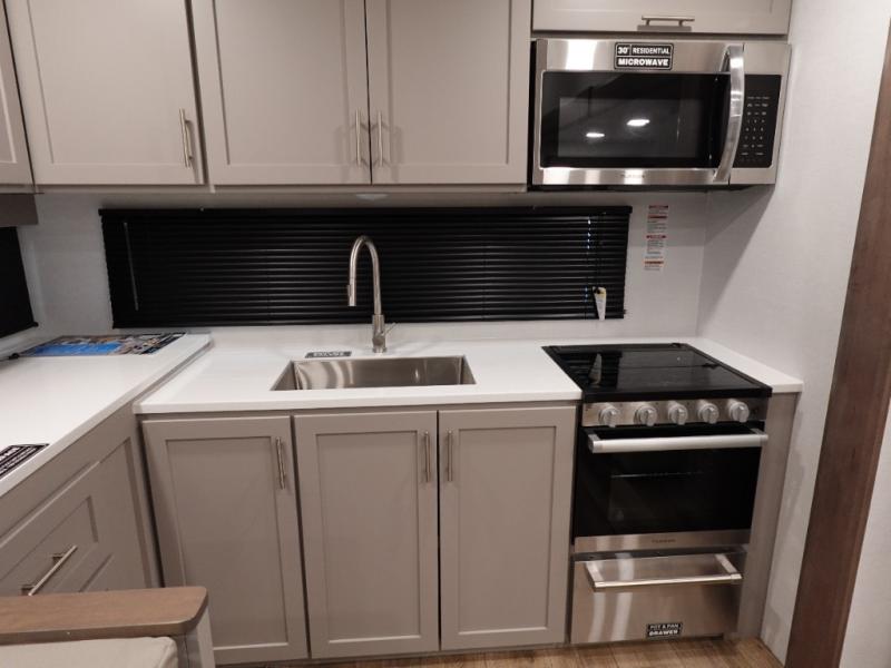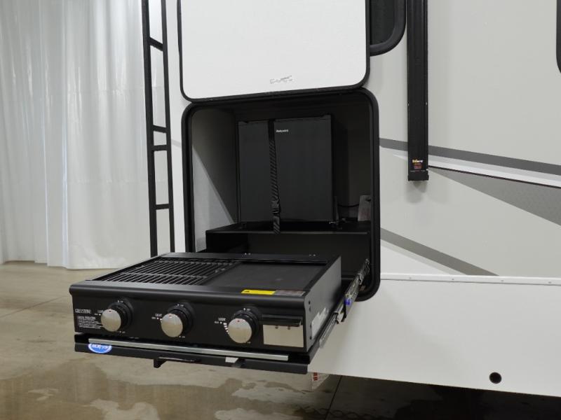 This fifth wheel is ready for adventure when you are! Once you arrive at the campground, you can put out the 16' awning, then start lunch on the exterior griddle. A booth dinette and theater sofa provide seating space inside, and there is a 50" Class HDTV to enjoy movies. The chef will also love the interior kitchen with its ample counter space, and there is plenty of storage with a hutch/pantry, second pantry, and 10 cu. ft. 12V refrigerator. Freshen up in the full bath before heading off to bed in the front private bedroom. Here, you'll find a queen bed, dual nightstands and overhead storage, plus a wardrobe with washer and dryer prep if you choose to add those appliances!