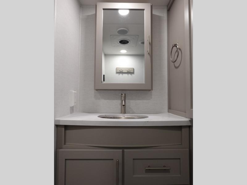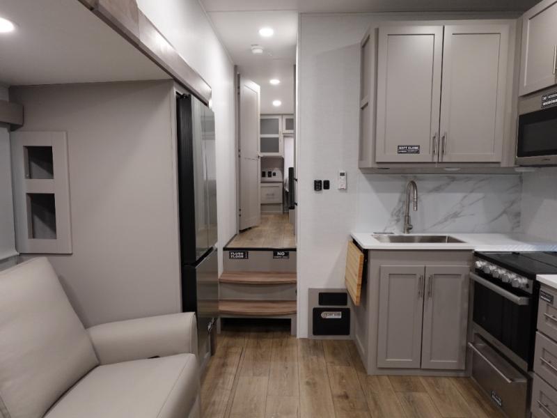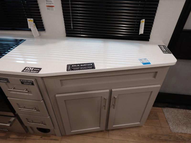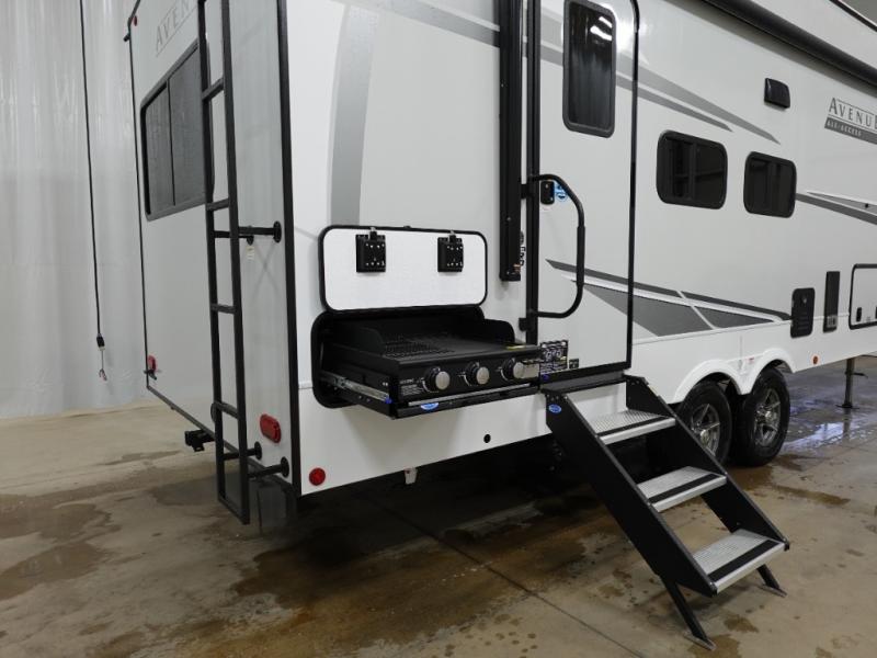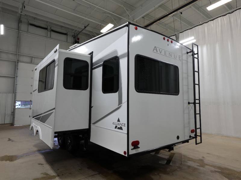 A benchmark chassis creates a space saver upper deck with each one of these Avenue All-Access fifth wheels by Alliance RV! The 101 in. wide-body construction gives you more room to walk around and the flush slide out floors throughout prevent any tripping. There are Azdel composite sidewalls inside and out, and a seamless fully walkable PVC roof for extreme durability and zero maintenance. You are sure to love the "no carpet zone" making each Avenue easy to clean and allergen free, not to mention pet friendly. You can maximize your space throughout with innovative storage solutions like the hidden storage behind the TV, inside the end tables, ottoman, and dinette chairs. These units also include the OTG Solar Package with a 200 watt solar panel, 15 amp MPPT charger, multiple outlets, and more to keep you powered up!