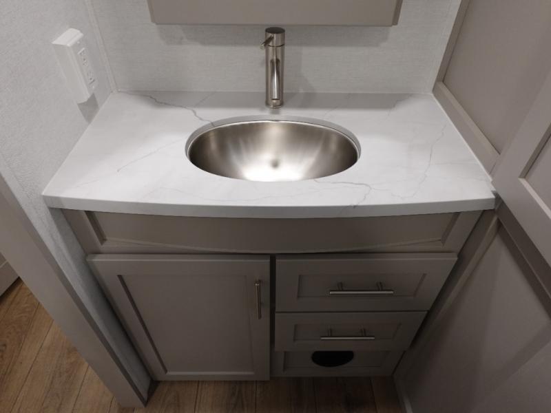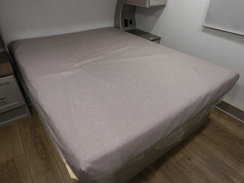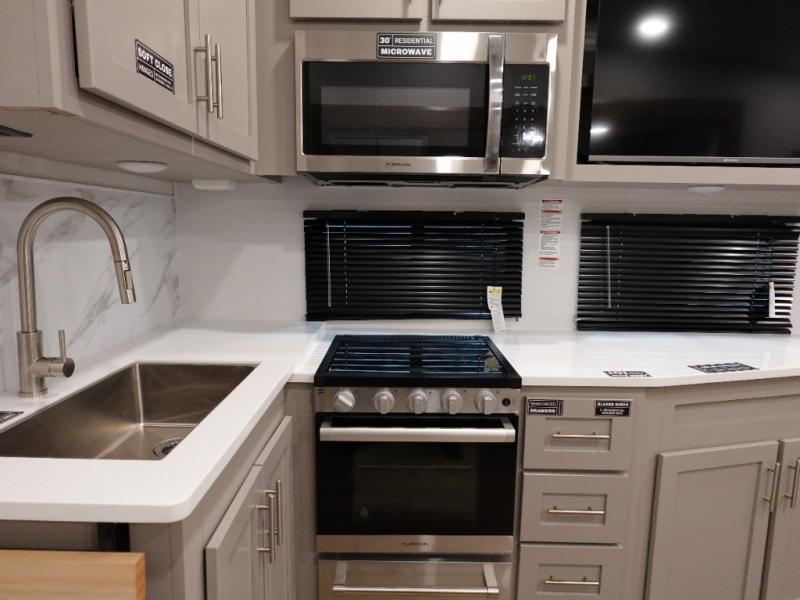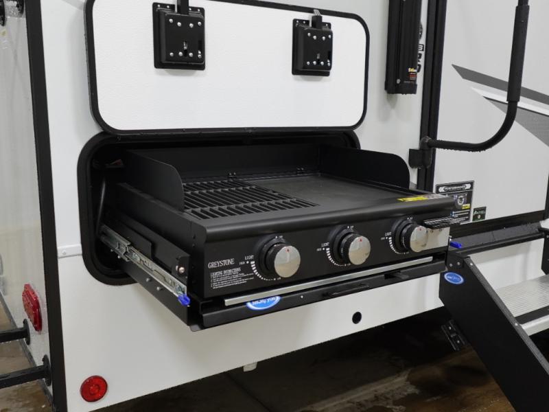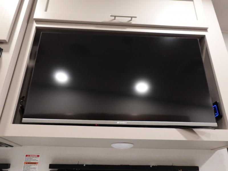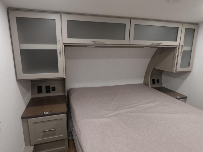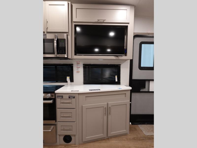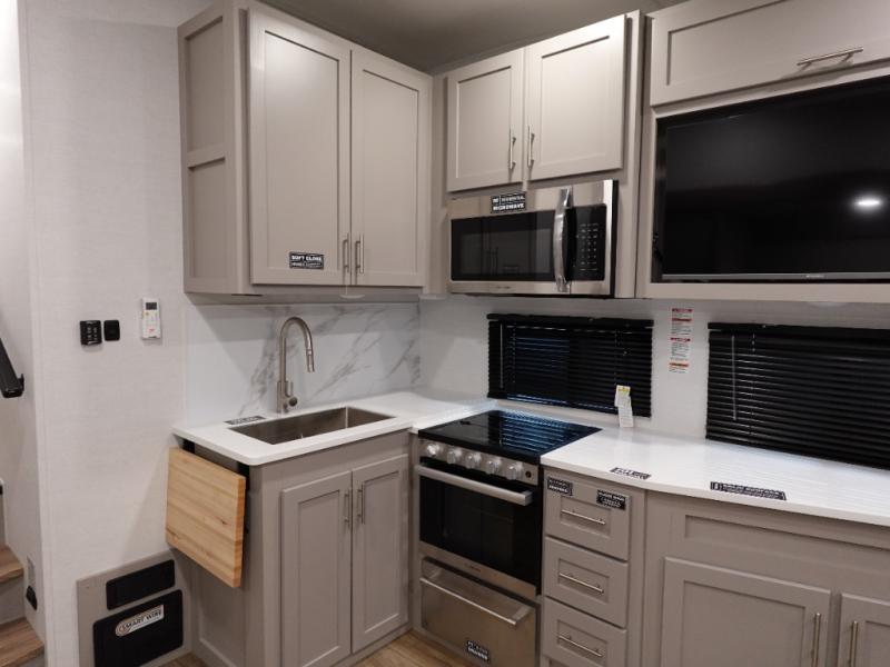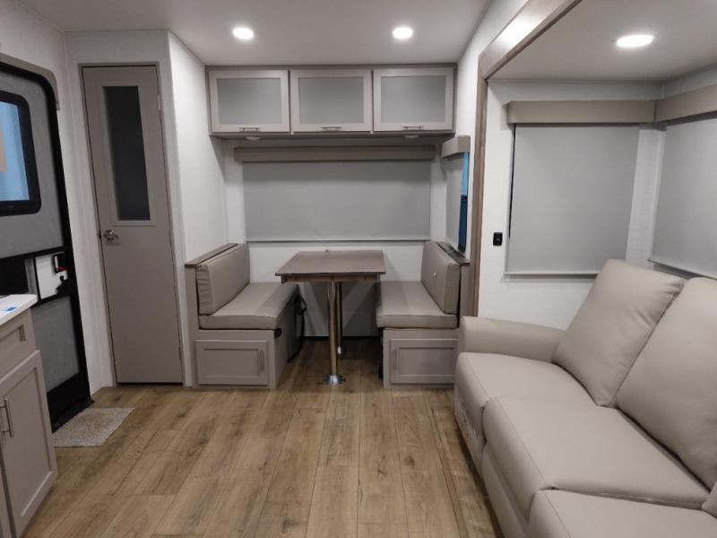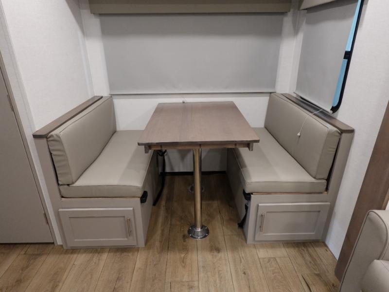 Escape to your favorite destinations with your favorite person in this fifth wheel! The front private bedroom has a queen bed with nightstands on either side to set a glass of water on, and a wardrobe to keep your clothes looking nice. Freshen up each morning in the full bathroom with a 30" x 36" shower, and grab a towel stored close by in the linen closet. Now that you're ready for the day, you can head to the kitchen and grab some eggs from the 10 cu. ft. 12V refrigerator to fry up using the three burner cooktop, plus there is a flip-up butcher block to make dinner prep easier. Spend your evenings in true relaxation seated on the sofa slide out across from the swing mount 40" HDTV. You also have a rear booth dinette with overhead storage!