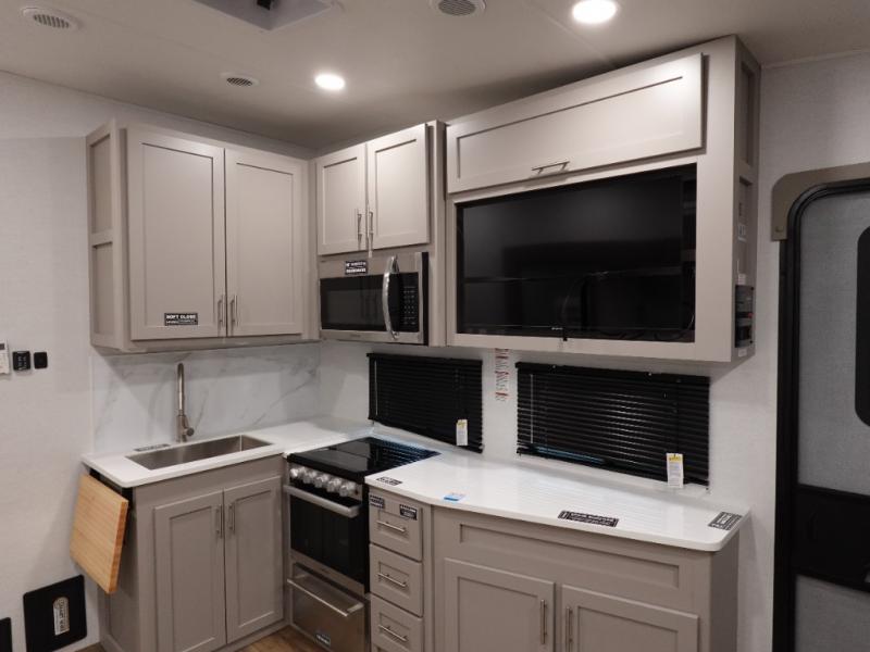 Escape to your favorite destinations with your favorite person in this fifth wheel! The front private bedroom has a queen bed with nightstands on either side to set a glass of water on, and a wardrobe to keep your clothes looking nice. Freshen up each morning in the full bathroom with a 30" x 36" shower, and grab a towel stored close by in the linen closet. Now that you're ready for the day, you can head to the kitchen and grab some eggs from the 10 cu. ft. 12V refrigerator to fry up using the three burner cooktop, plus there is a flip-up butcher block to make dinner prep easier. Spend your evenings in true relaxation seated on the sofa slide out across from the swing mount 40" HDTV. You also have a rear booth dinette with overhead storage!