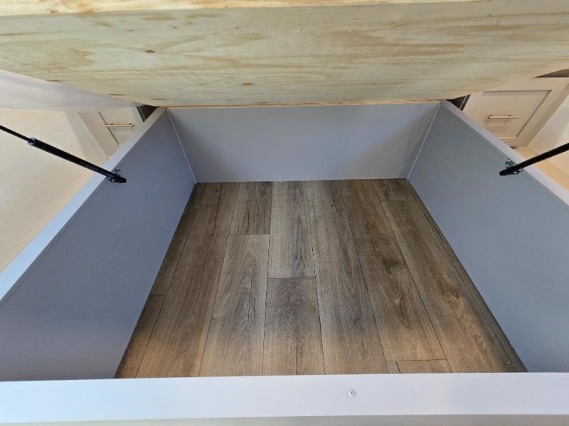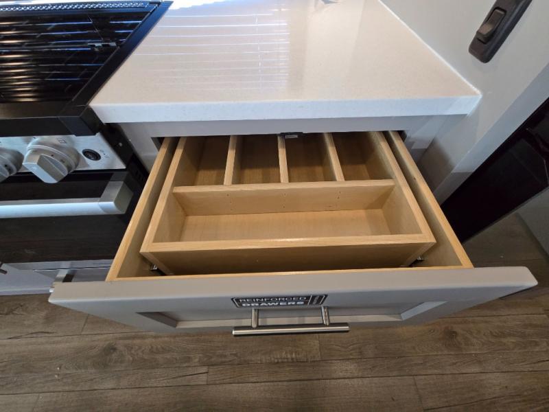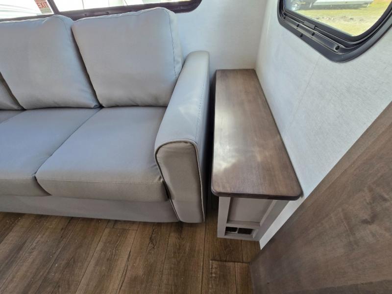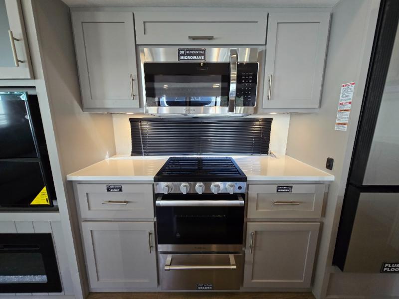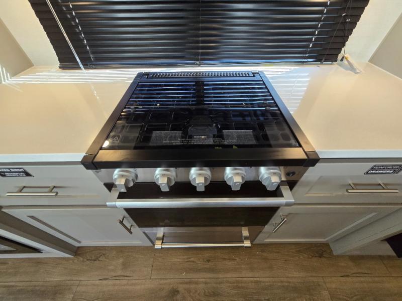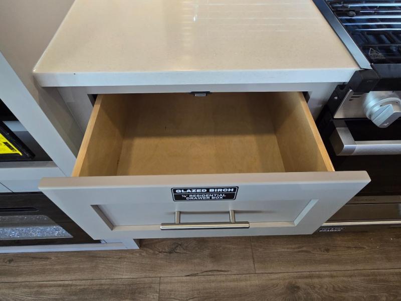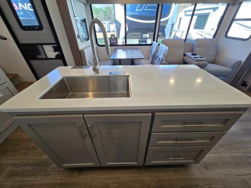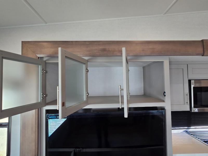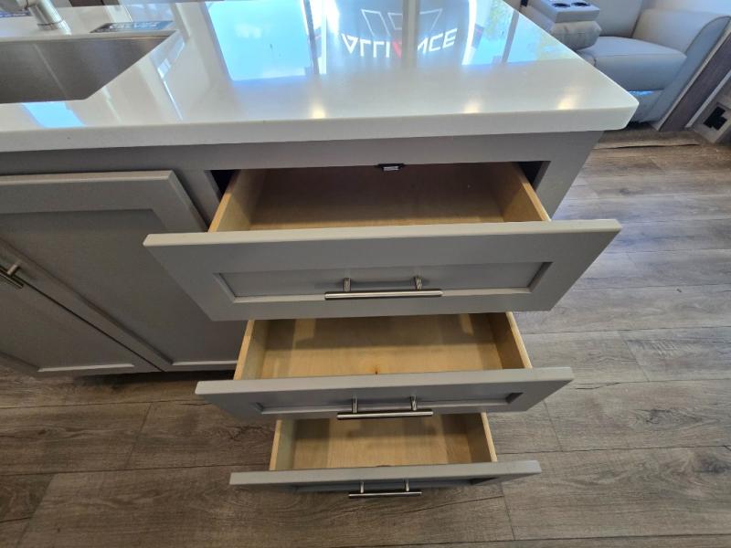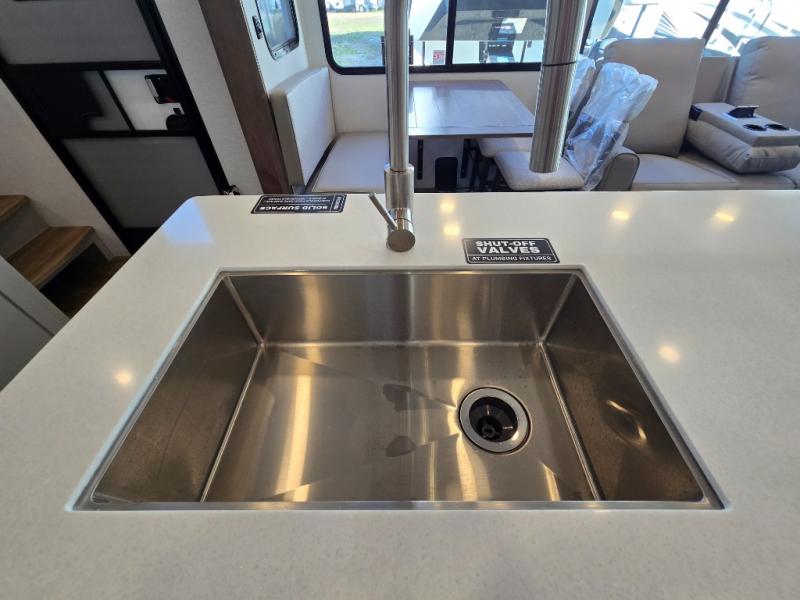 - Kitchen Island: Plenty of prep space with a 10 cu. ft. 12V refrigerator, three-burner cooktop, and extra counter space with a sink.