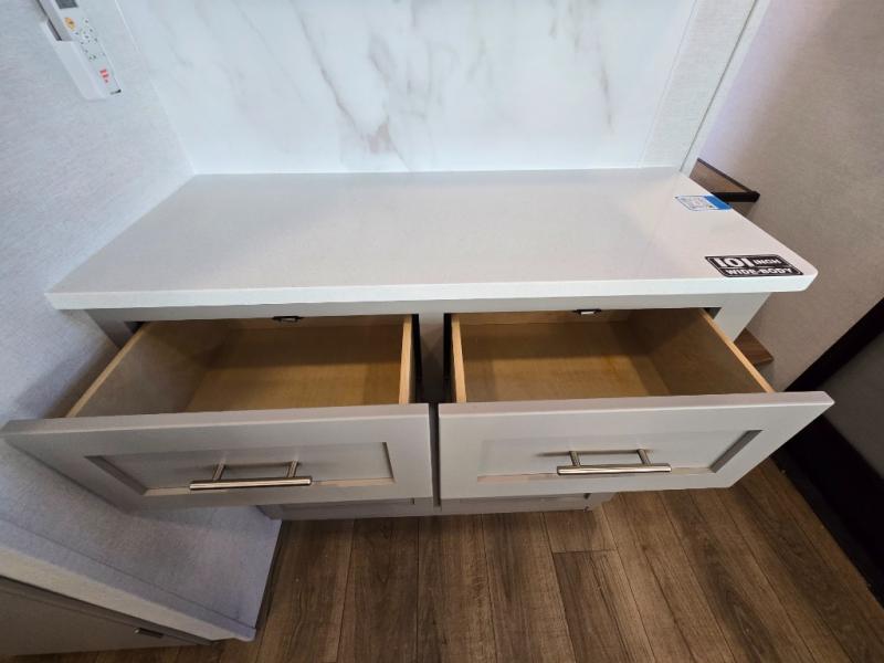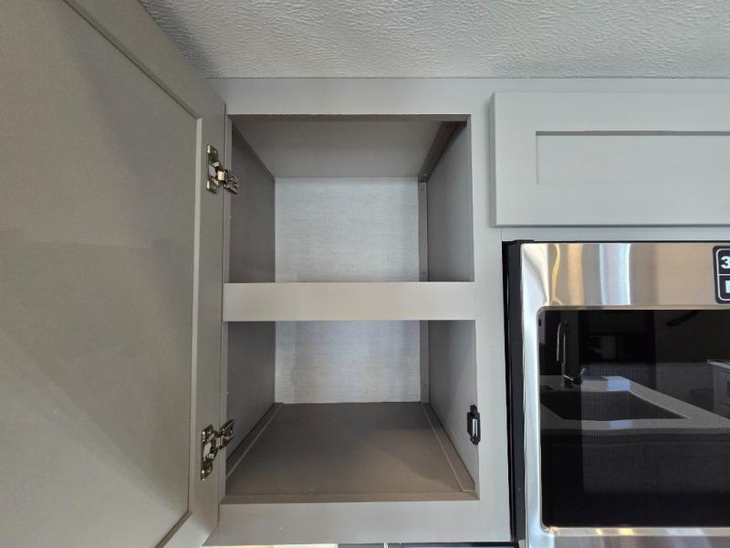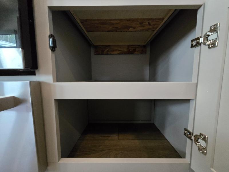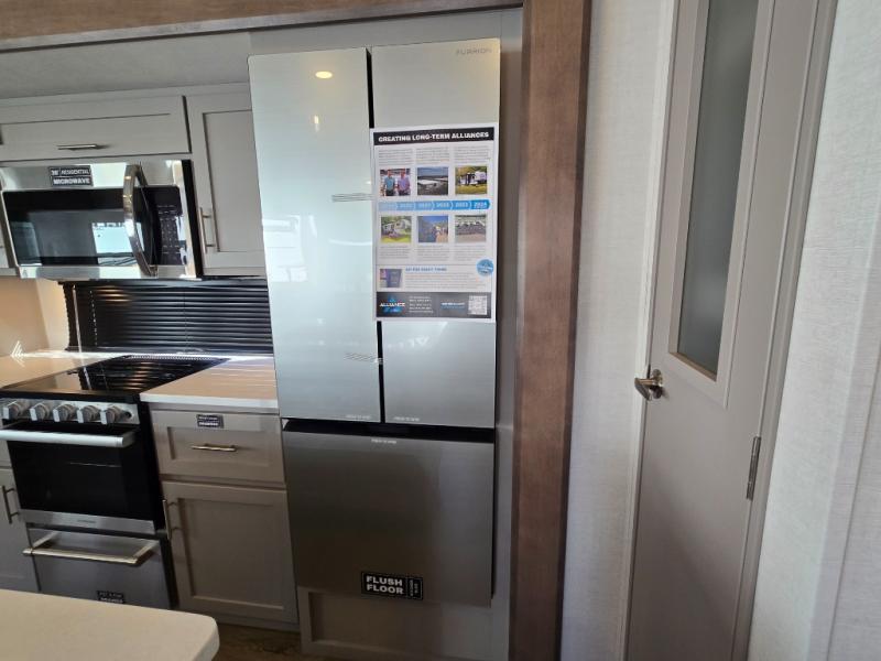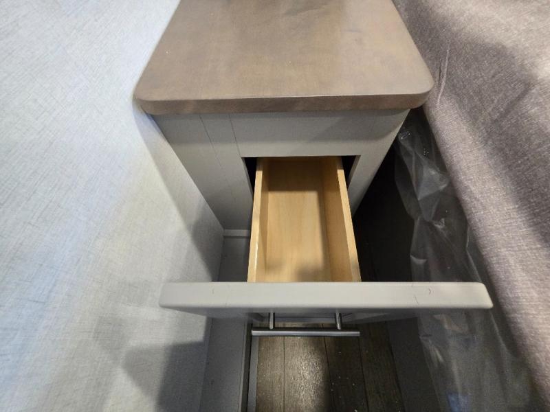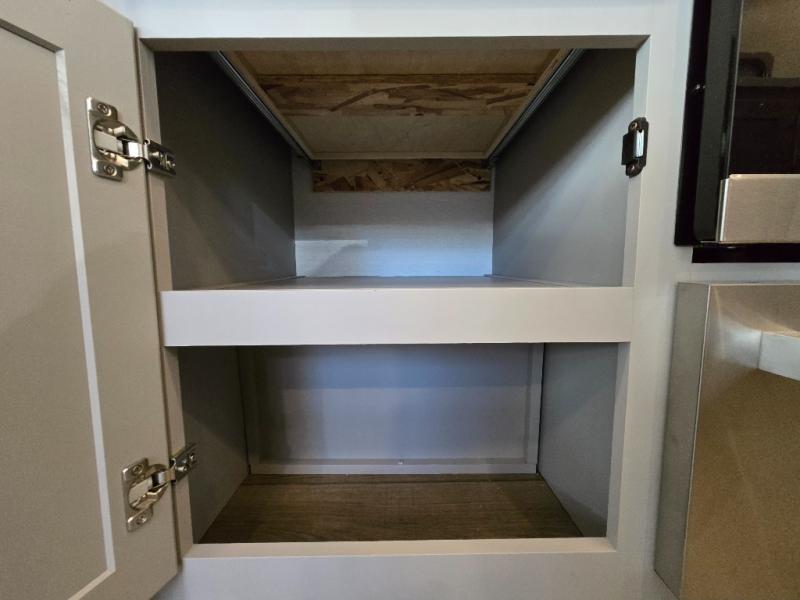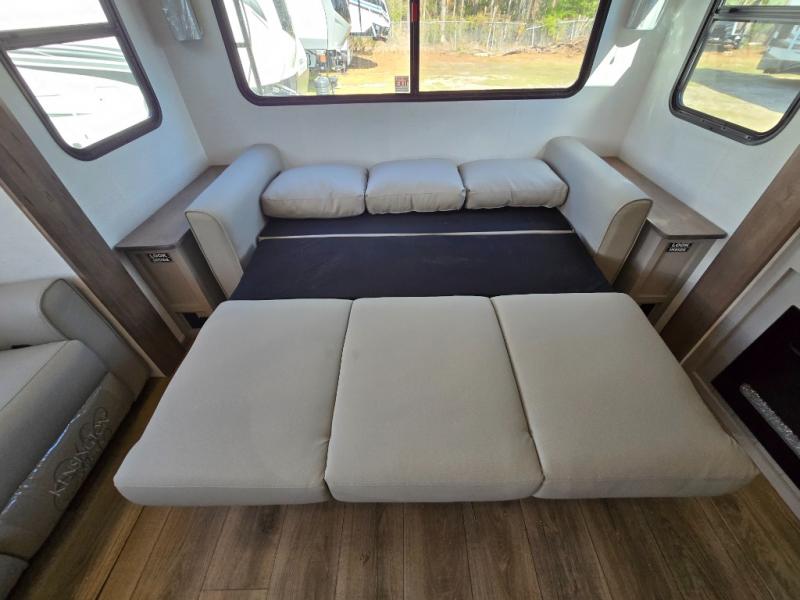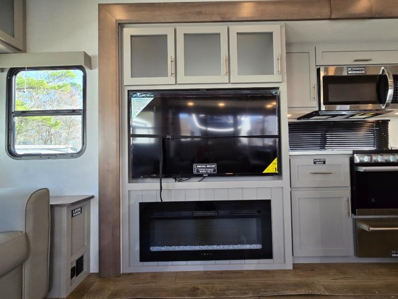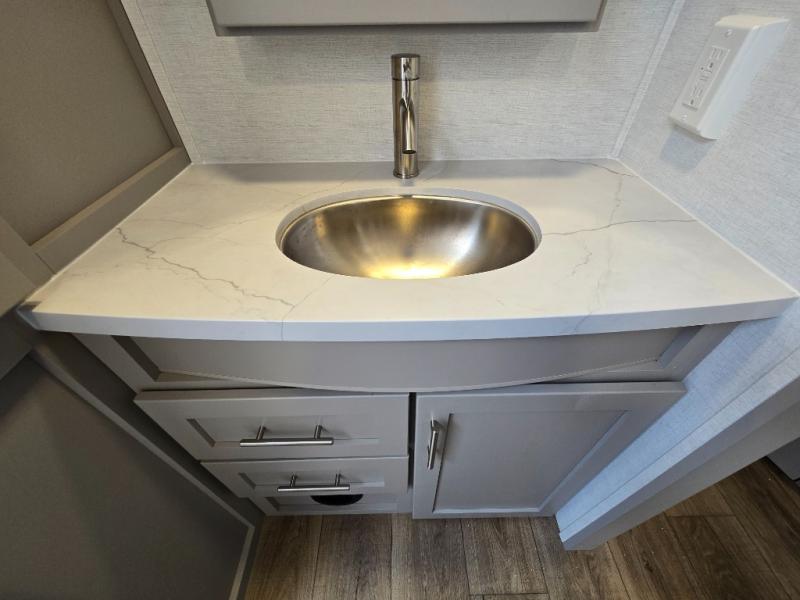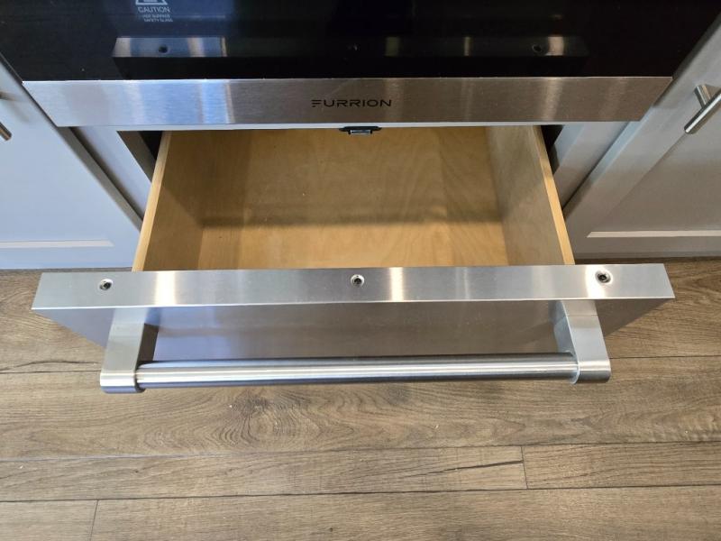 - Kitchen Island: Plenty of prep space with a 10 cu. ft. 12V refrigerator, three-burner cooktop, and extra counter space with a sink.