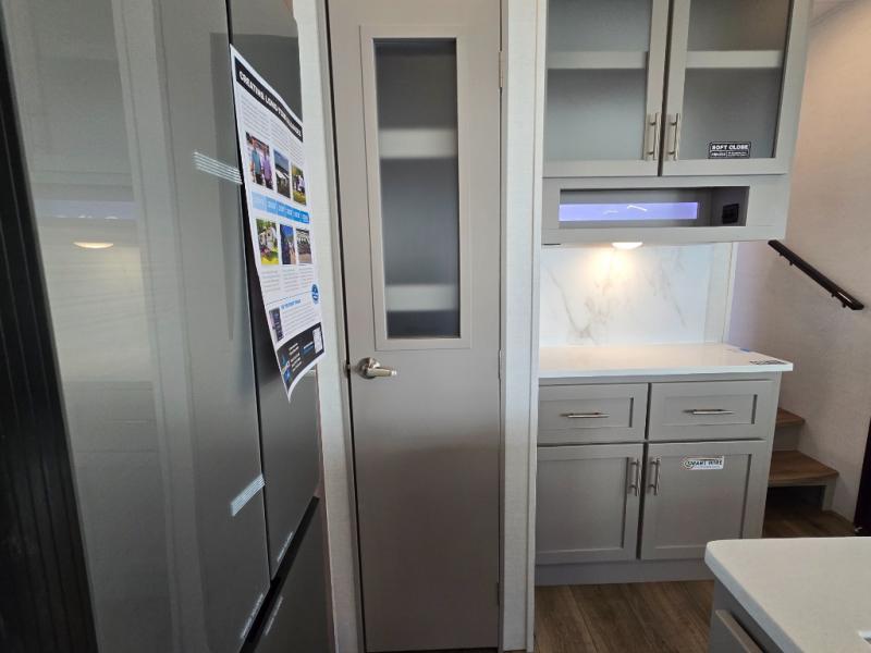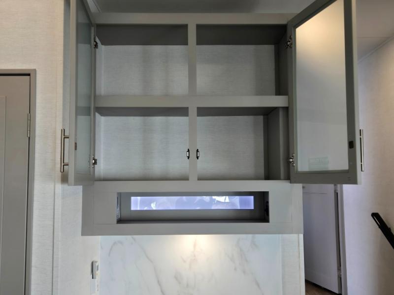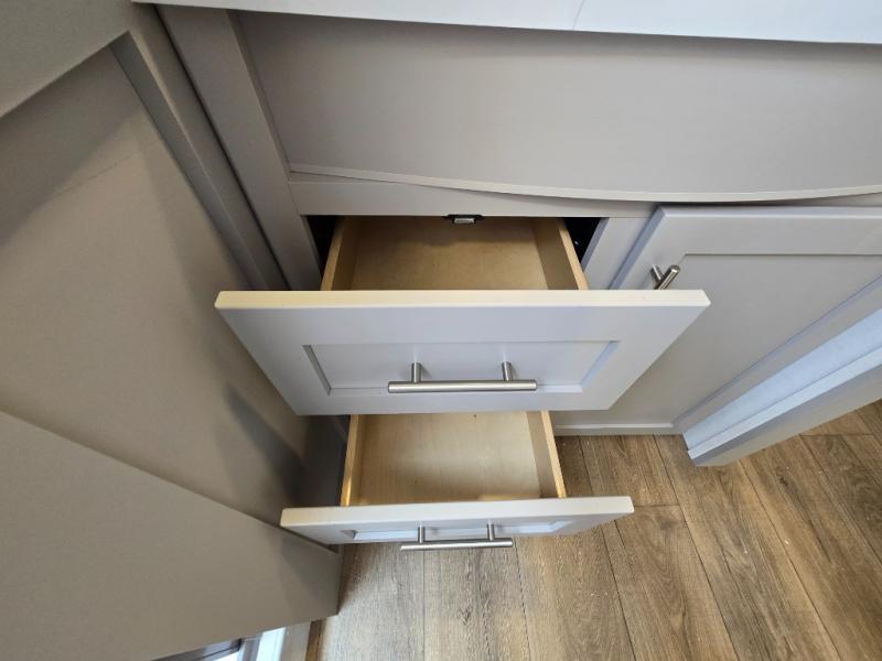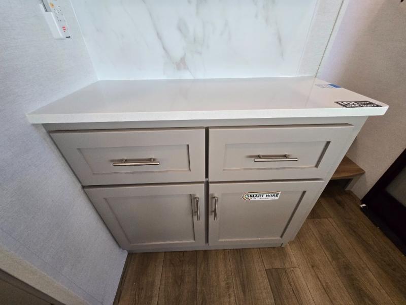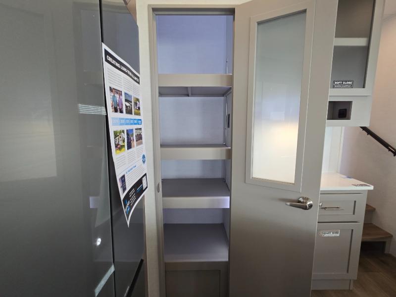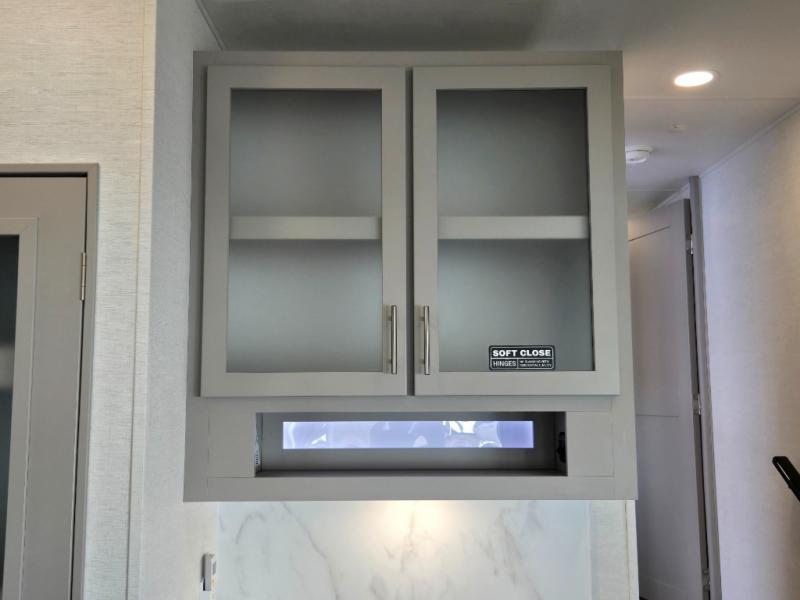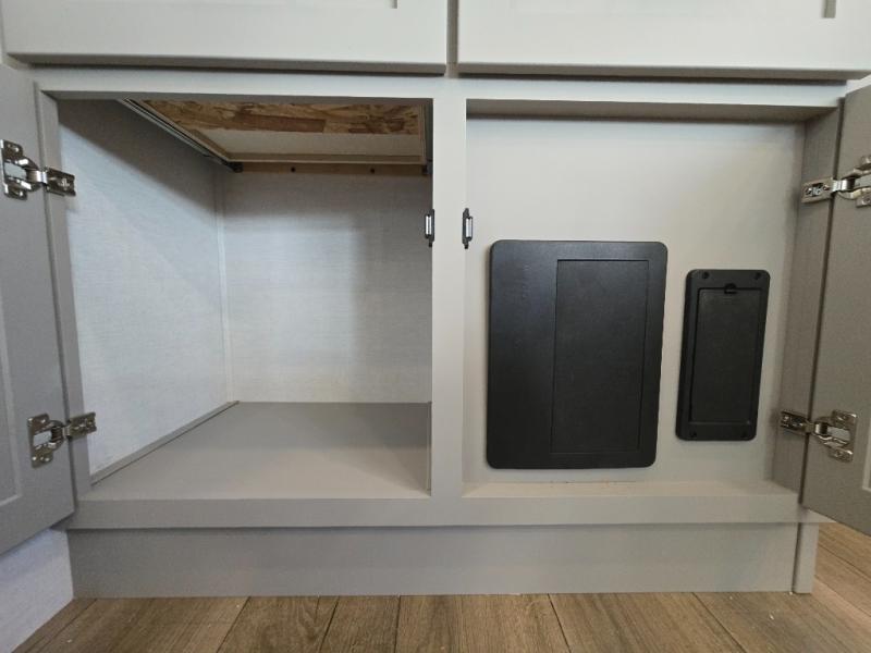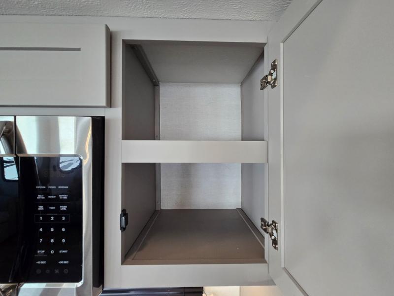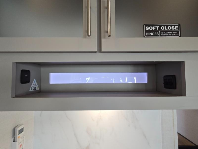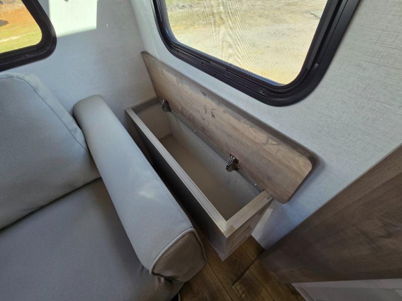 - Kitchen Island: Plenty of prep space with a 10 cu. ft. 12V refrigerator, three-burner cooktop, and extra counter space with a sink.