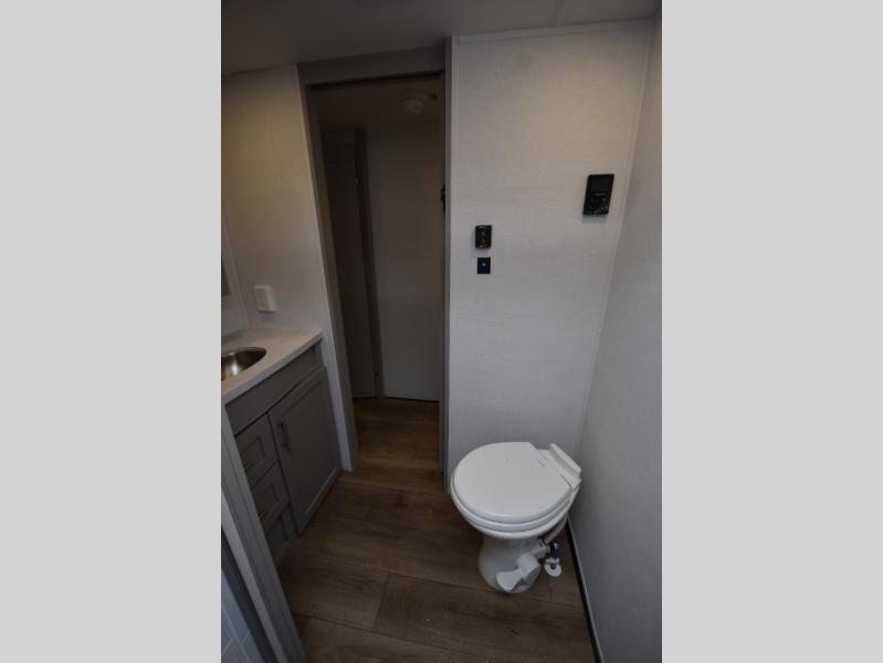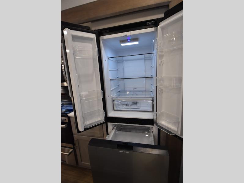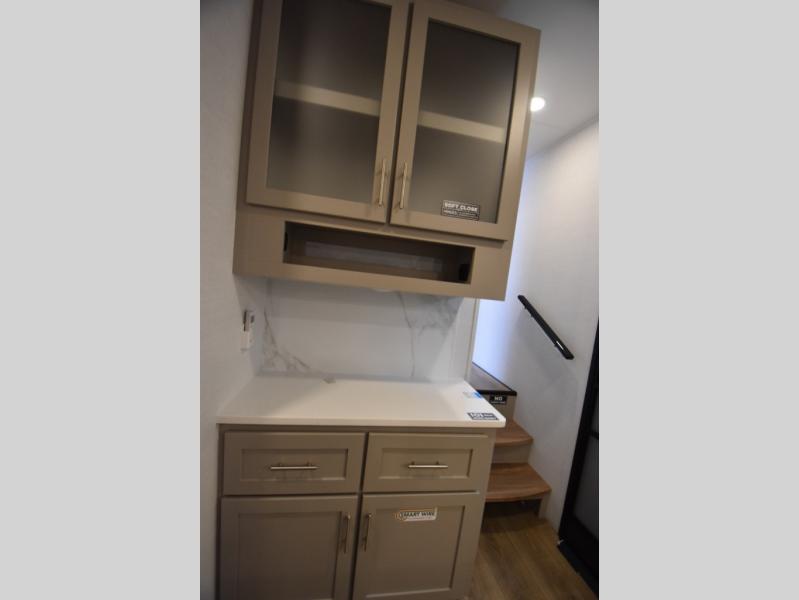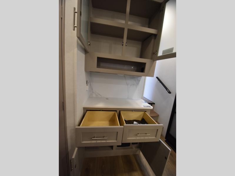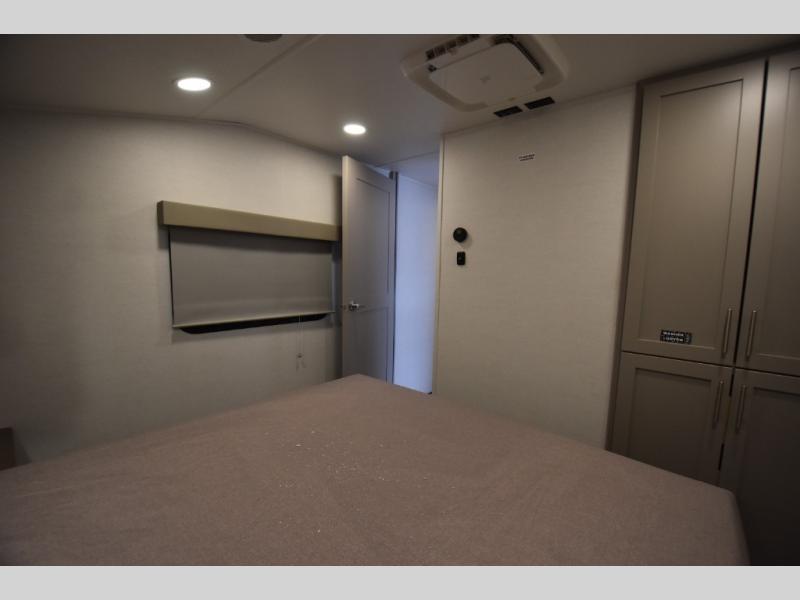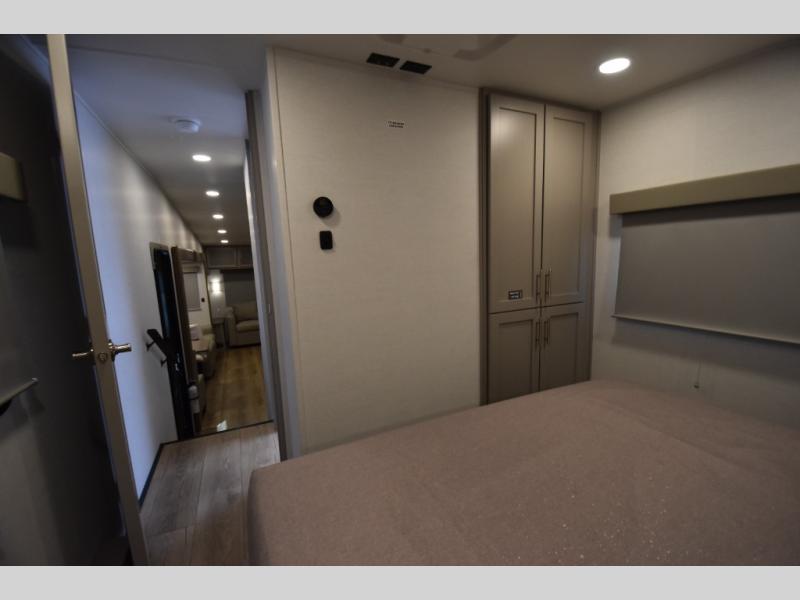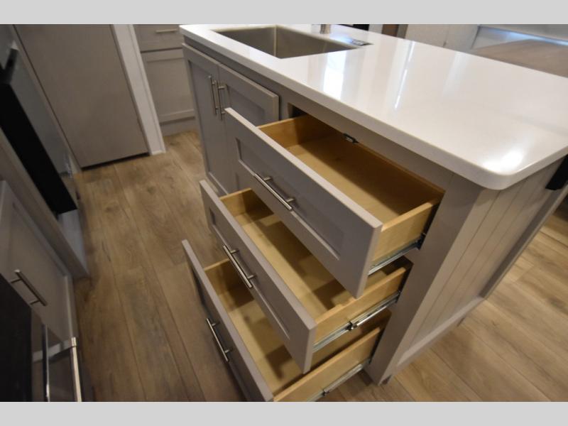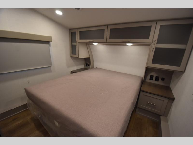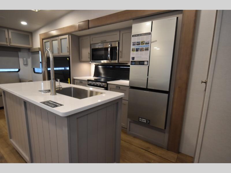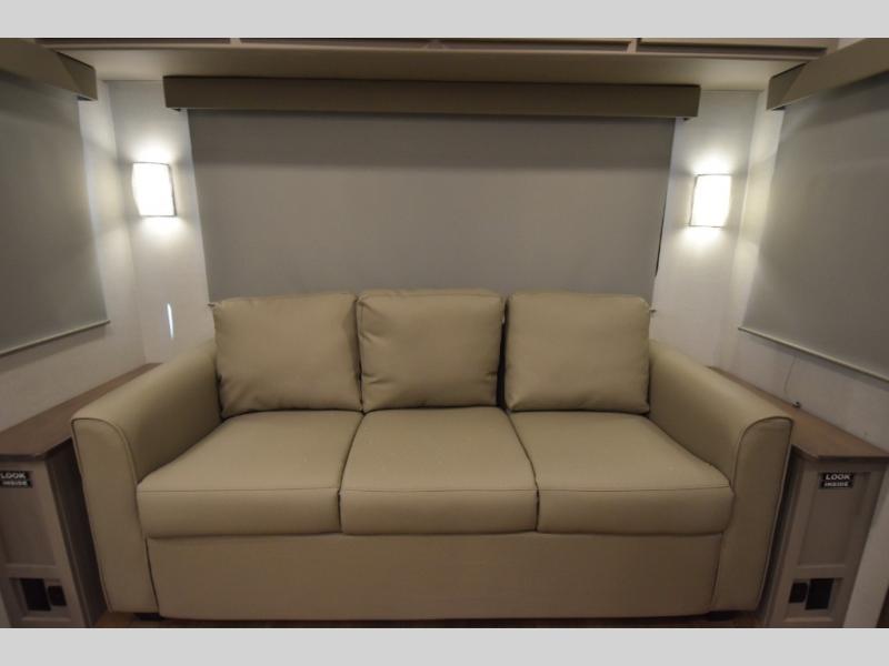For the couple that enjoys adventures, this rear living coach has everything you need to travel comfortably and take along a couple of friends! The front private bedroom has a queen bed with nightstands on either side for your personal belongings, and a wardrobe to keep your clothes looking nice. Freshen up each morning in the full bathroom with a 30" x 36" shower, and grab a towel stored close by in the linen closet. Now that you're ready for the day, you can head to the kitchen and create a hearty breakfast with the full kitchen amenities. You will appreciate having a 10 cu. ft. 12V refrigerator and three burner cooktop, plus there is a center island with plenty of counter space and a sink to make food prep even easier. Spend your evenings in true relaxation in the dual recliner theater seats across from the swing mount 50" HDTV with hidden storage behind. You will also love the pantry and hutch in the kitchen area for storing all of your dishes and non-perishables. Dine at the floating table with two chairs along with a moveable ottoman featuring storage.