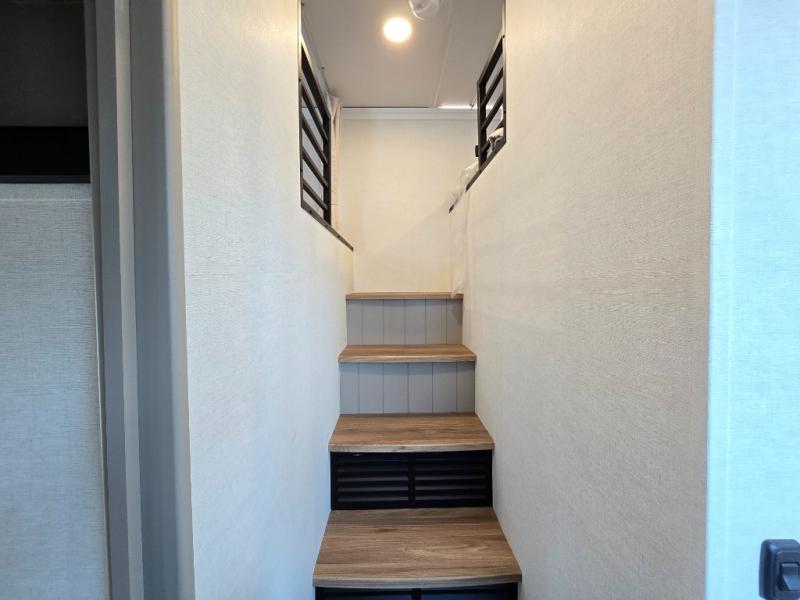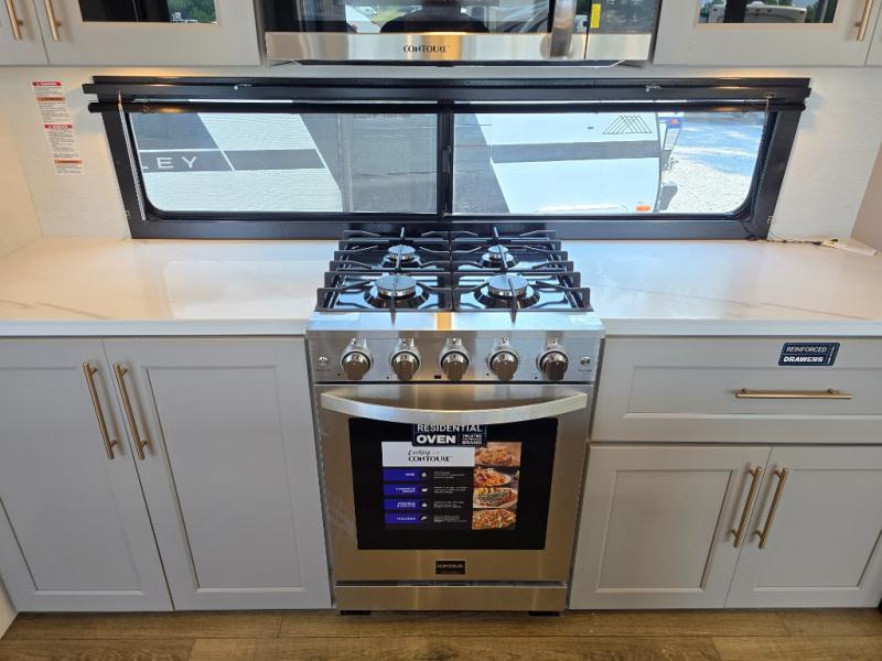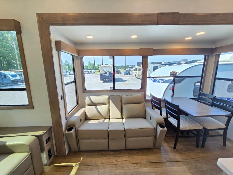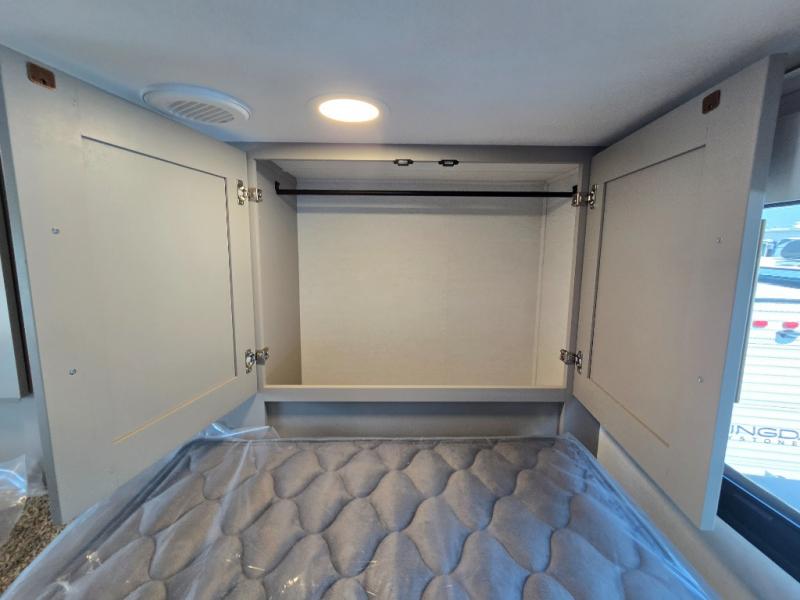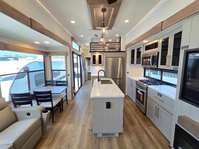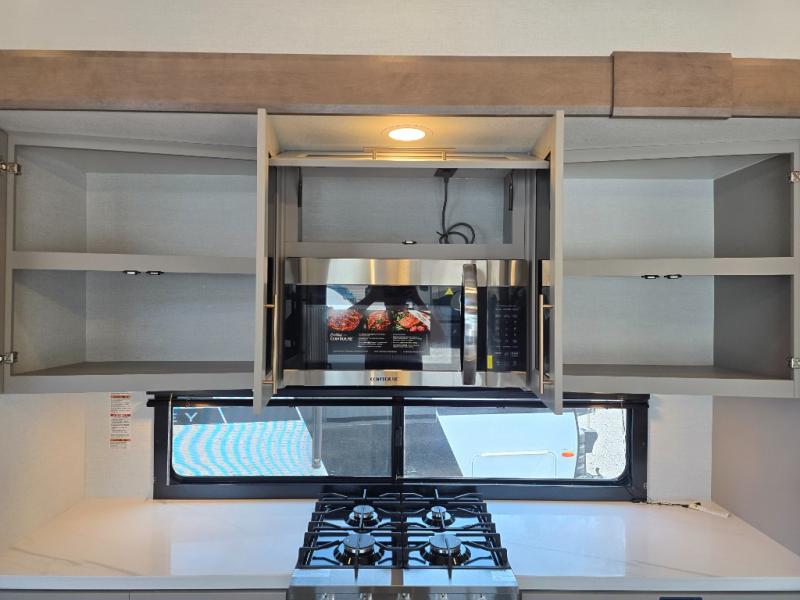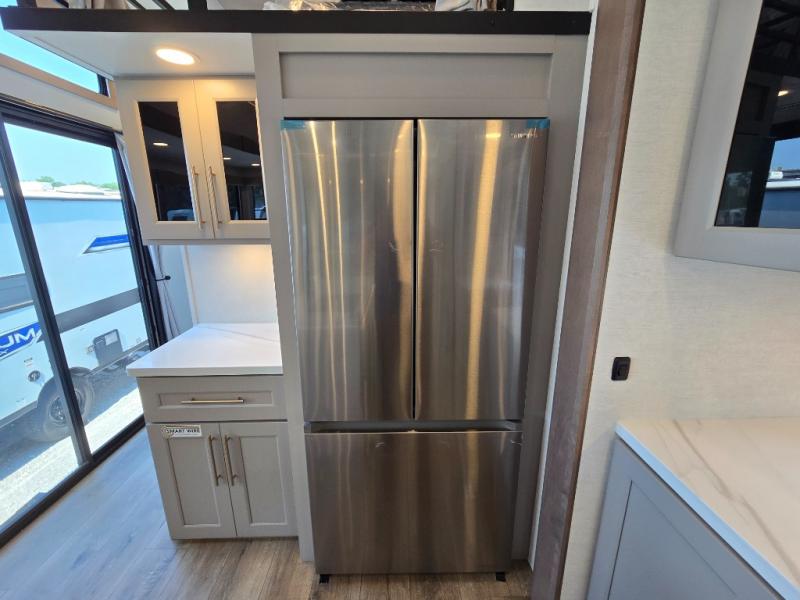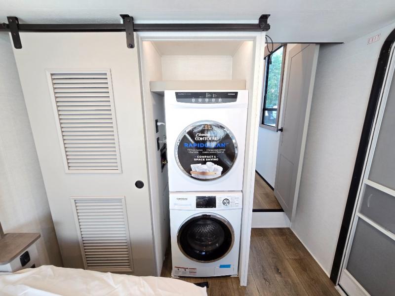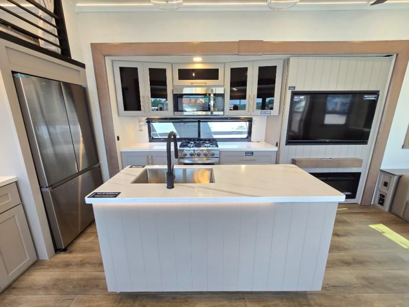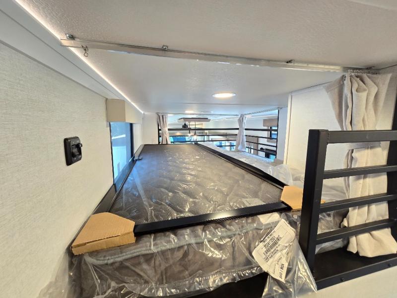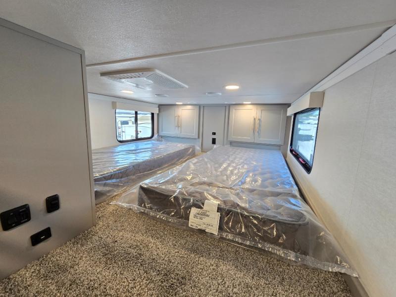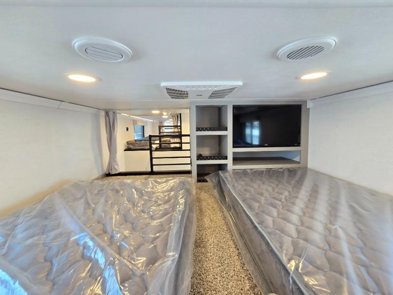 This destination trailer with a loft will be a favorite with the little ones! They will have three bunk mats to choose from plus a wardrobe to keep their things picked up. You can take the rear private bedroom that includes a power tilting king bed that will allow you to sit up in bed at night to read. There is also a wardrobe, a dresser with a 32" TV, and a stackable washer and dryer to make laundry day easier than ever. A full bath with a 48" x 30" shower will let you freshen up each day, and there is a linen closet to keep clean towels close by. Everyone will enjoy spending time together in the front living area that includes a two dual recliner theater seats, a 50" TV and fireplace, and hidden storage for games or books. The chef of your group can make meals each day on the residential range and microwave, and there is a 110V Samsung refrigerator to keep your food fresh.