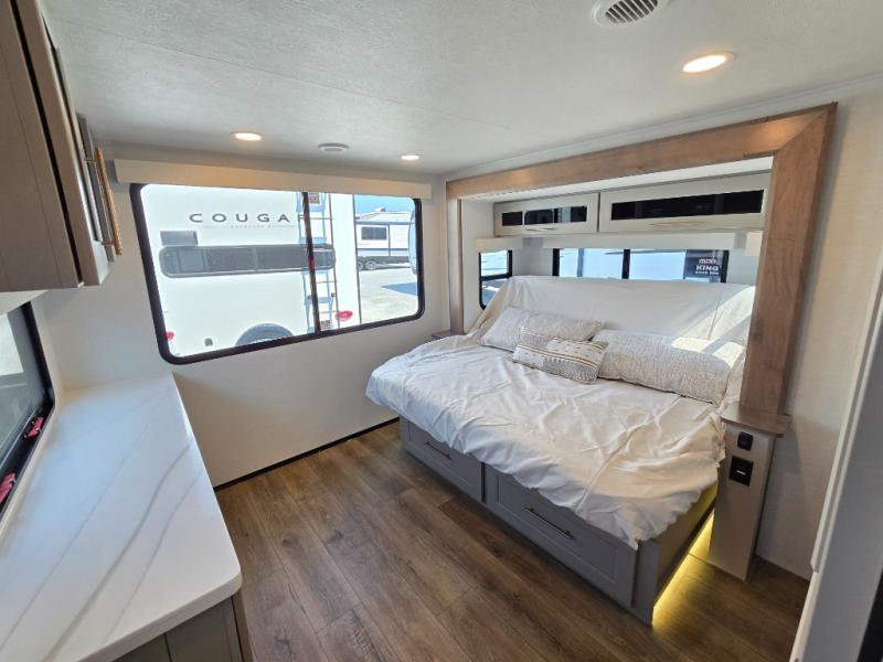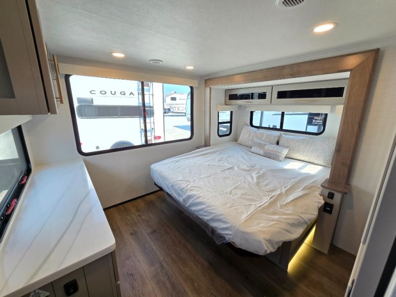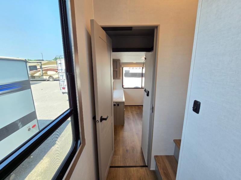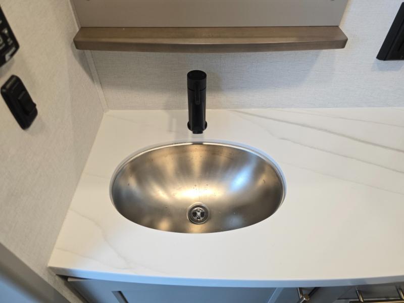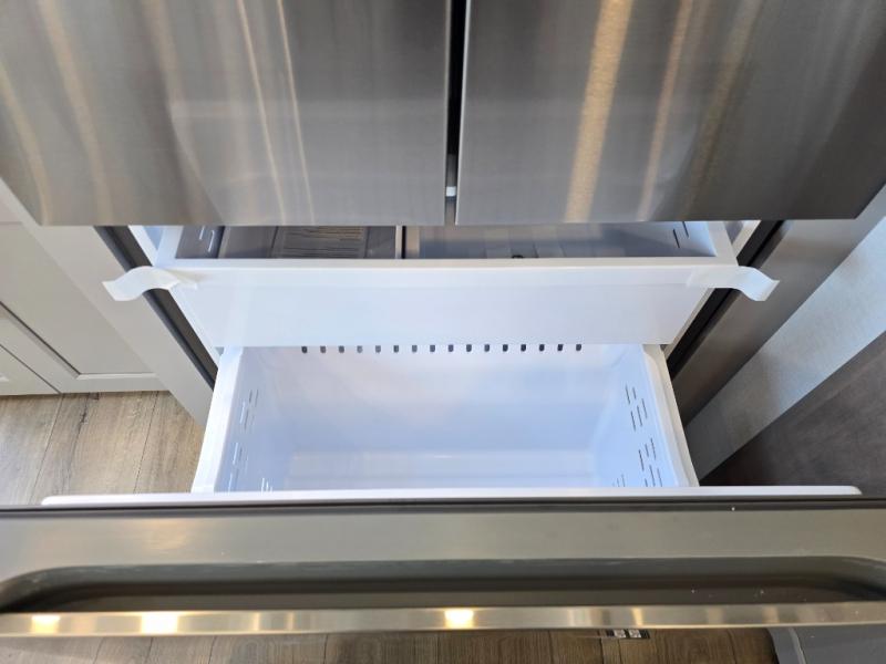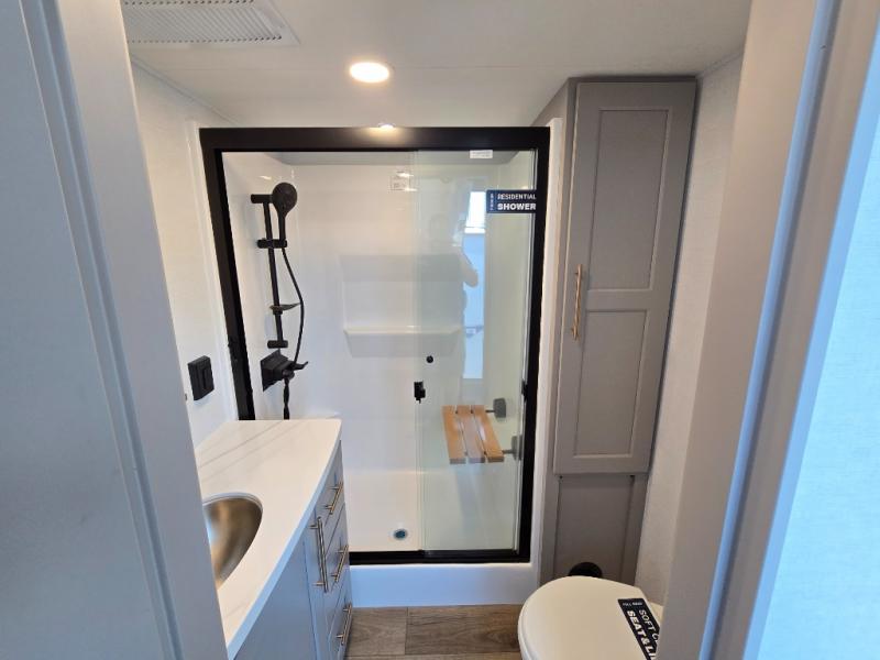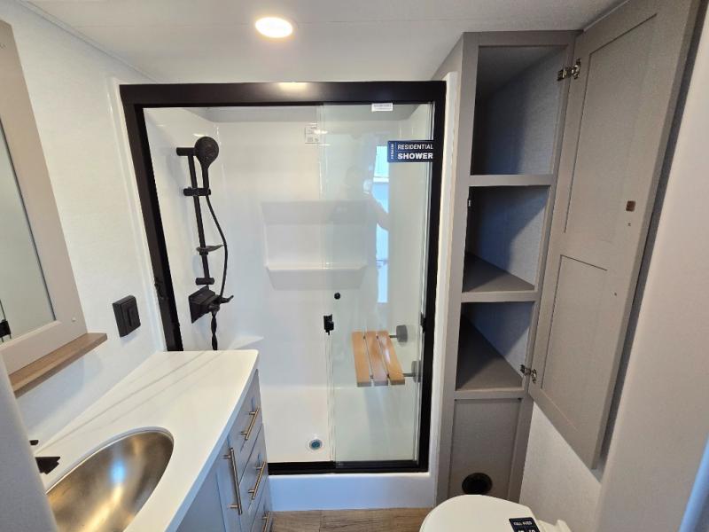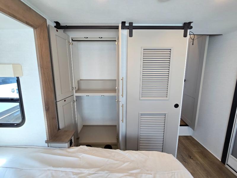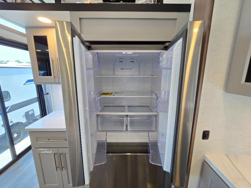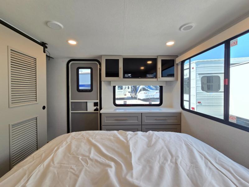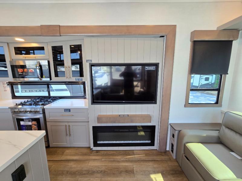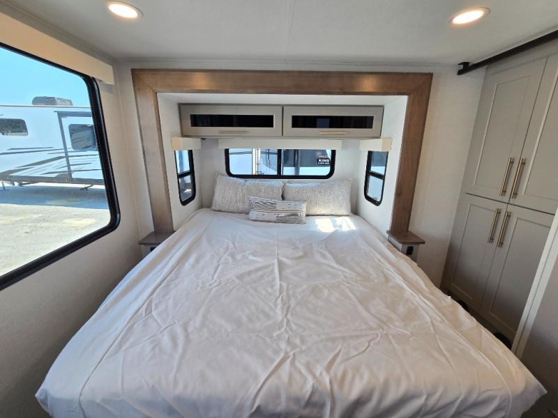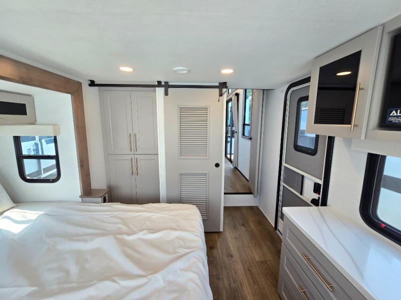 This destination trailer with a loft will be a favorite with the little ones! They will have three bunk mats to choose from plus a wardrobe to keep their things picked up. You can take the rear private bedroom that includes a power tilting king bed that will allow you to sit up in bed at night to read. There is also a wardrobe, a dresser with a 32" TV, and a stackable washer and dryer to make laundry day easier than ever. A full bath with a 48" x 30" shower will let you freshen up each day, and there is a linen closet to keep clean towels close by. Everyone will enjoy spending time together in the front living area that includes a two dual recliner theater seats, a 50" TV and fireplace, and hidden storage for games or books. The chef of your group can make meals each day on the residential range and microwave, and there is a 110V Samsung refrigerator to keep your food fresh.