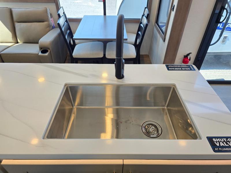 With any Benchmark destination trailer by Alliance RV, you will enjoy luxury features at every turn! The high gloss fiberglass exterior is ultra sleek, and the Azdel composite fiberglass sidewalls add durability so you can camp for years to come. You'll also find a residential exterior garden hose connection outside, along with a powder coated aluminum rear ladder, and an auxiliary LP tank hook up if you want to bring your grill along. Head inside to find hardwood cabinetry, solid surface countertops throughout, oversized windows in all rooms, and MCD roller shades throughout. The 45,000 BTU A/C and 60,000 BTU furnace will keep you comfortable year around, and there is a stackable washer and dryer to make full-time RV living easier than ever!