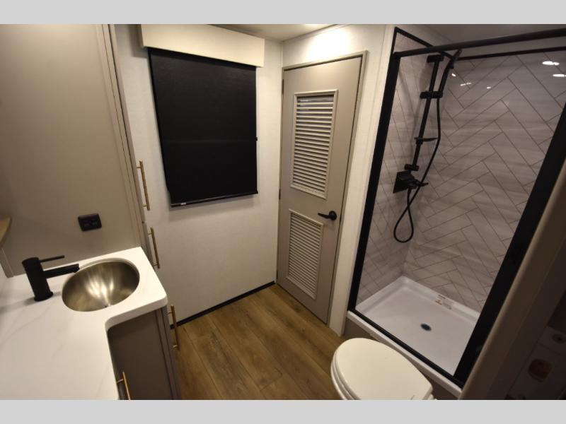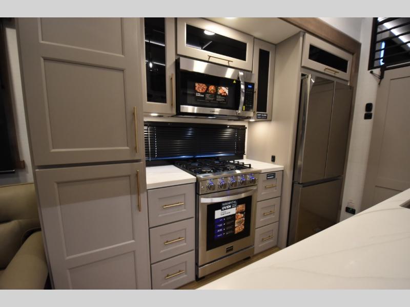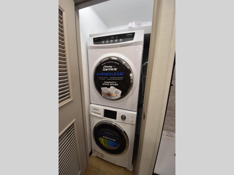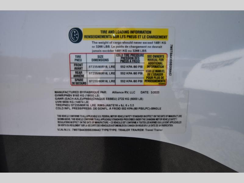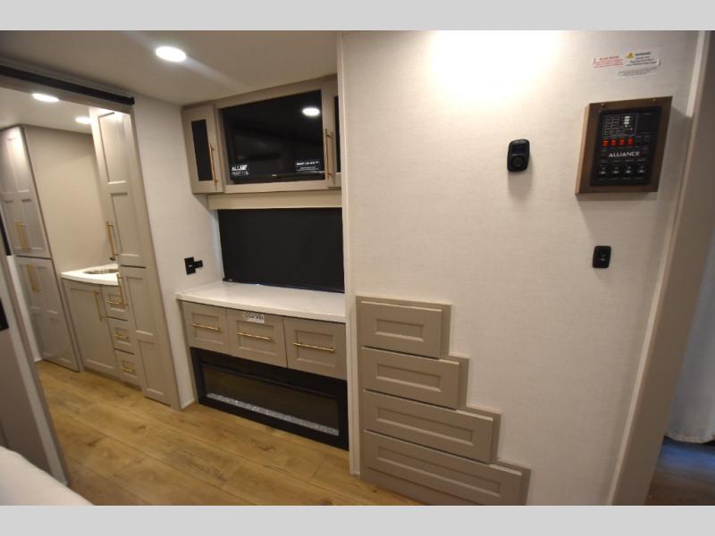 With any Benchmark destination trailer by Alliance RV, you will enjoy luxury features at every turn! The high gloss fiberglass exterior is ultra sleek, and the Azdel composite fiberglass sidewalls add durability so you can camp for years to come. You'll also find a residential exterior garden hose connection outside, along with a powder coated aluminum rear ladder, and an auxiliary LP tank hook up if you want to bring your grill along. Head inside to find hardwood cabinetry, solid surface countertops throughout, oversized windows in all rooms, and MCD roller shades throughout. The 45,000 BTU A/C and 60,000 BTU furnace will keep you comfortable year around, and there is a stackable washer and dryer to make full-time RV living easier than ever!