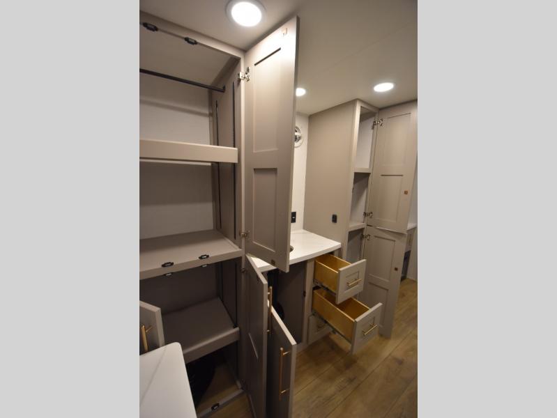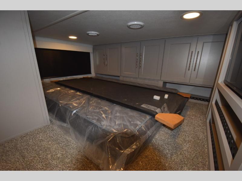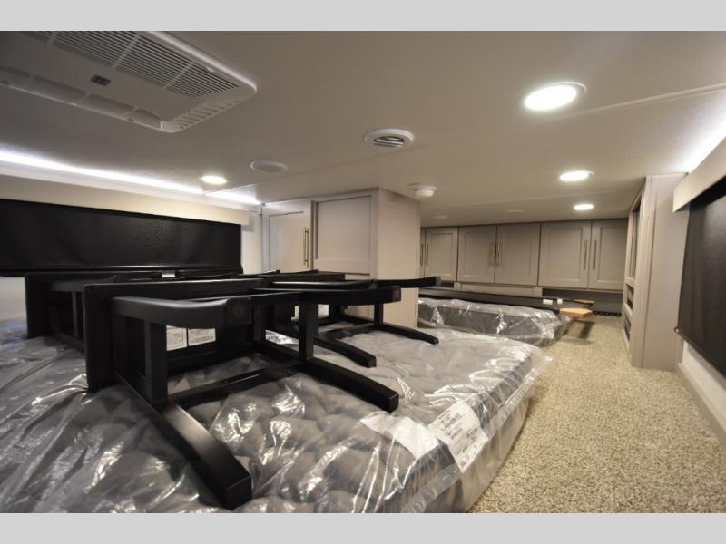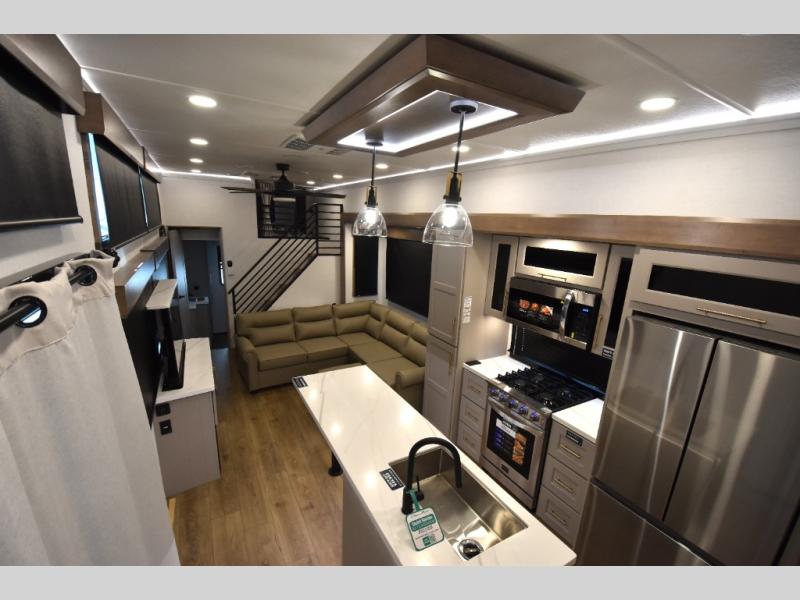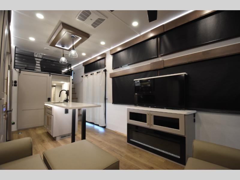This destination trailer is perfect for a big crowd since it has one Power Tiling king bed, three mattress and an L- shape sofa where 10 people can easily fit. Experience the in-home feeling with the amazing kitchen and living room, furnished with a Kitchen island, L- shape sofa and a residential 110 V fridge. Also, you can sense the extreme coziness thanks to the dual fire places and get 24/7 entertainment due to the four TVs along the trailer. Plenty of place can be found in the front and rear loft bedrooms with three wardrobes in total. Lastly the two full bathrooms will allow you to comfortably take a shower after a long day.