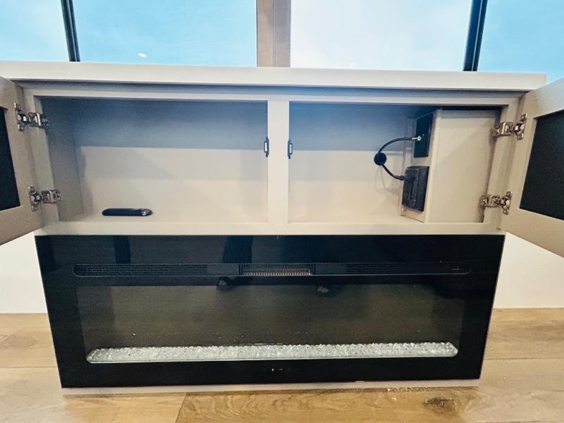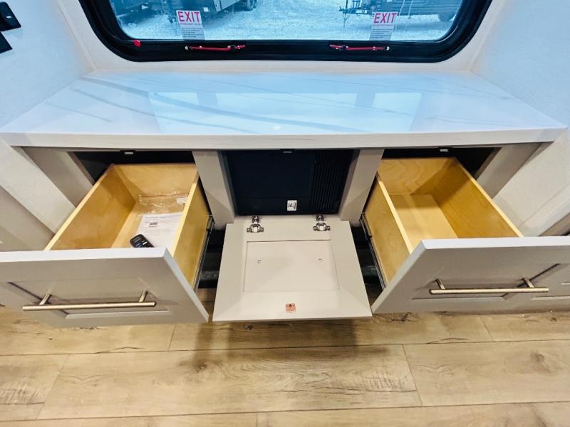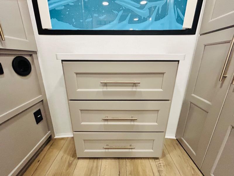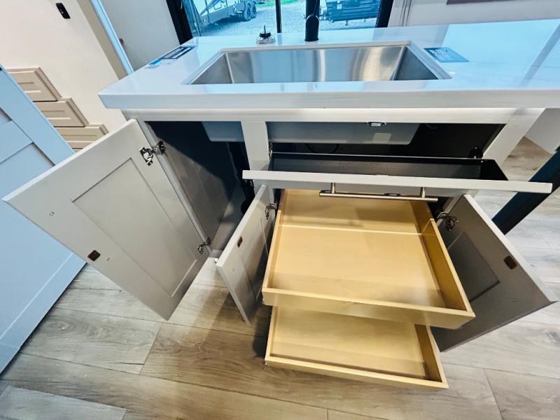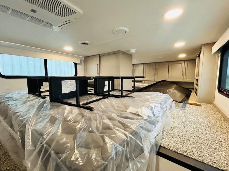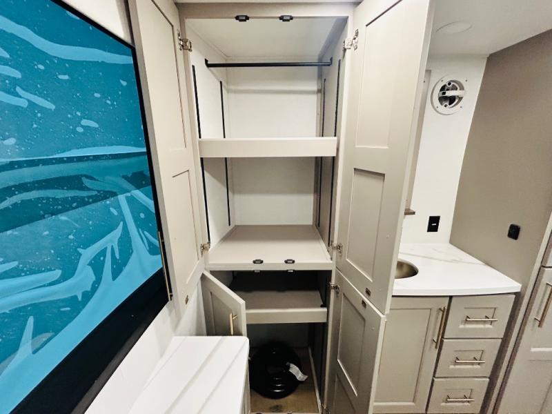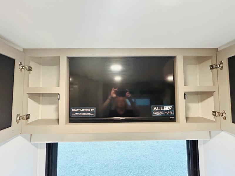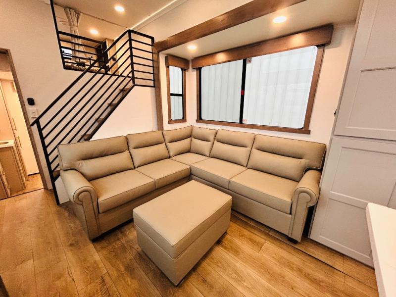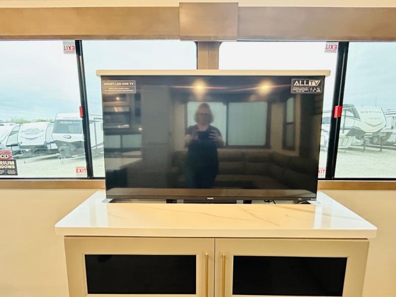 This destination trailer is perfect for a big crowd since it has one Power Tiling king bed, three mattress and an L- shape sofa where 10 people can easily fit. Experience the in-home feeling with the amazing kitchen and living room, furnished with a Kitchen island, L- shape sofa and a residential 110 V fridge. Also, you can sense the extreme coziness thanks to the dual fire places and get 24/7 entertainment due to the four TVs along the trailer. Plenty of place can be found in the front and rear loft bedrooms with three wardrobes in total. Lastly the two full bathrooms will allow you to comfortably take a shower after a long day.