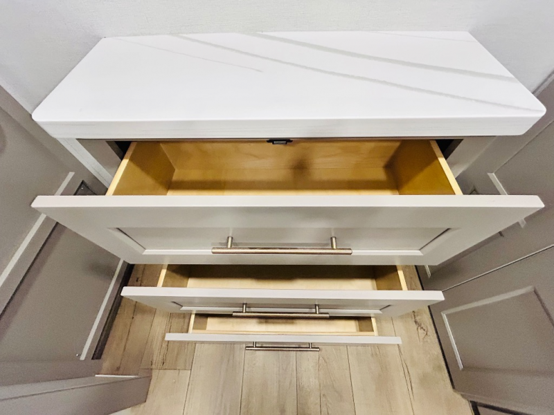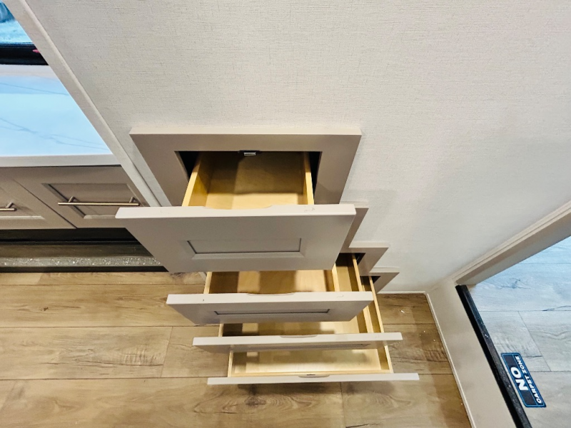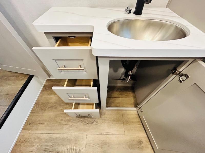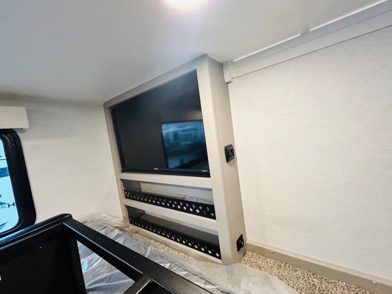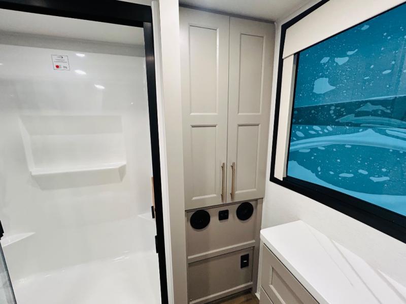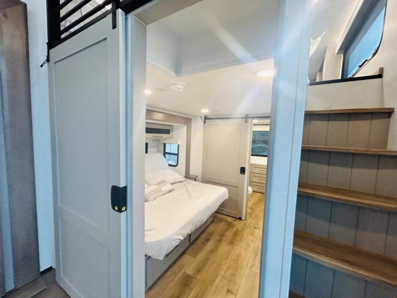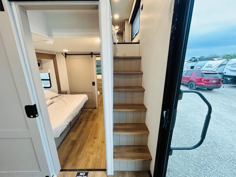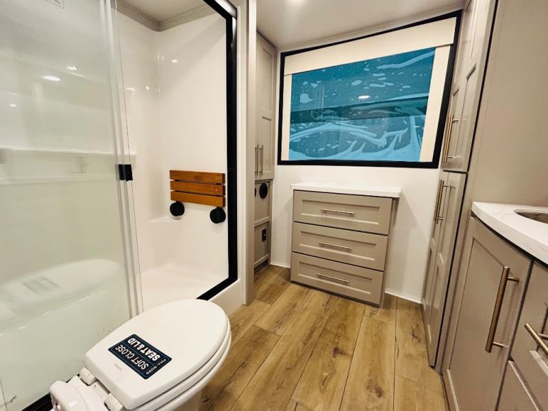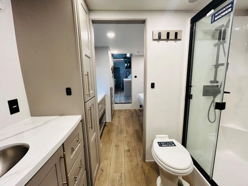 This destination trailer is perfect for a big crowd since it has one Power Tiling king bed, three mattress and an L- shape sofa where 10 people can easily fit. Experience the in-home feeling with the amazing kitchen and living room, furnished with a Kitchen island, L- shape sofa and a residential 110 V fridge. Also, you can sense the extreme coziness thanks to the dual fire places and get 24/7 entertainment due to the four TVs along the trailer. Plenty of place can be found in the front and rear loft bedrooms with three wardrobes in total. Lastly the two full bathrooms will allow you to comfortably take a shower after a long day.