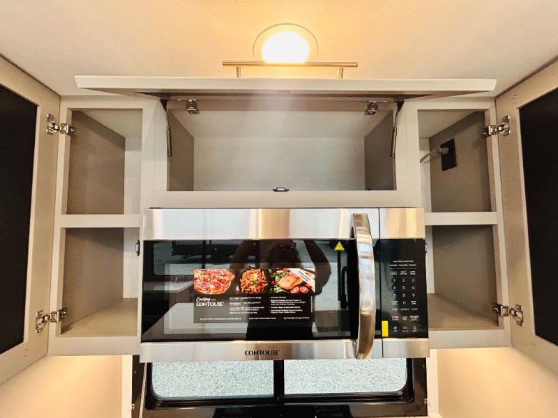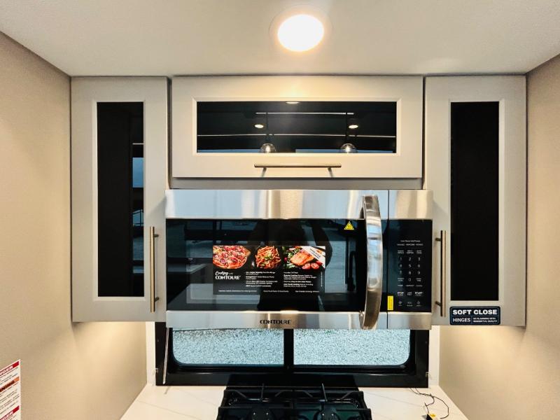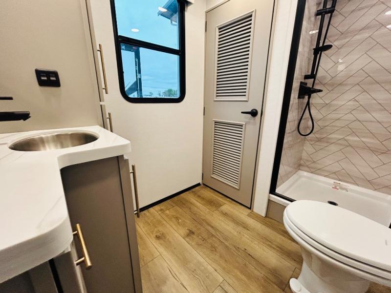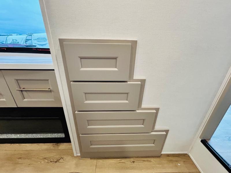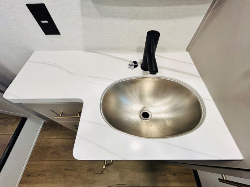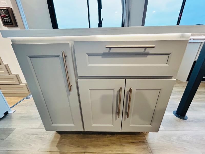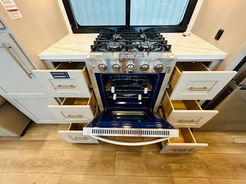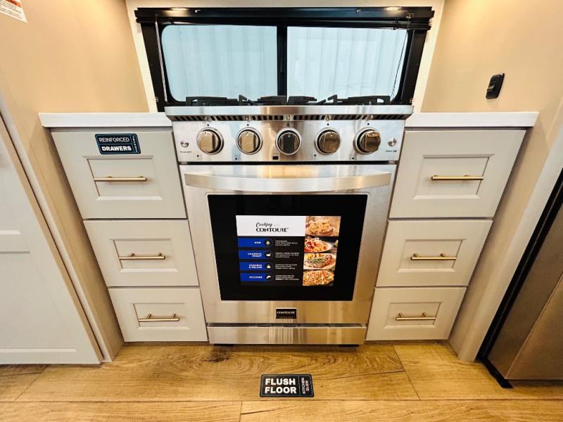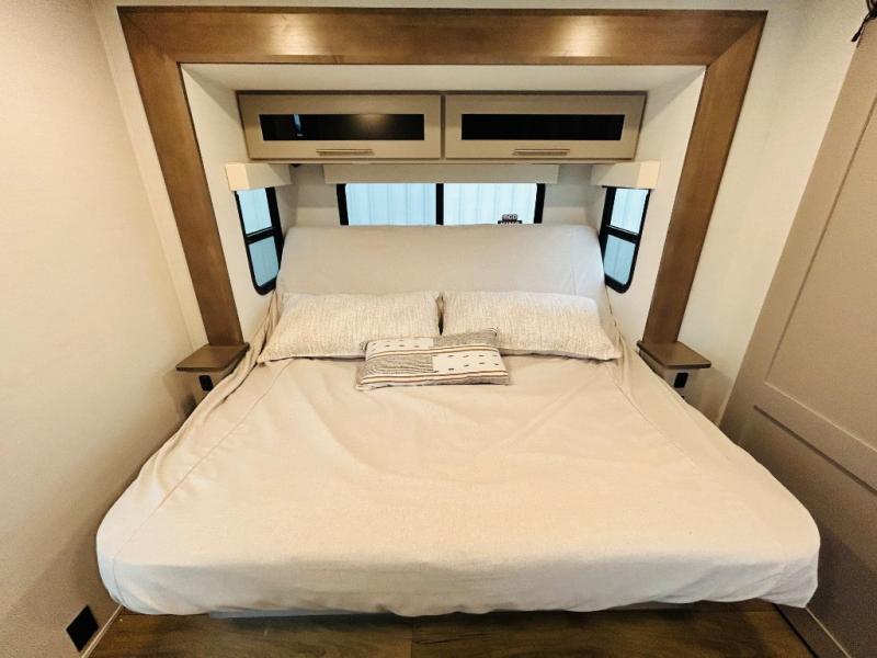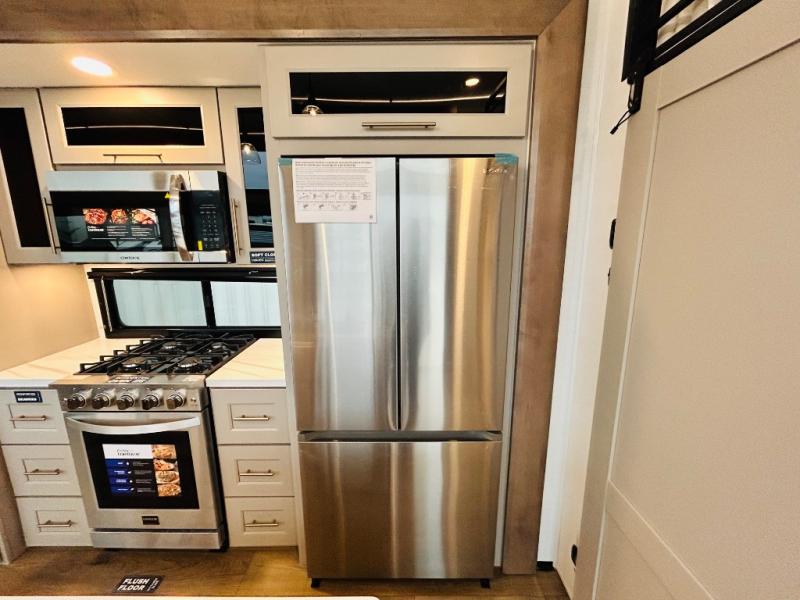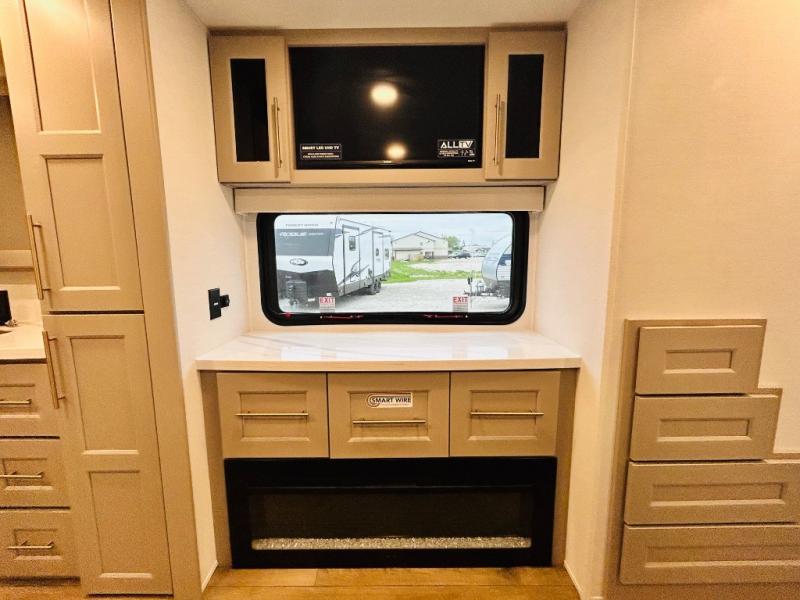 With any Benchmark destination trailer by Alliance RV, you will enjoy luxury features at every turn! The high gloss fiberglass exterior is ultra sleek, and the Azdel composite fiberglass sidewalls add durability so you can camp for years to come. You'll also find a residential exterior garden hose connection outside, along with a powder coated aluminum rear ladder, and an auxiliary LP tank hook up if you want to bring your grill along. Head inside to find hardwood cabinetry, solid surface countertops throughout, oversized windows in all rooms, and MCD roller shades throughout. The 45,000 BTU A/C and 60,000 BTU furnace will keep you comfortable year around, and there is a stackable washer and dryer to make full-time RV living easier than ever!