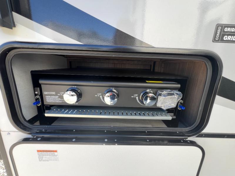 Grab your hiking boots and your sense of adventure for fun camping trips in this single slide out travel trailer. The rear booth dinette includes overhead storage for your things and the sofa slide out is in great view of the 40" HDTV. There is also a fireplace here that will make your space feel more like home plus more storage space, including an entryway closet and storage above the 10 cu. ft. 12V refrigerator. A walk-through bath will take you to the front master bedroom with a queen bed, wardrobe nightstands, plus its own exterior entry door!
