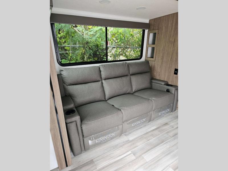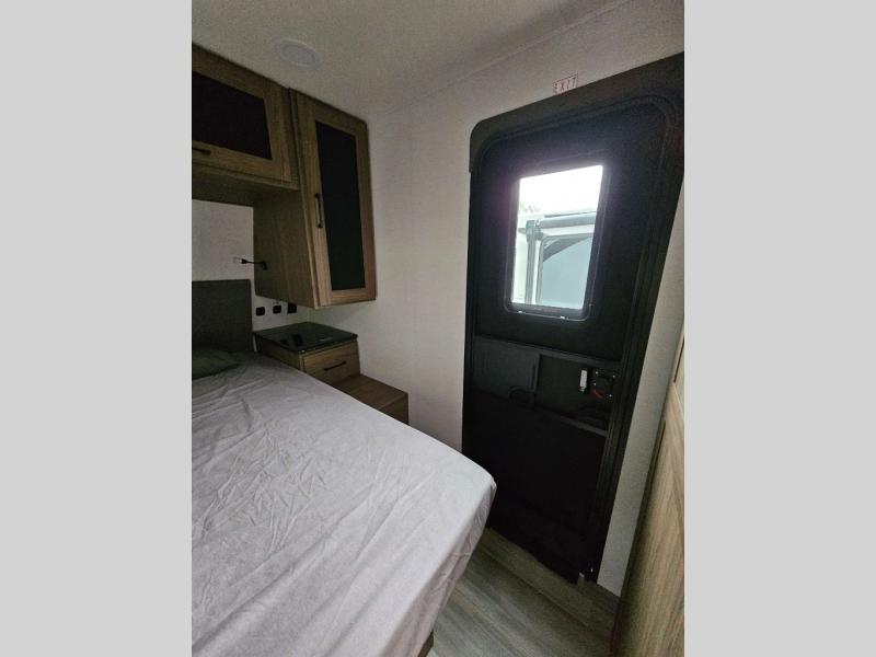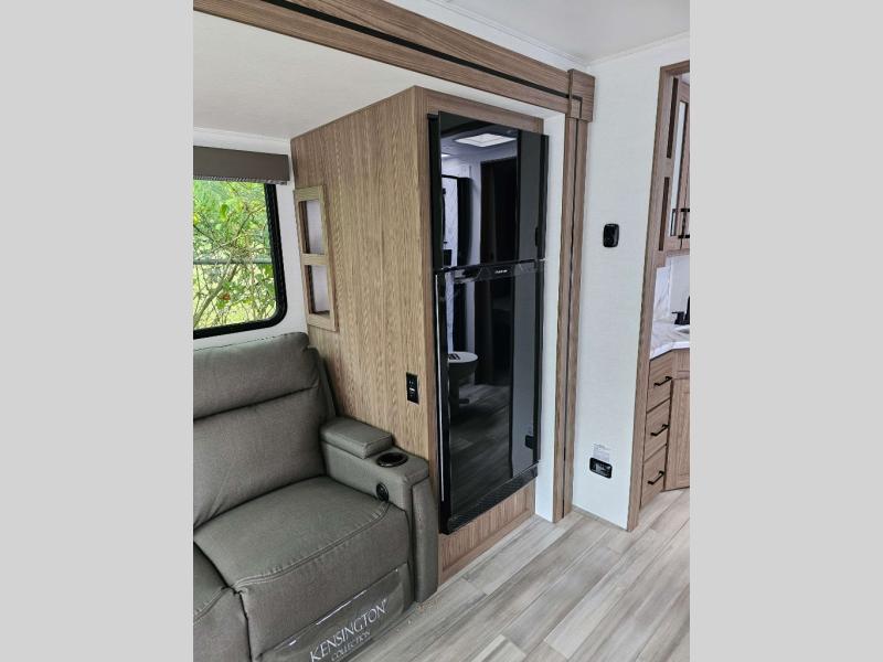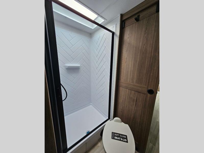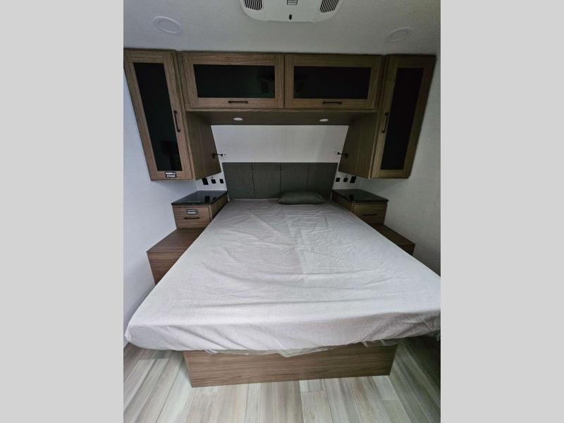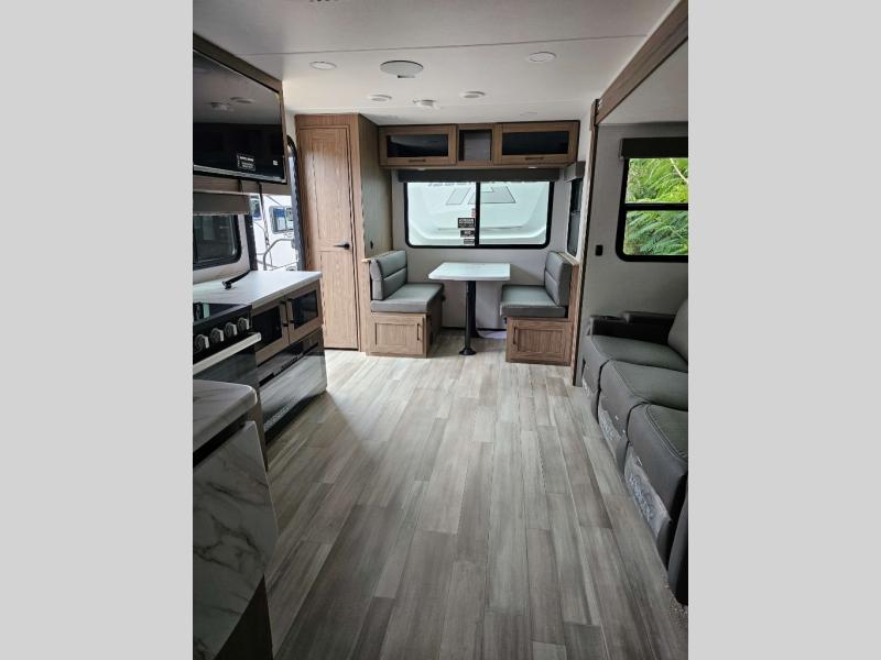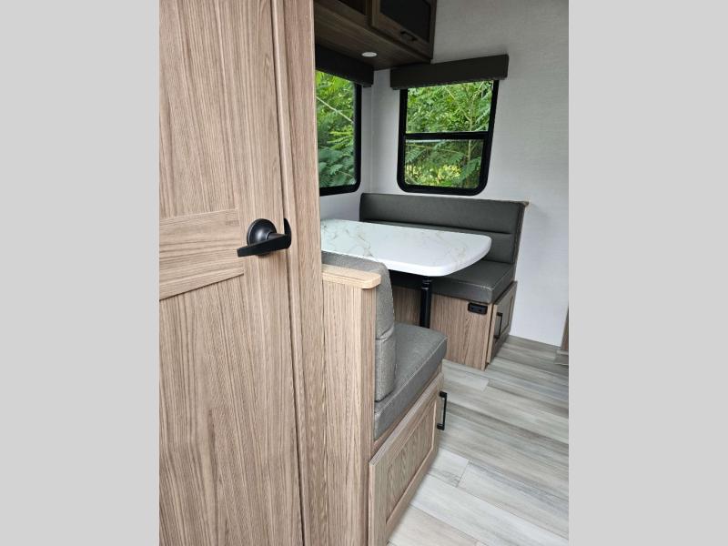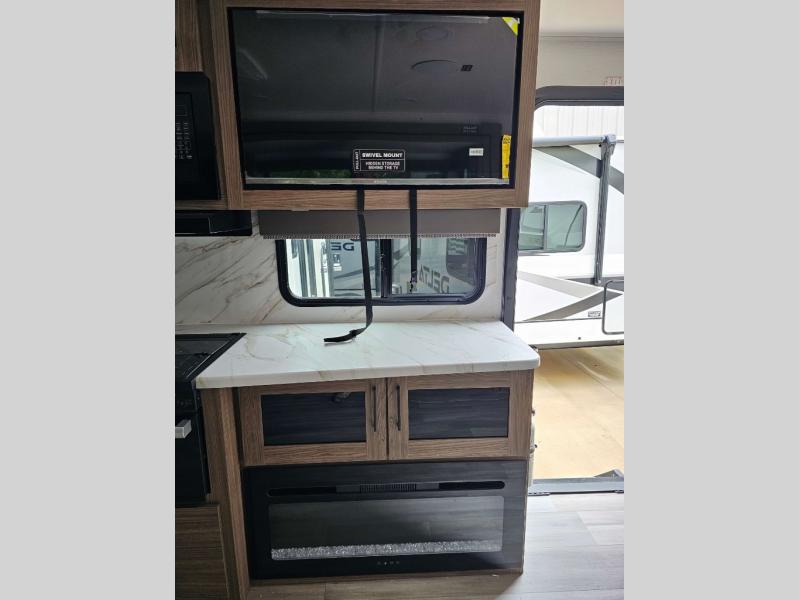 Grab your hiking boots and your sense of adventure for fun camping trips in this single slide out travel trailer. The rear booth dinette includes overhead storage for your things and the sofa slide out is in great view of the 40" HDTV. There is also a fireplace here that will make your space feel more like home plus more storage space, including an entryway closet and storage above the 10 cu. ft. 12V refrigerator. A walk-through bath will take you to the front master bedroom with a queen bed, wardrobe nightstands, plus its own exterior entry door!
