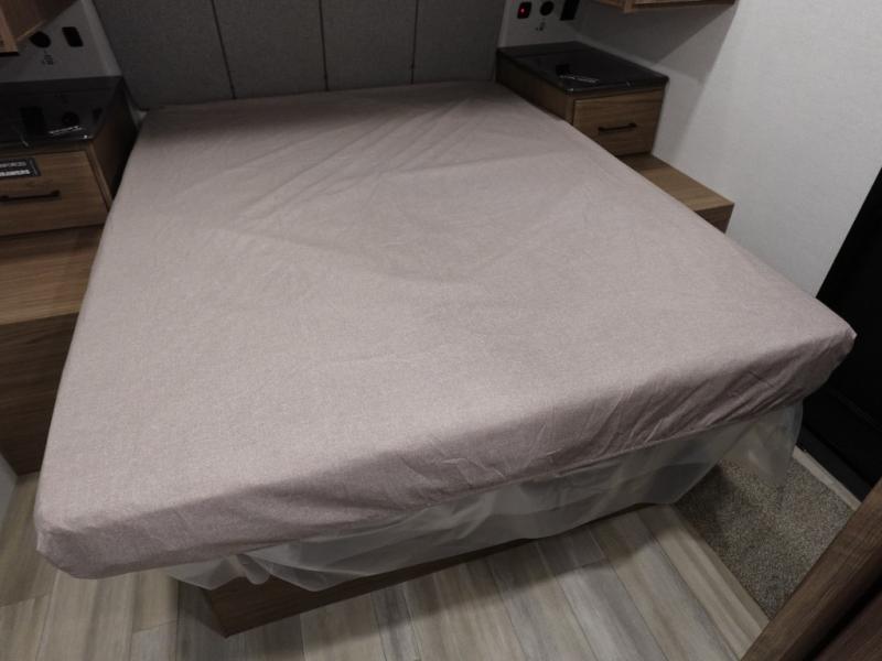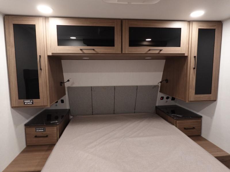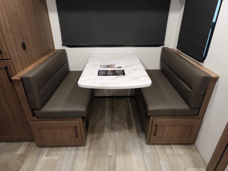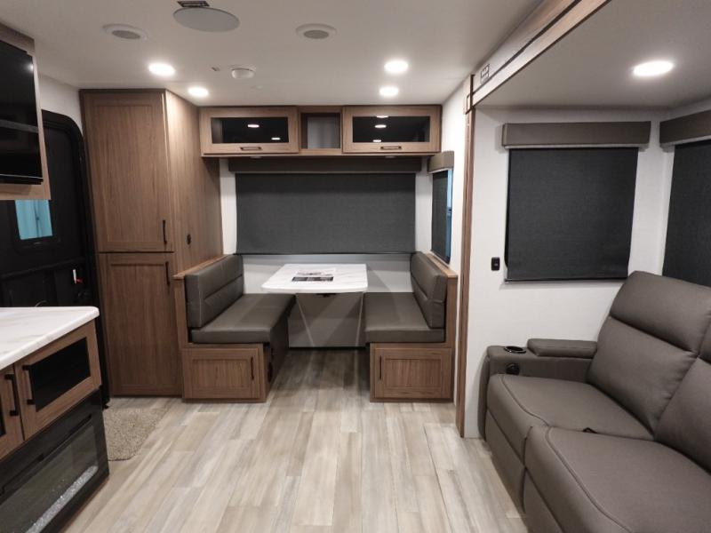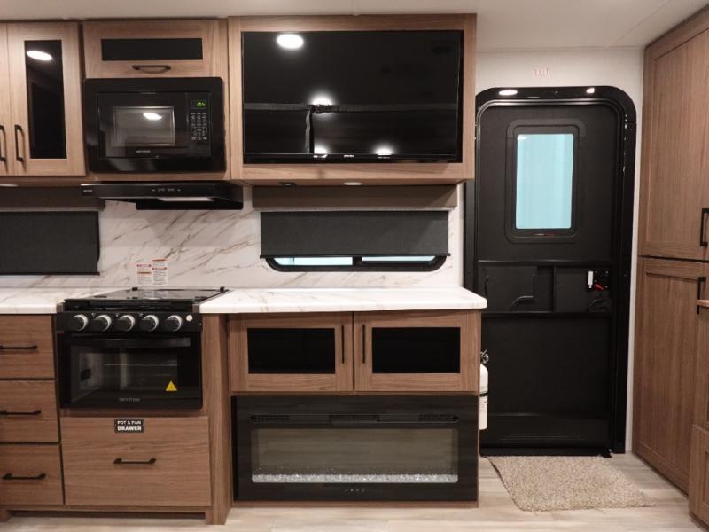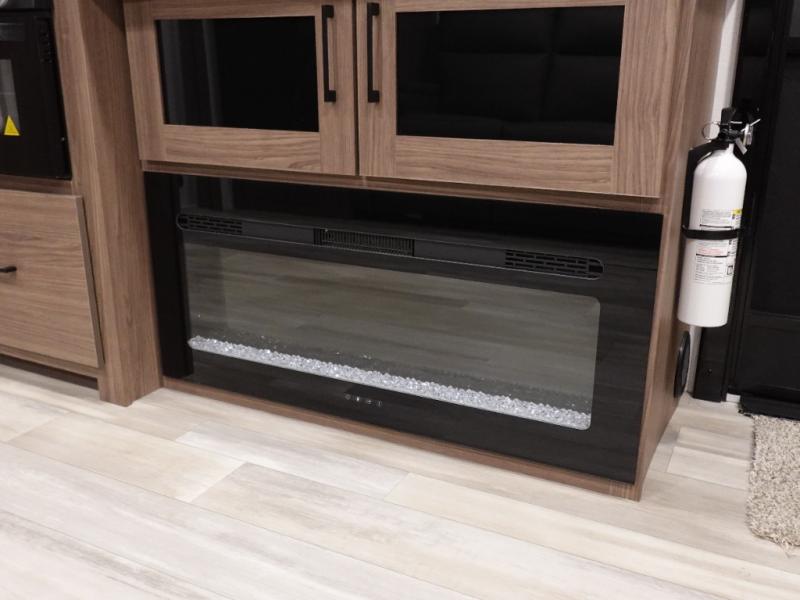 Grab your hiking boots and your sense of adventure for fun camping trips in this single slide out travel trailer. The rear booth dinette includes overhead storage for your things and the sofa slide out is in great view of the 40" HDTV. There is also a fireplace here that will make your space feel more like home plus more storage space, including an entryway closet and storage above the 10 cu. ft. 12V refrigerator. A walk-through bath will take you to the front master bedroom with a queen bed, wardrobe nightstands, plus its own exterior entry door!