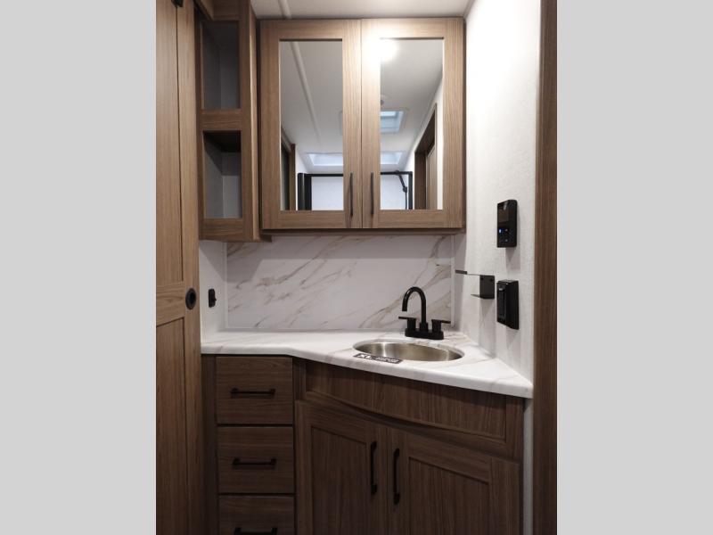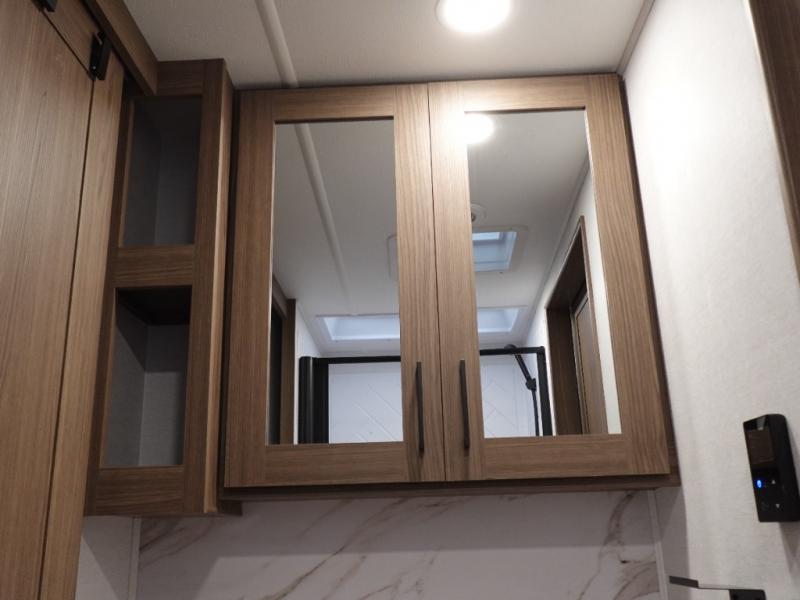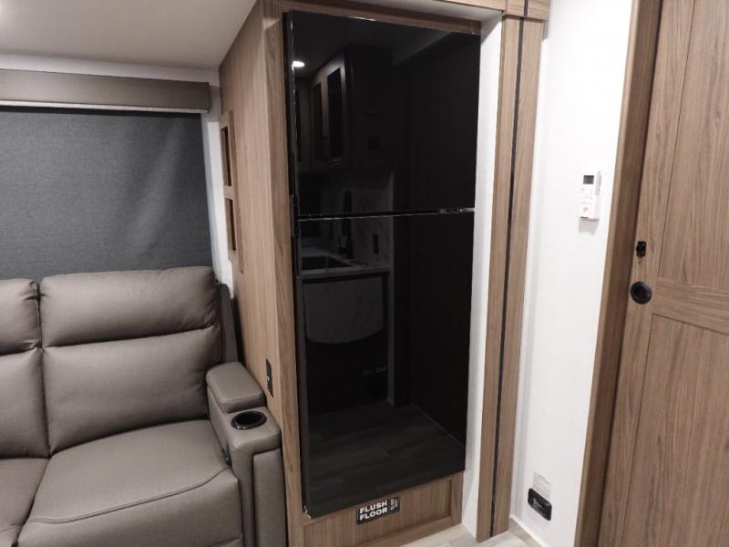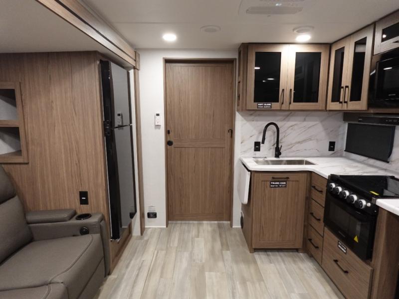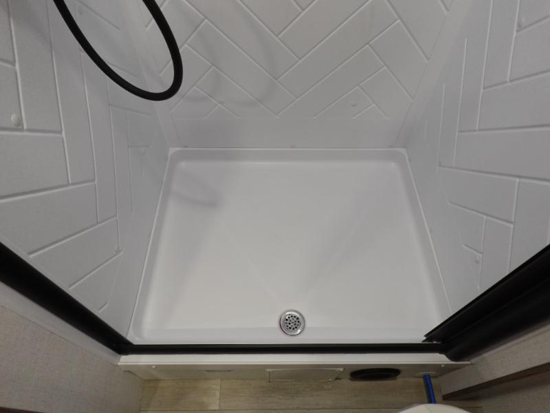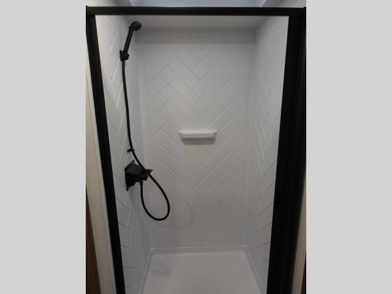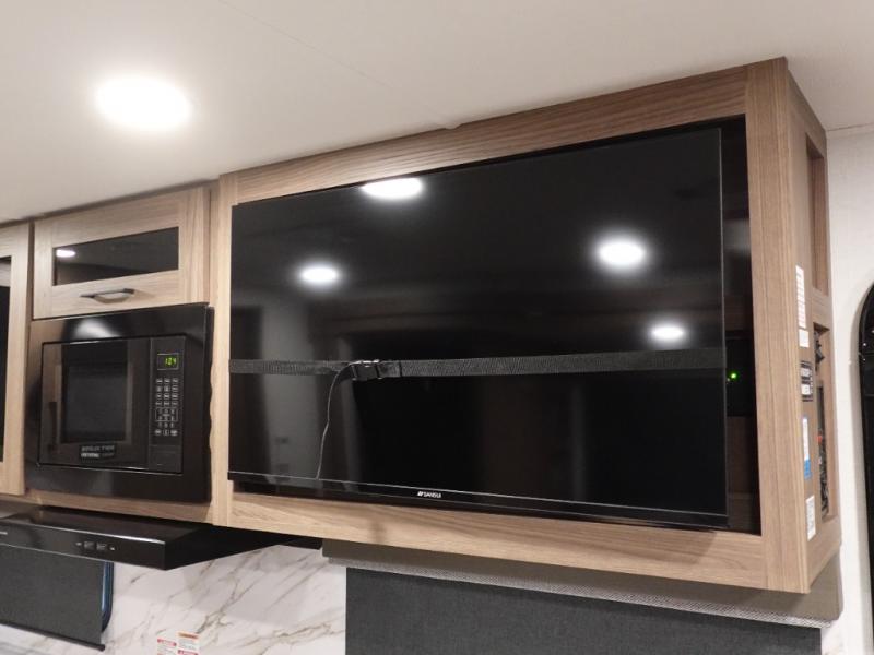 Grab your hiking boots and your sense of adventure for fun camping trips in this single slide out travel trailer. The rear booth dinette includes overhead storage for your things and the sofa slide out is in great view of the 40" HDTV. There is also a fireplace here that will make your space feel more like home plus more storage space, including an entryway closet and storage above the 10 cu. ft. 12V refrigerator. A walk-through bath will take you to the front master bedroom with a queen bed, wardrobe nightstands, plus its own exterior entry door!
