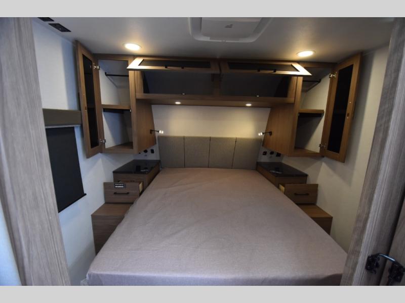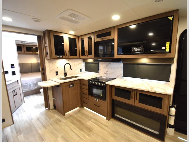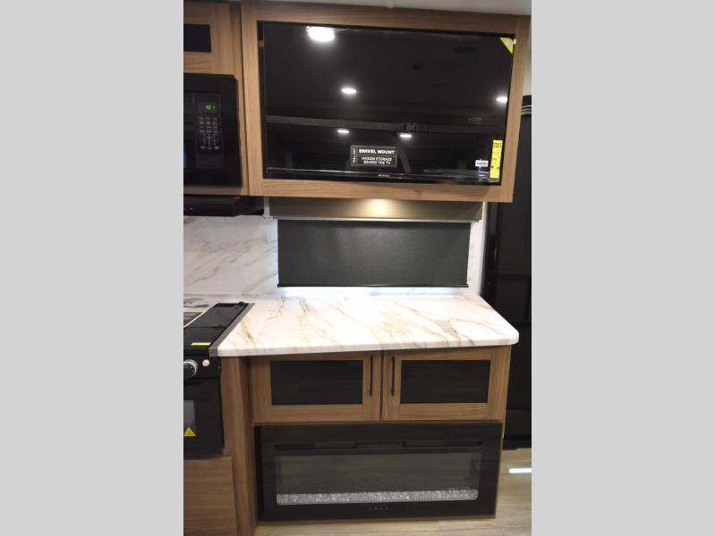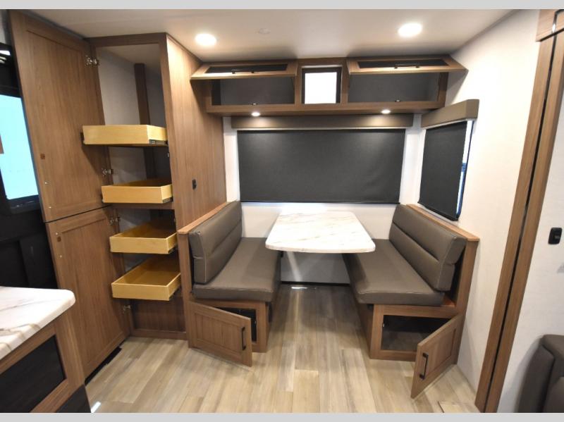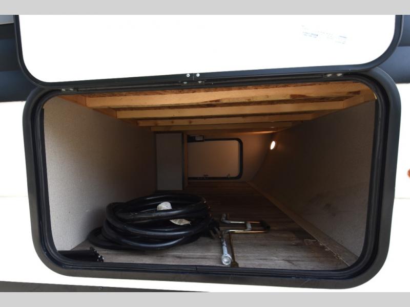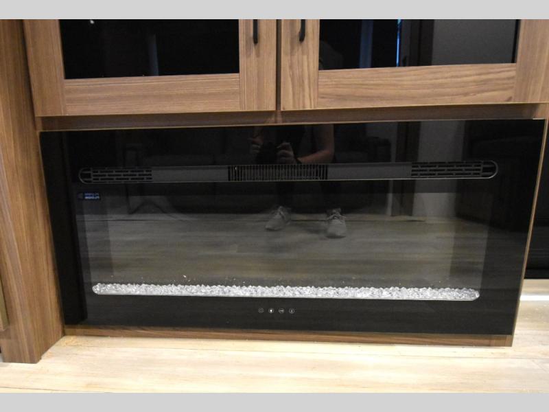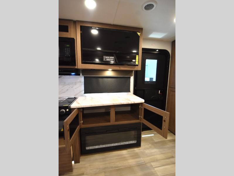 Grab your hiking boots and your sense of adventure for fun camping trips in this single slide out travel trailer. The rear booth dinette includes overhead storage for your things and the sofa slide out is in great view of the 40" HDTV. There is also a fireplace here that will make your space feel more like home plus more storage space, including an entryway closet and storage above the 10 cu. ft. 12V refrigerator. A walk-through bath will take you to the front master bedroom with a queen bed, wardrobe nightstands, plus its own exterior entry door!