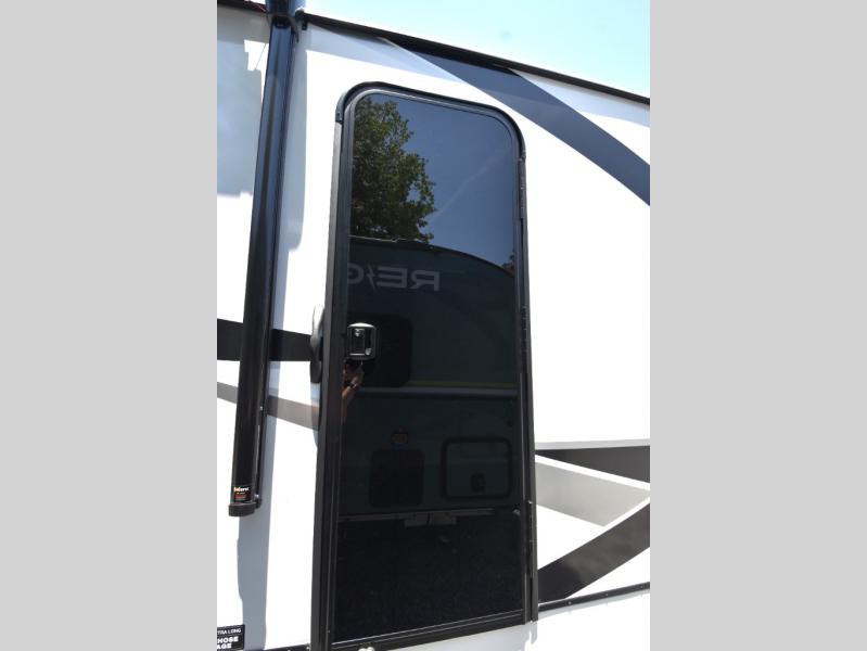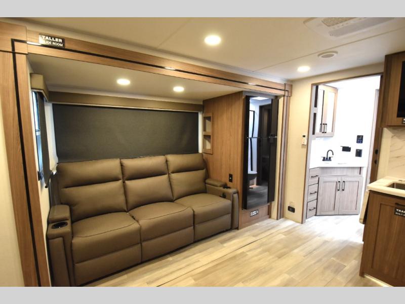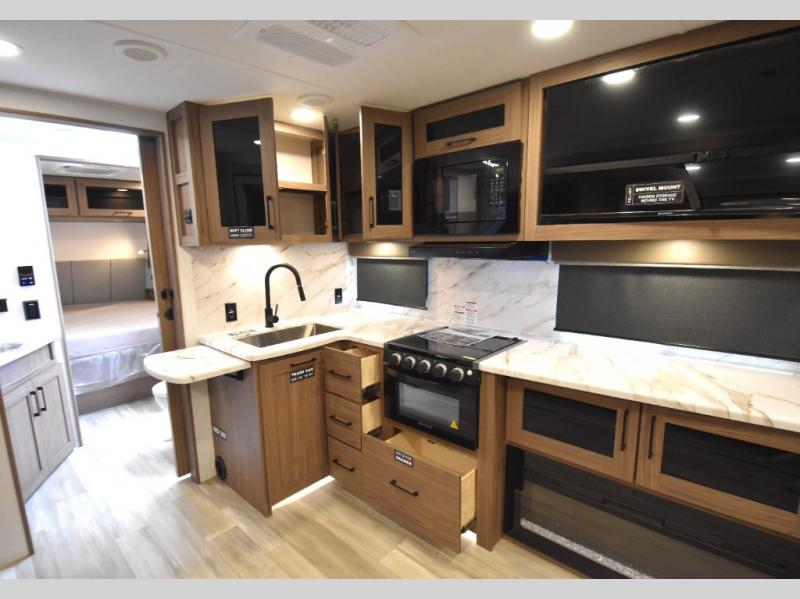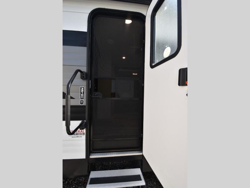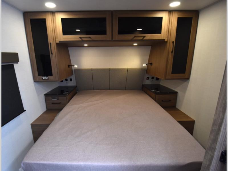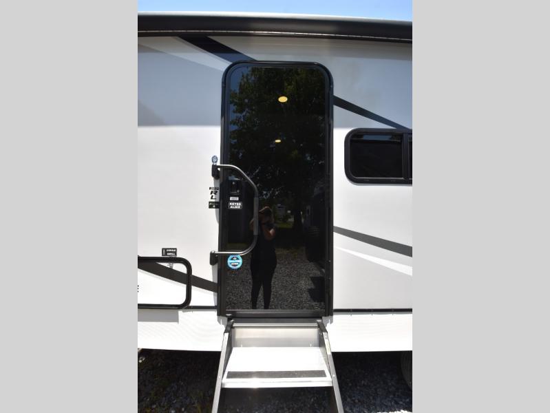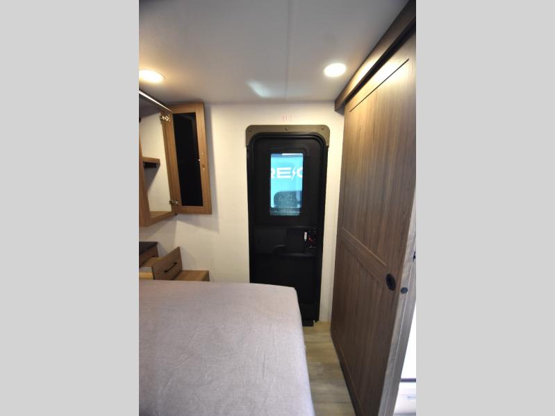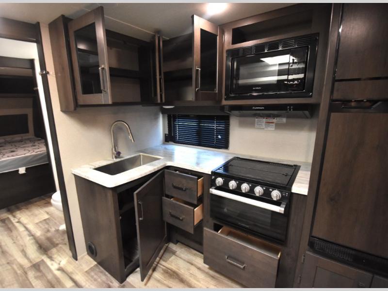 Grab your hiking boots and your sense of adventure for fun camping trips in this single slide out travel trailer. The rear booth dinette includes overhead storage for your things and the sofa slide out is in great view of the 40" HDTV. There is also a fireplace here that will make your space feel more like home plus more storage space, including an entryway closet and storage above the 10 cu. ft. 12V refrigerator. A walk-through bath will take you to the front master bedroom with a queen bed, wardrobe nightstands, plus its own exterior entry door!