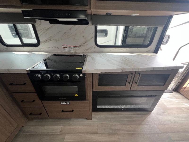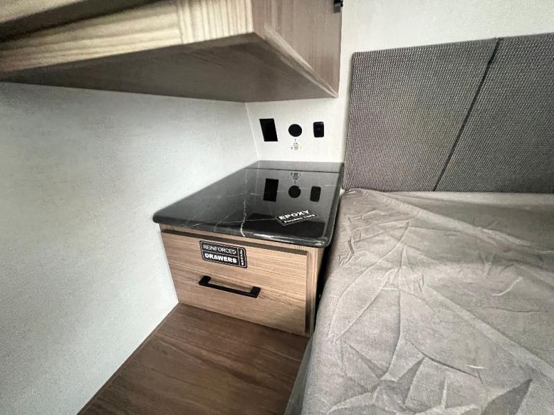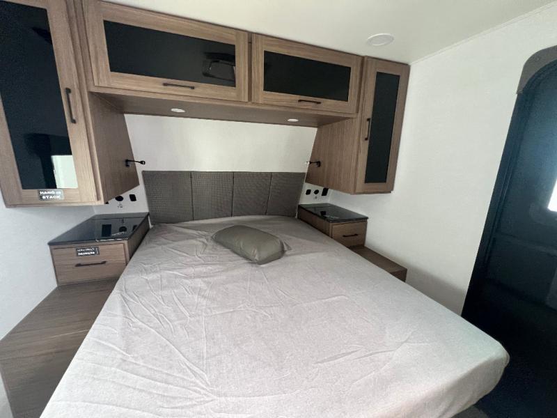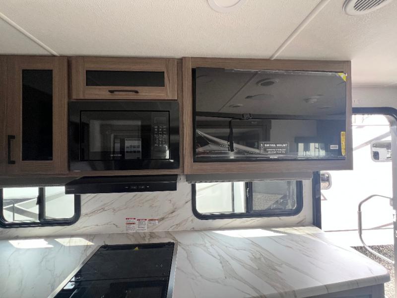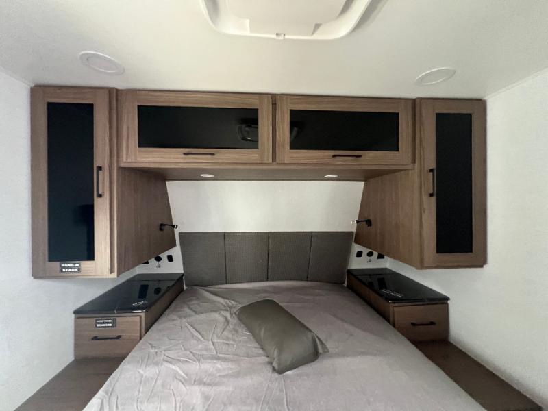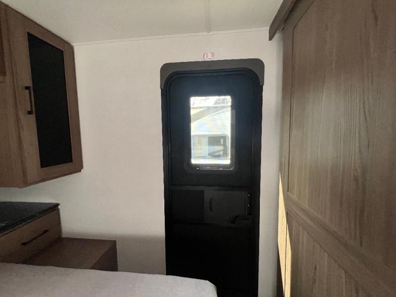 Grab your hiking boots and your sense of adventure for fun camping trips in this single slide out travel trailer. The rear booth dinette includes overhead storage for your things and the sofa slide out is in great view of the 40" HDTV. There is also a fireplace here that will make your space feel more like home plus more storage space, including an entryway closet and storage above the 10 cu. ft. 12V refrigerator. A walk-through bath will take you to the front master bedroom with a queen bed, wardrobe nightstands, plus its own exterior entry door!