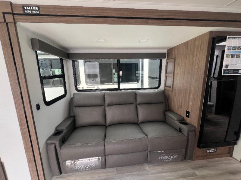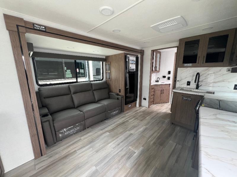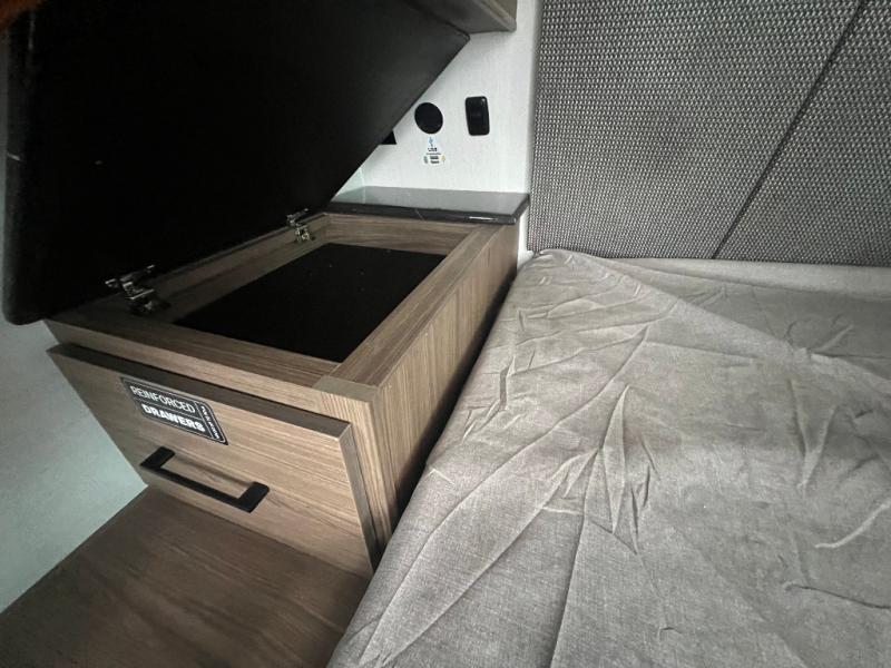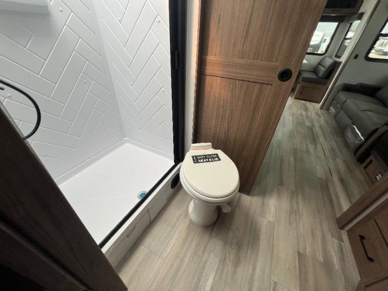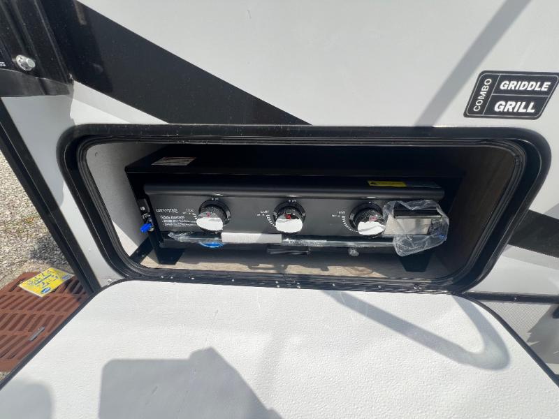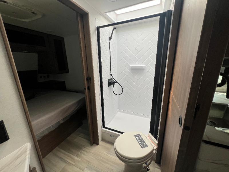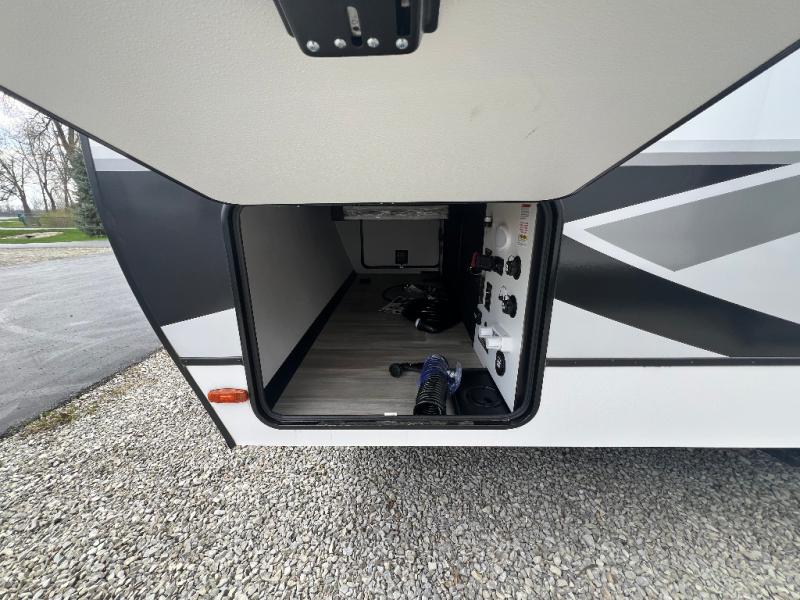 Grab your hiking boots and your sense of adventure for fun camping trips in this single slide out travel trailer. The rear booth dinette includes overhead storage for your things and the sofa slide out is in great view of the 40" HDTV. There is also a fireplace here that will make your space feel more like home plus more storage space, including an entryway closet and storage above the 10 cu. ft. 12V refrigerator. A walk-through bath will take you to the front master bedroom with a queen bed, wardrobe nightstands, plus its own exterior entry door!
