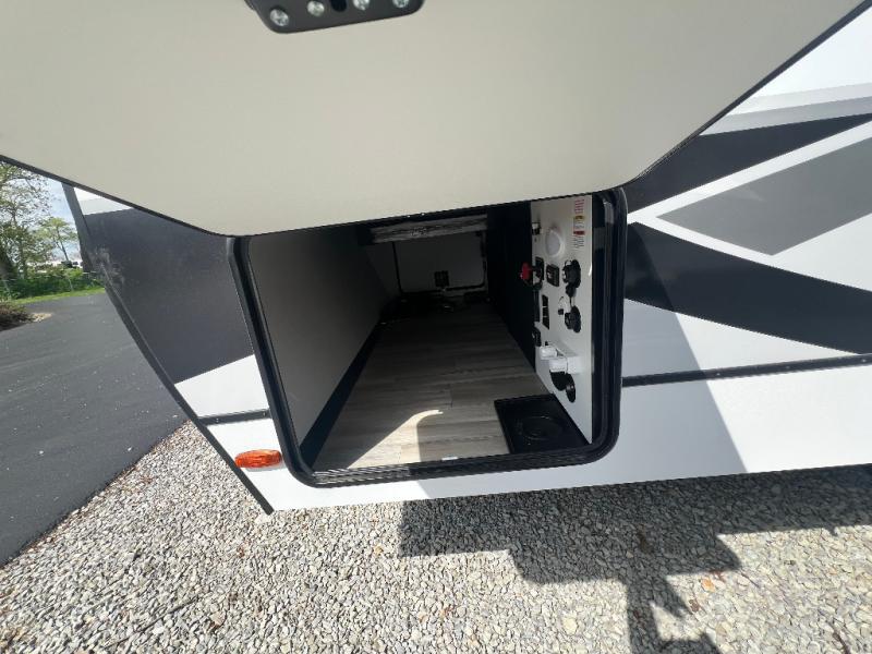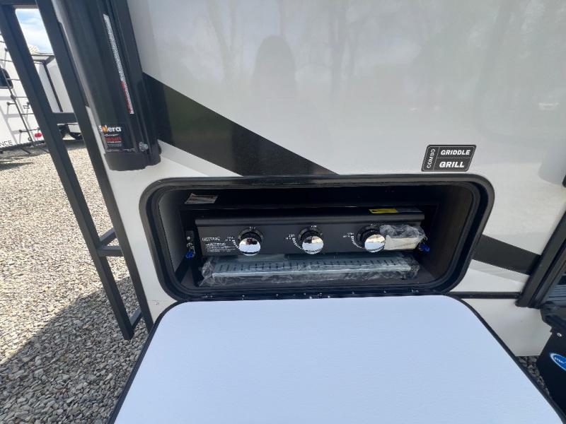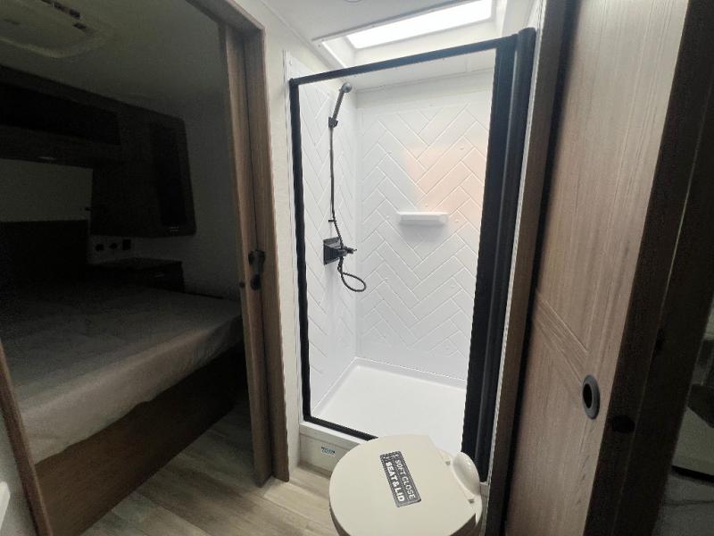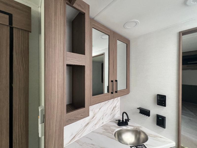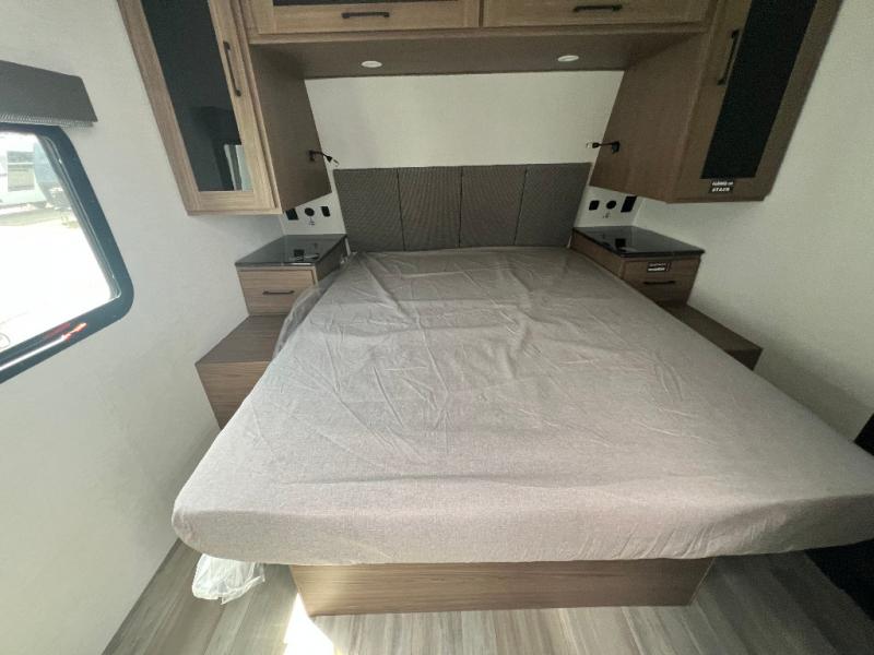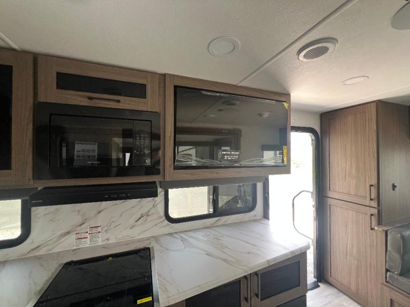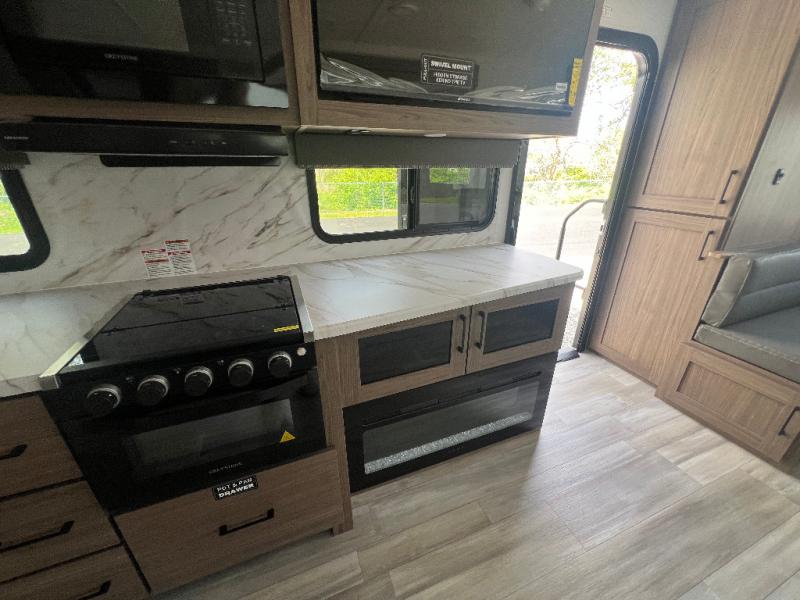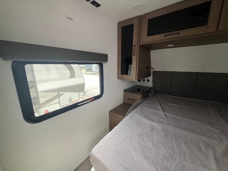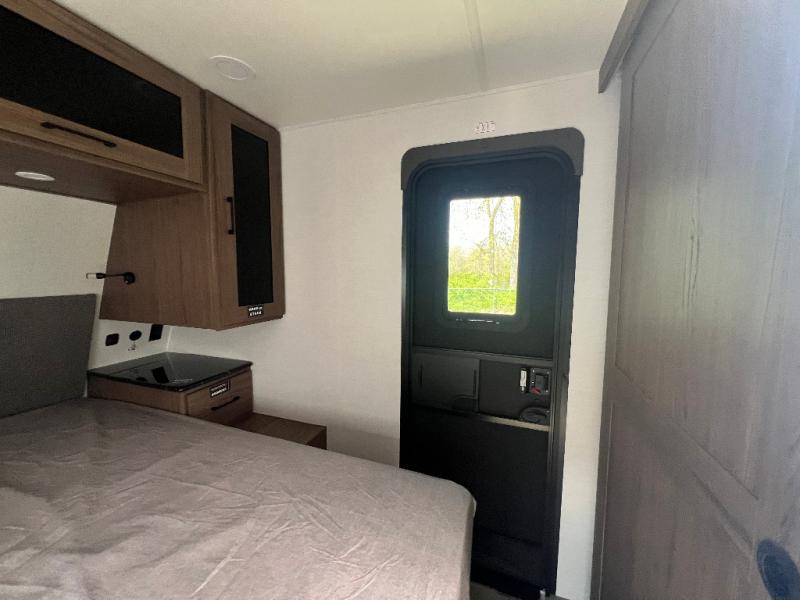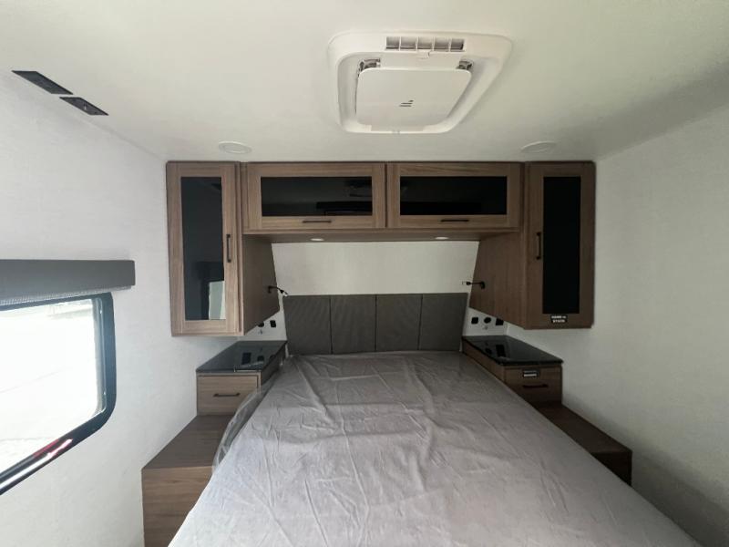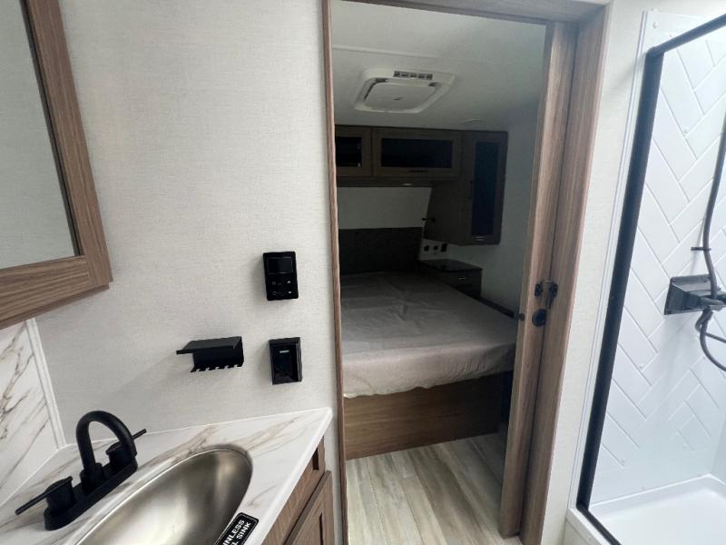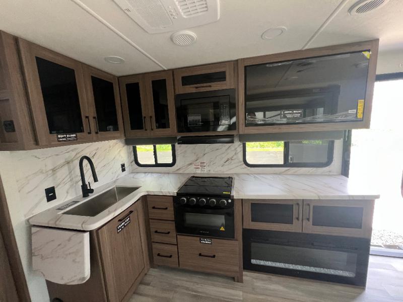 Grab your hiking boots and your sense of adventure for fun camping trips in this single slide out travel trailer. The rear booth dinette includes overhead storage for your things and the sofa slide out is in great view of the 40" HDTV. There is also a fireplace here that will make your space feel more like home plus more storage space, including an entryway closet and storage above the 10 cu. ft. 12V refrigerator. A walk-through bath will take you to the front master bedroom with a queen bed, wardrobe nightstands, plus its own exterior entry door!