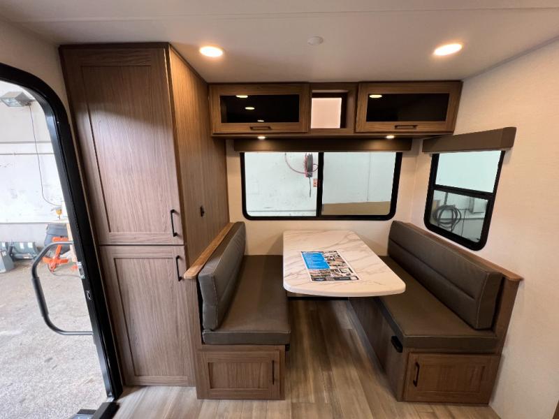 Grab your hiking boots and your sense of adventure for fun camping trips in this single slide out travel trailer. The rear booth dinette includes overhead storage for your things and the sofa slide out is in great view of the 40" HDTV. There is also a fireplace here that will make your space feel more like home plus more storage space, including an entryway closet and storage above the 10 cu. ft. 12V refrigerator. A walk-through bath will take you to the front master bedroom with a queen bed, wardrobe nightstands, plus its own exterior entry door!