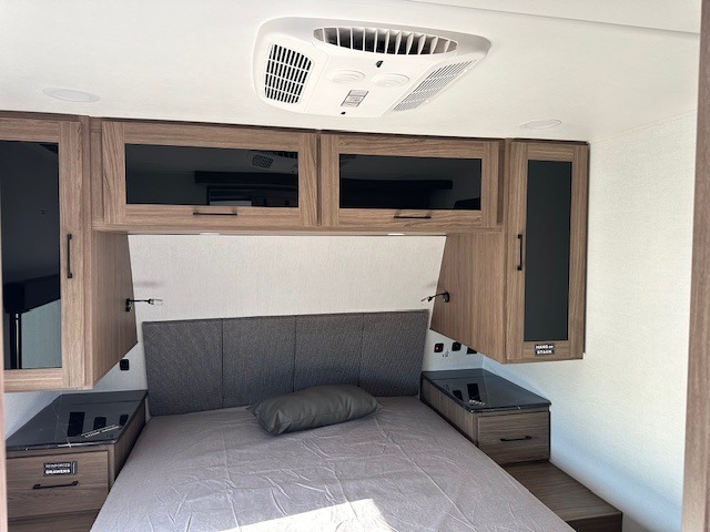 Grab your hiking boots and your sense of adventure for fun camping trips in this single slide out travel trailer. The rear booth dinette includes overhead storage for your things and the sofa slide out is in great view of the 40" HDTV. There is also a fireplace here that will make your space feel more like home plus more storage space, including an entryway pantry and storage above the 10 cu. ft. 12V refrigerator. A walk-through bath will take you to the front master bedroom with a queen bed, wardrobe nightstands, plus its own exterior entry door!