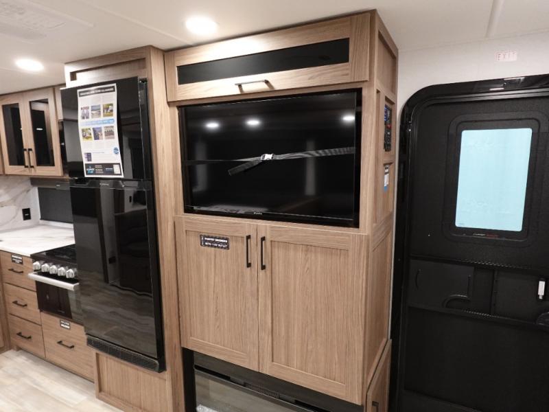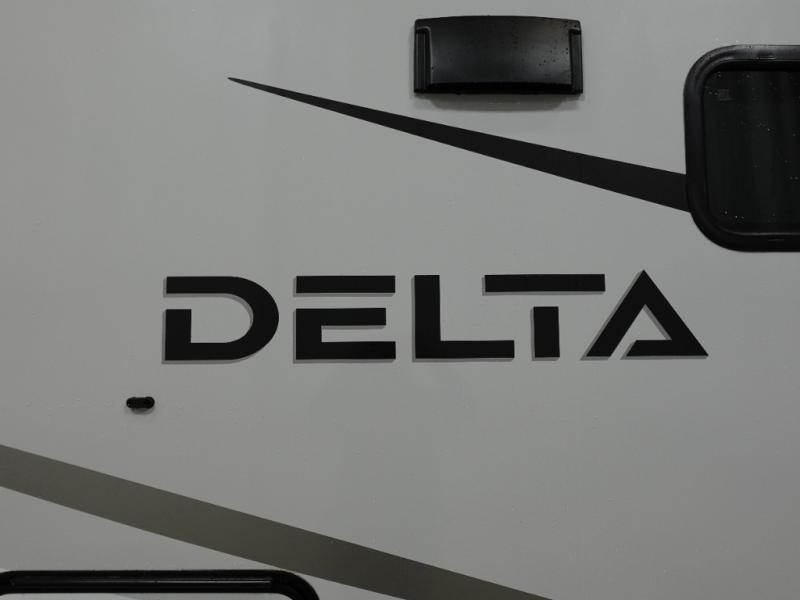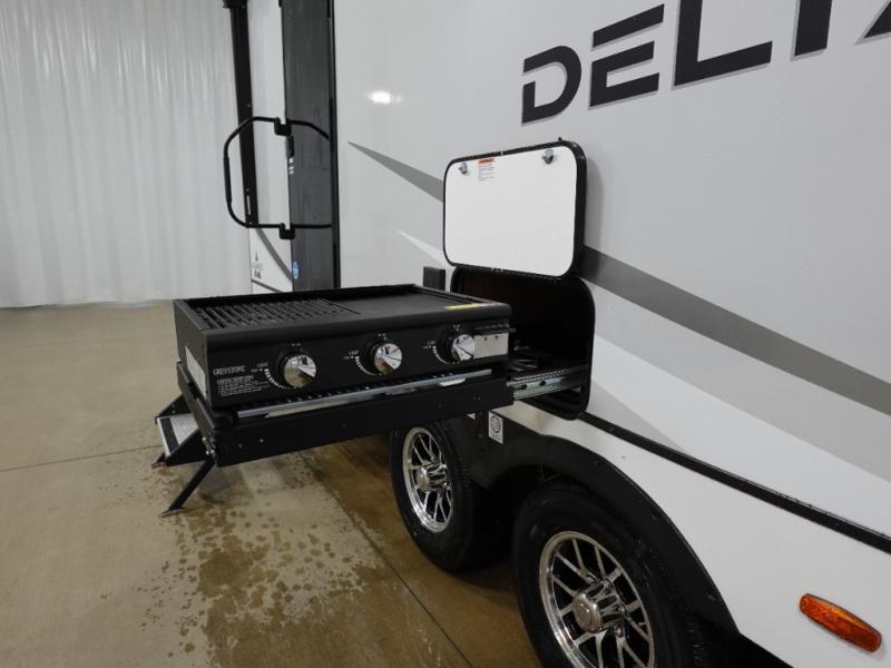 You will love all of your adventures with this Delta travel trailer in tow! This unit is perfect for a couple or even a family of four with a queen bed in the front private bedroom, and also using the U-shaped dinette once converted for more sleeping space. The U-shaped dinette is great for gathering for meals, a board game or game of cards, and the theater seat sofa is directly opposite a 40" HDTV which makes viewing enjoyable. You can easily prepare all of your favorite meals and snacks with the kitchen amenities provided inside. A three burner range allows you to easily cook indoors, or you can cook outside using the outdoor griddle/grill if you like. There is a 10 cu. ft. 12V refrigerator to keep all of your perishables and drinks nice and cold, plus a large sink for dishes and cleaning up, and a convenient pull-out trash can and flip-up counter extension as well. You will also appreciate the full rear bath featuring a 30" x 36" shower, toilet, vanity with sink, and linen cabinet for your towels and toiletries.