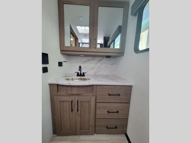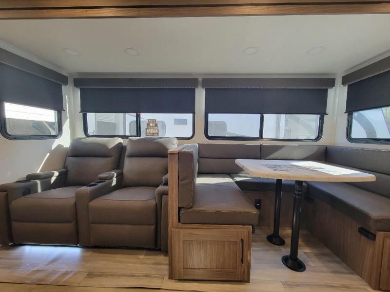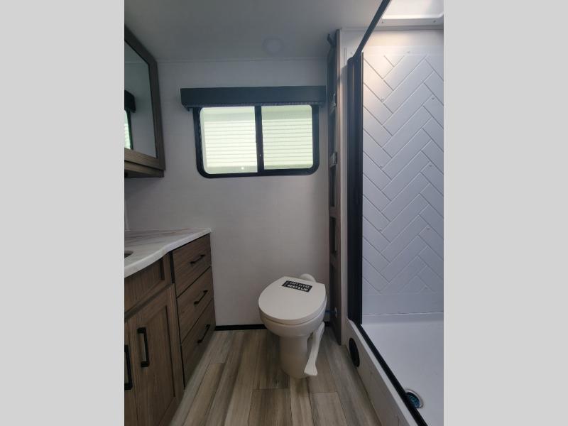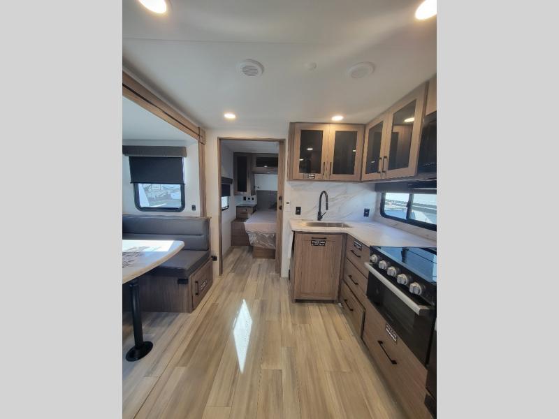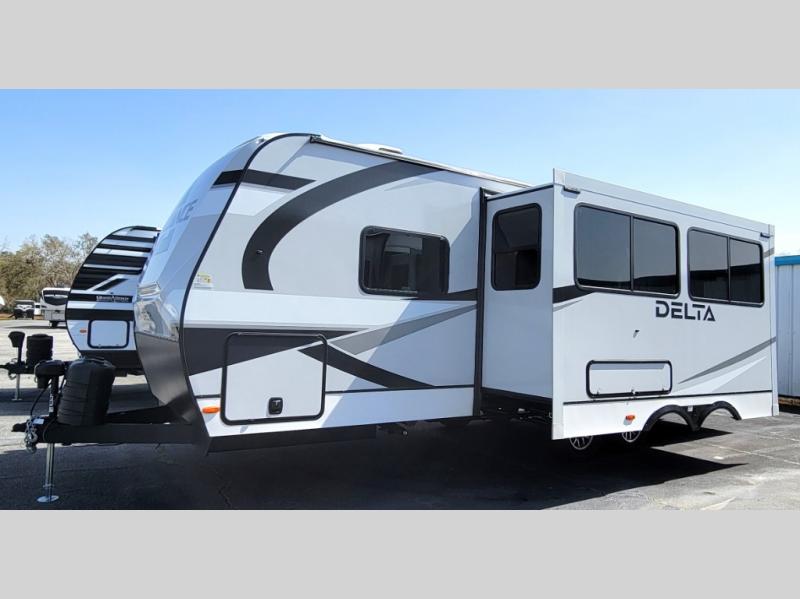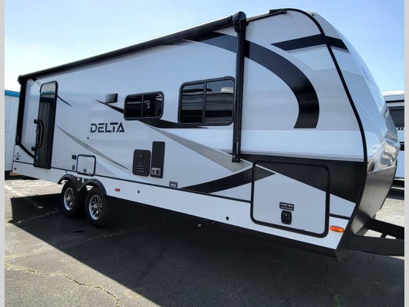You will love all of your adventures with this Delta travel trailer in tow! This unit is perfect for a couple or even a family of four or six with a queen bed in the front private bedroom, and also using the sofa and U-shaped dinette once converted for more sleeping space. The U-shaped dinette is great for gathering for meals, a board game or game of cards, and the sofa is directly opposite a 40" HDTV which makes viewing enjoyable. You can easily prepare all of your favorite meals and snacks with the kitchen amenities provided inside. A three burner range allows you to easily cook indoors, or you can cook outside using the outdoor griddle/grill if you like. There is a 10 cu. ft. 12V refrigerator to keep all of your perishables and drinks nice and cold, plus a large sink for dishes and cleaning up, and a convenient pull-out trash can and flip-up counter extension as well. You will also appreciate the full rear bath featuring a 30" x 36" shower, toilet, vanity with sink, and linen cabinet for your towels and toiletries.