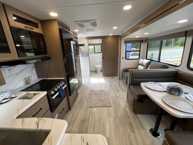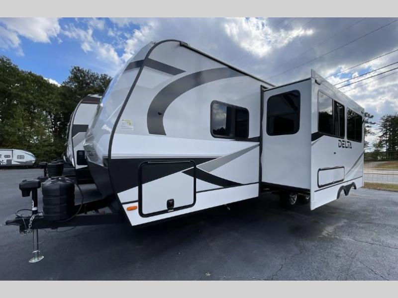 You will love all of your adventures with this Delta travel trailer in tow! This unit is perfect for a couple or even a family of four or six with a queen bed in the front private bedroom, and also using the sofa and U-shaped dinette once converted for more sleeping space. The U-shaped dinette is great for gathering for meals, a board game or game of cards, and the sofa is directly opposite a 40" HDTV which makes viewing enjoyable. You can easily prepare all of your favorite meals and snacks with the kitchen amenities provided inside. A three burner range allows you to easily cook indoors, or you can cook outside using the outdoor griddle/grill if you like. There is a 10 cu. ft. 12V refrigerator to keep all of your perishables and drinks nice and cold, plus a large sink for dishes and cleaning up, and a convenient pull-out trash can and flip-up counter extension as well. You will also appreciate the full rear bath featuring a 30" x 36" shower, toilet, vanity with sink, and linen cabinet for your towels and toiletries.