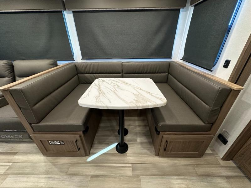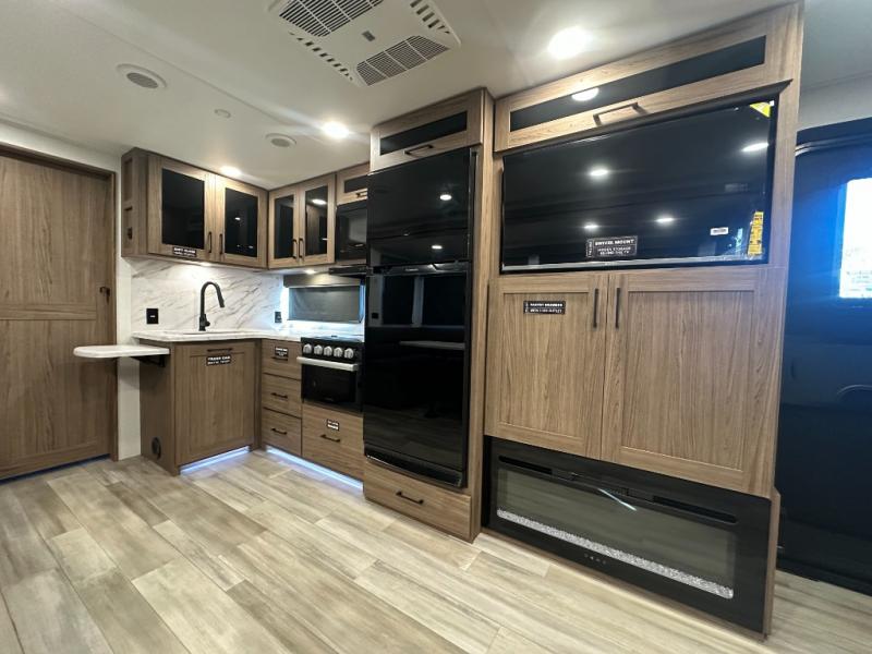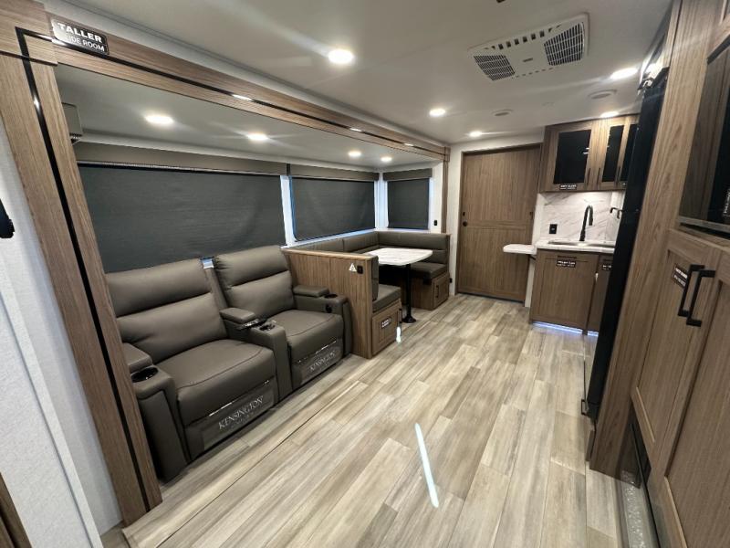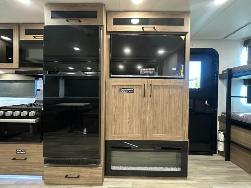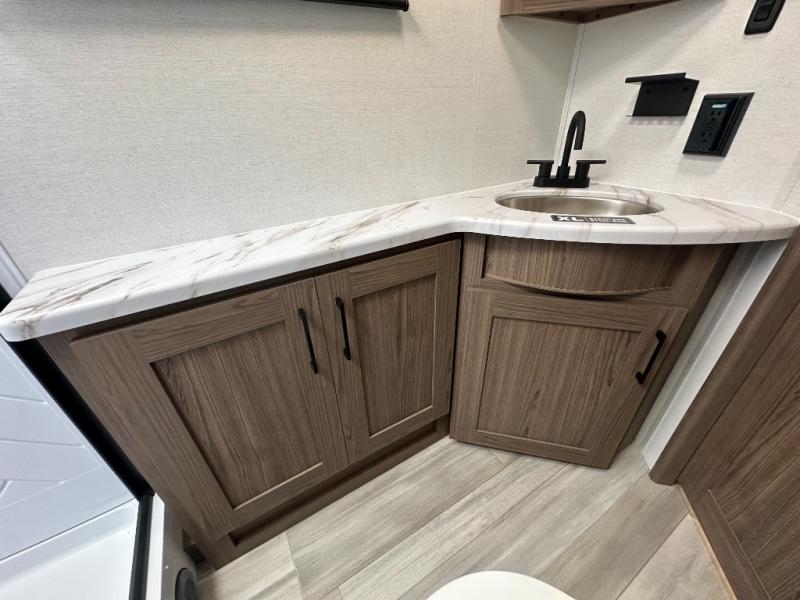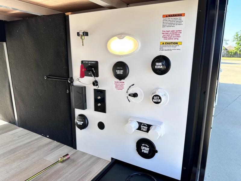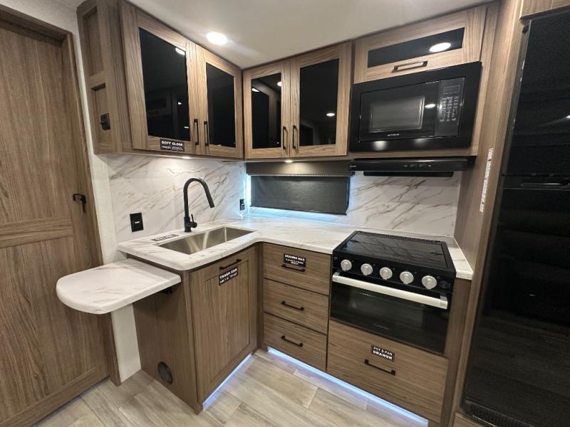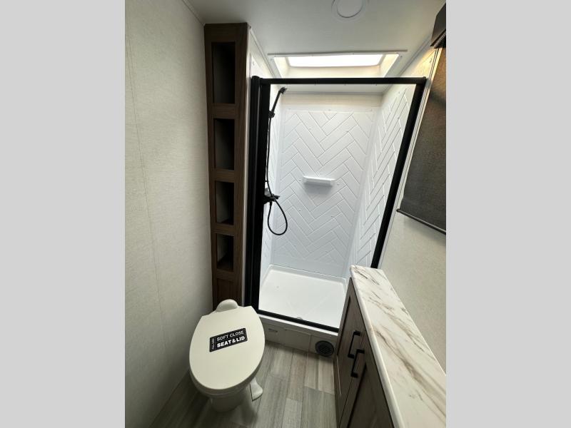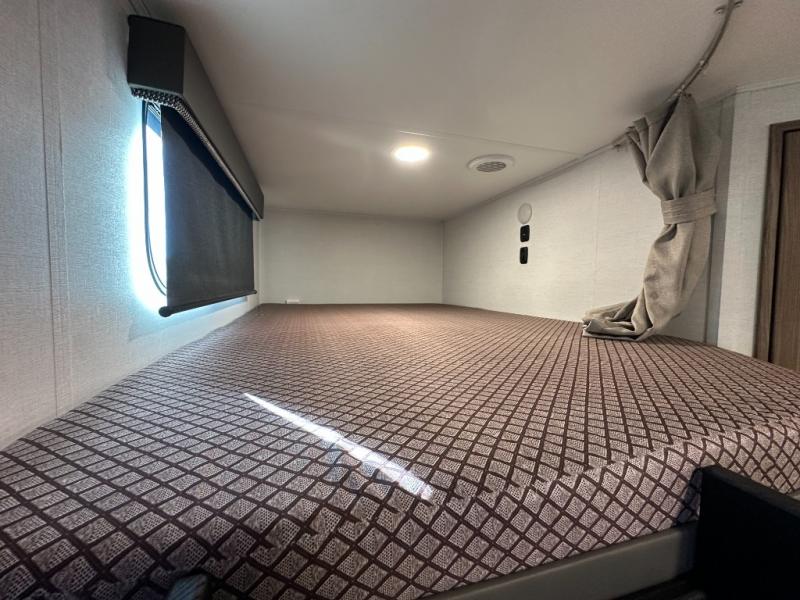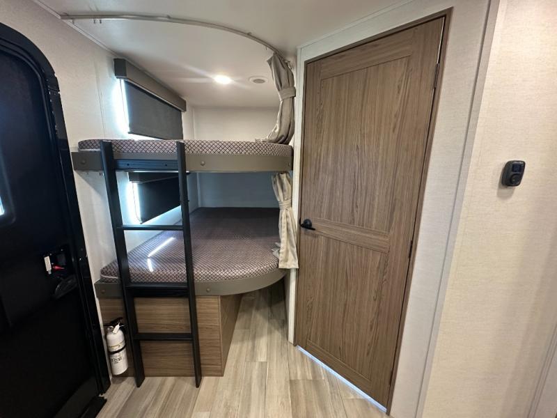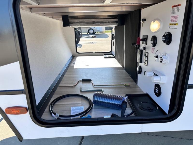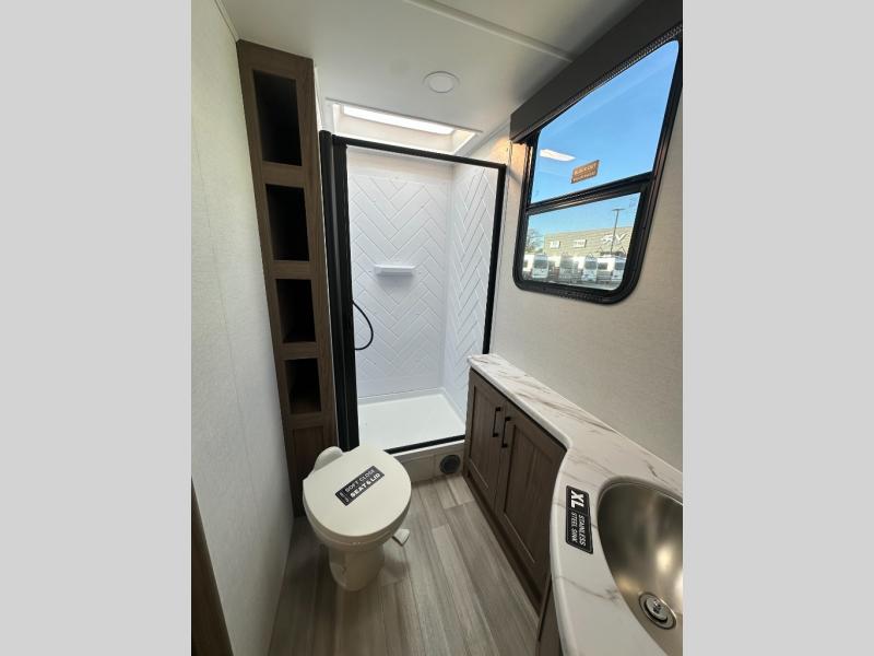 The perfect travel trailer for a larger family or one that enjoys traveling with friends! One large slide opens up the interior living space nice and features a U-shaped dinette and theater seating to provide plenty of seating for everyone. Enjoy the 40" HDTV opposite the seating for a movie indoors, and game night will be easy with everyone at the dinette which can also be converted for added sleeping if needed. The double entry doors will make loading and unloading simple, and allows you to easily slip in and out of the private bedroom for a morning walk. \You can easily prepare all of your favorite meals and snacks with the kitchen amenities provided inside. A three burner range allows you to easily cook indoors, or you can enjoy cooking outside using the outdoor griddle/grill if you like. There is a 10 cu. ft. 12V refrigerator to keep all of your perishables and drinks nice and cold, plus a large sink for dishes and cleaning up, and there is also a flip-up counter extension for more prep space. You will also appreciate the rear corner bath featuring a 30" x 36" shower, vanity with sink, soft close porcelain toilet with foot flush, and linen cabinet for your towels.