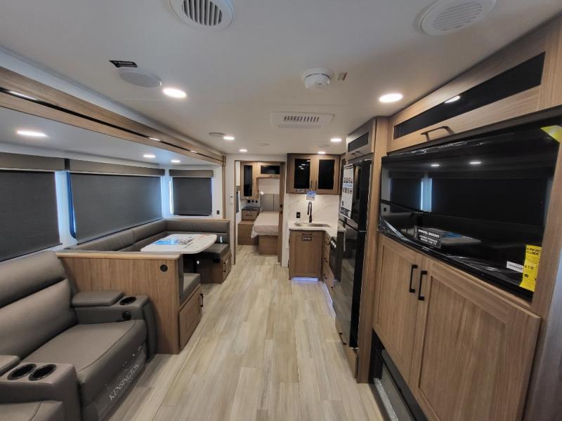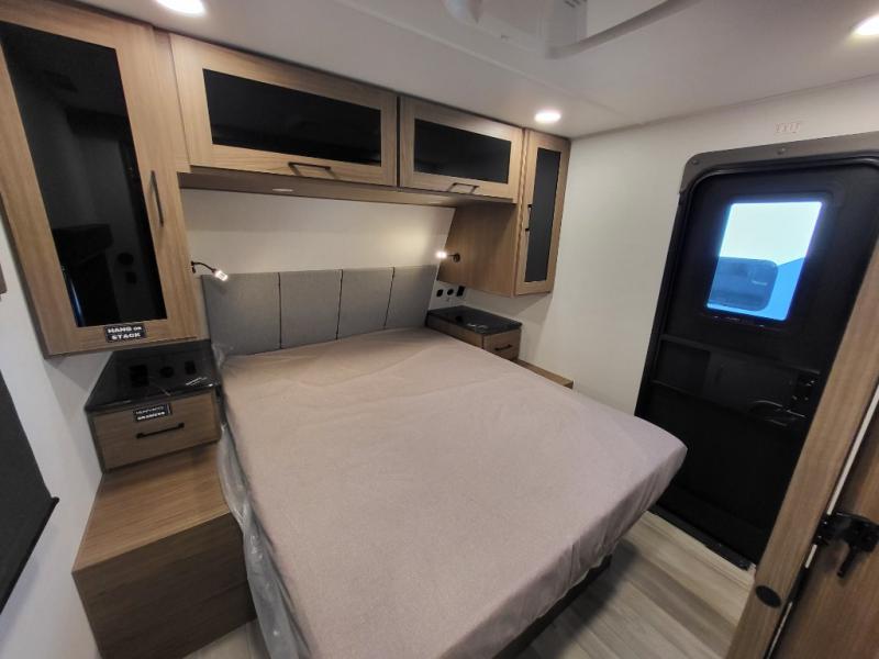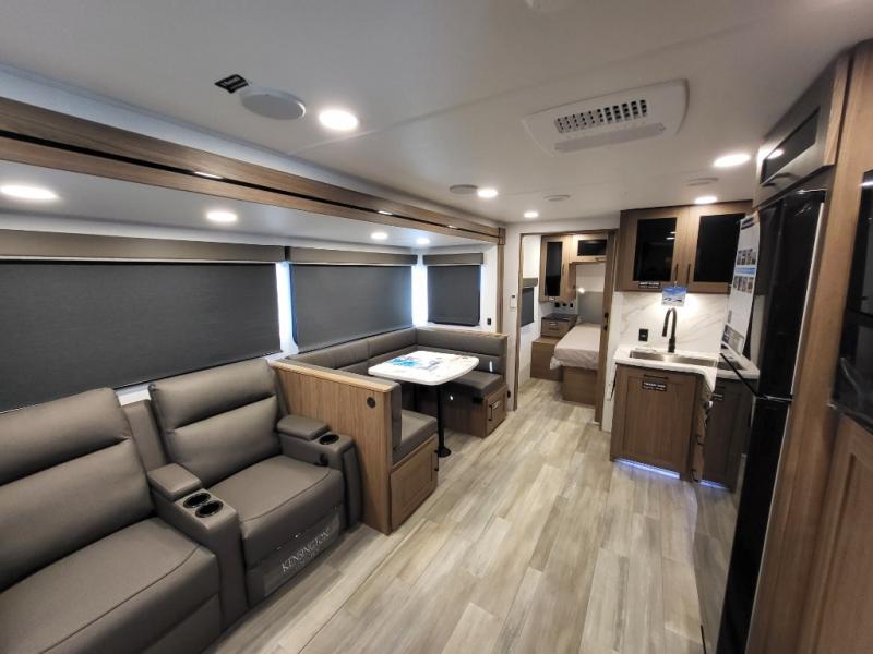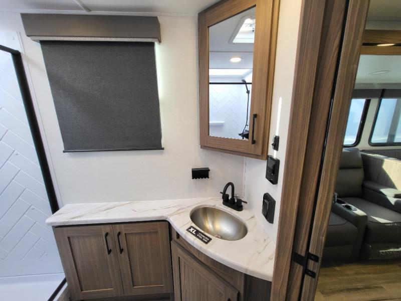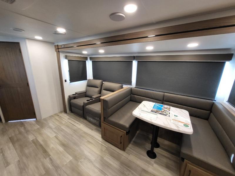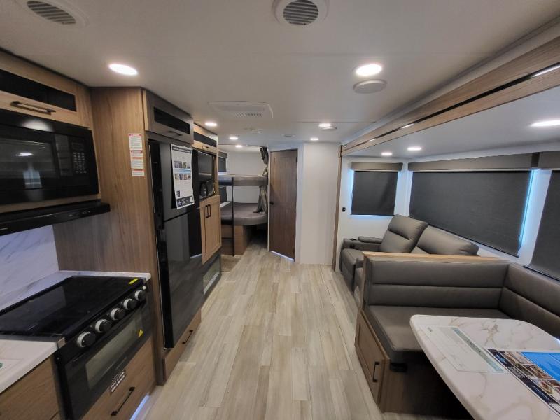 The perfect travel trailer for a larger family or one that enjoys traveling with friends! One large slide opens up the interior living space nice and features a U-shaped dinette and theater seating to provide plenty of seating for everyone. Enjoy the 40" HDTV opposite the seating for a movie indoors, and game night will be easy with everyone at the dinette which can also be converted for added sleeping if needed. The double entry doors will make loading and unloading simple, and allows you to easily slip in and out of the private bedroom for a morning walk. You can easily prepare all of your favorite meals and snacks with the kitchen amenities provided inside. A three burner range allows you to easily cook indoors, or you can enjoy cooking outside using the outdoor griddle/grill if you like. There is a 10 cu. ft. 12V refrigerator to keep all of your perishables and drinks nice and cold, plus a large sink for dishes and cleaning up, and there is also a flip-up counter extension for more prep space. You will also appreciate the rear corner bath featuring a 30" x 36" shower, vanity with sink, soft close porcelain toilet with foot flush, and linen cabinet for your towels.